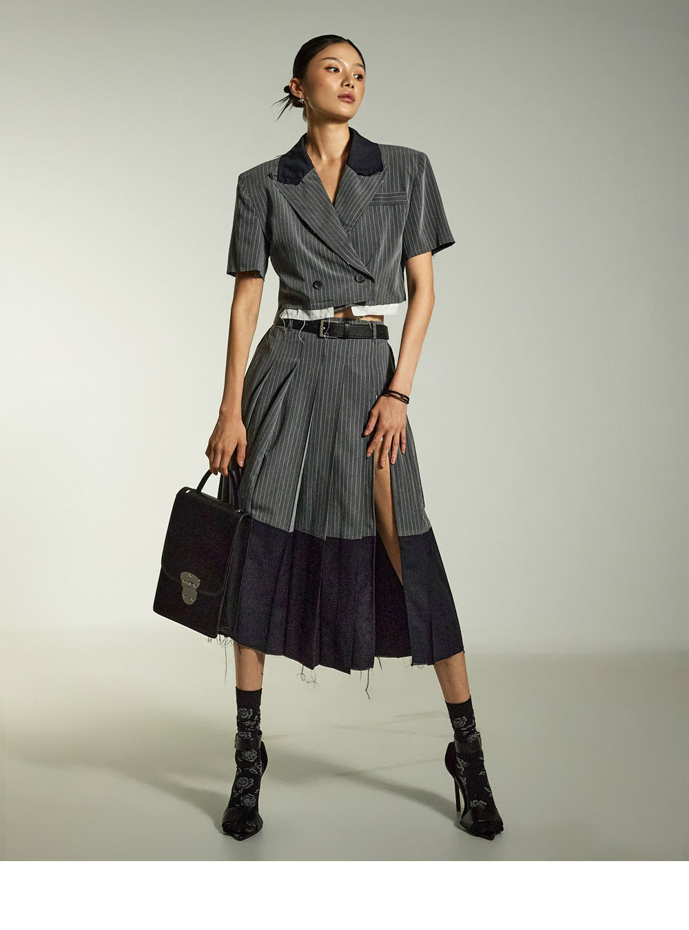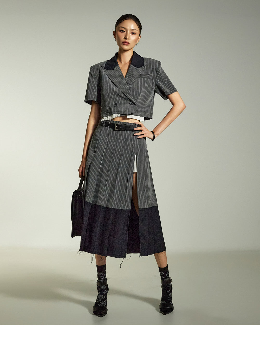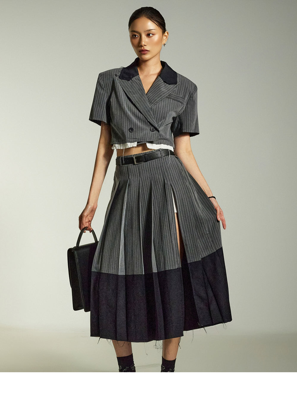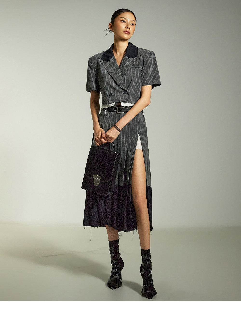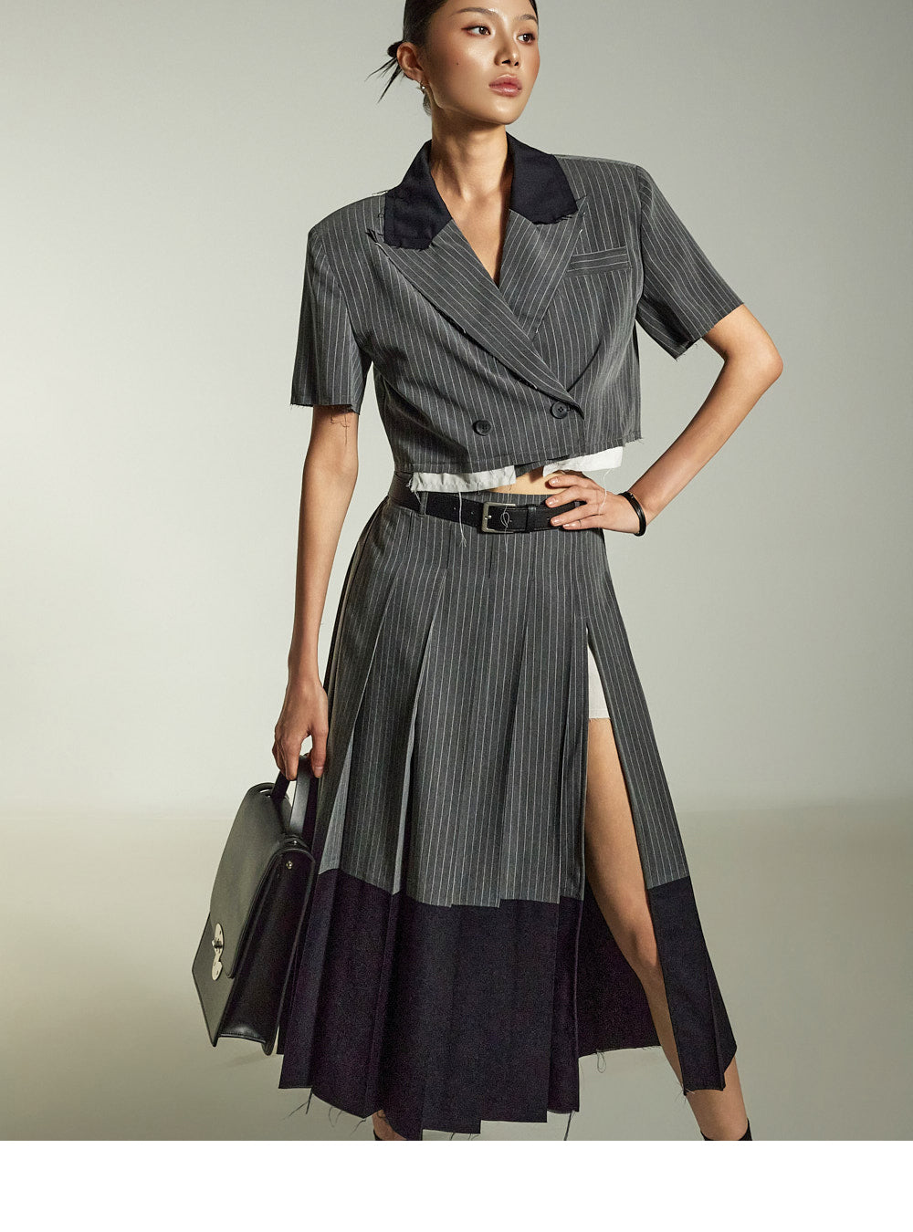 Raw-edge details combined with a deep front slit
