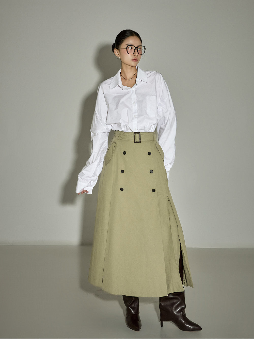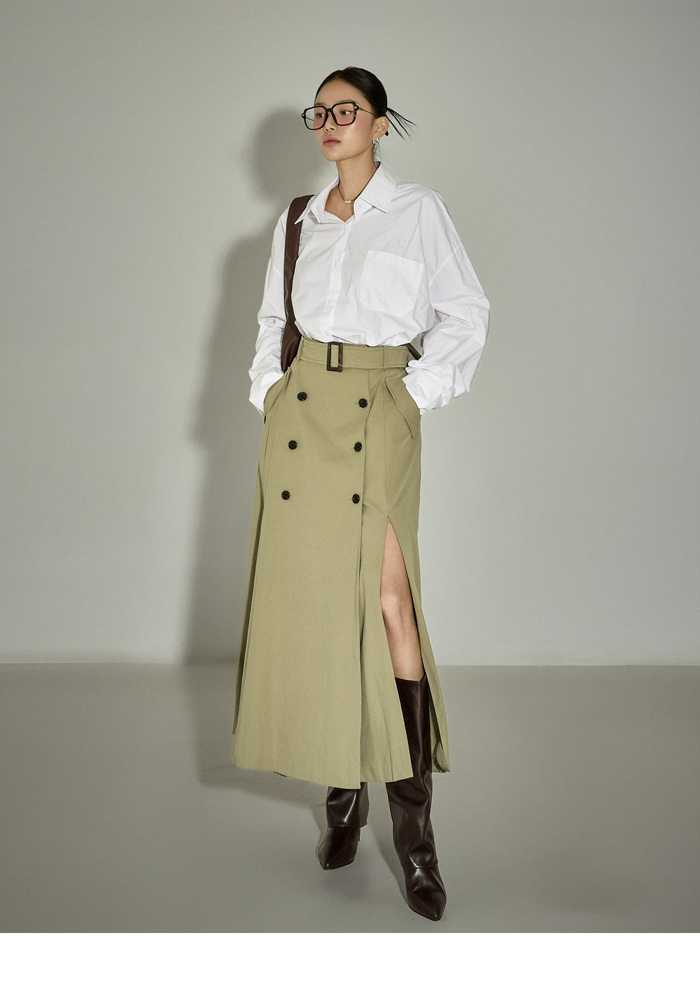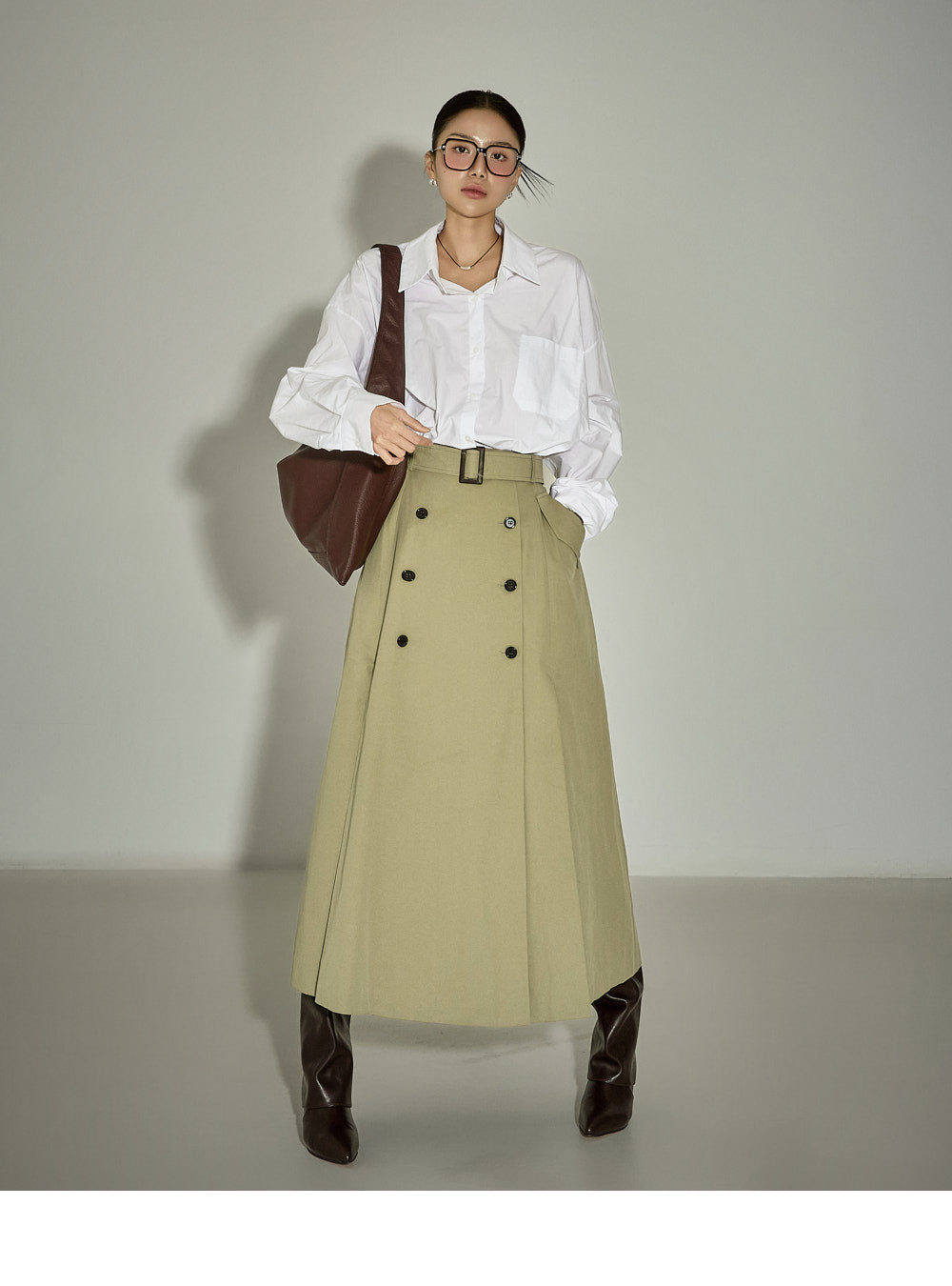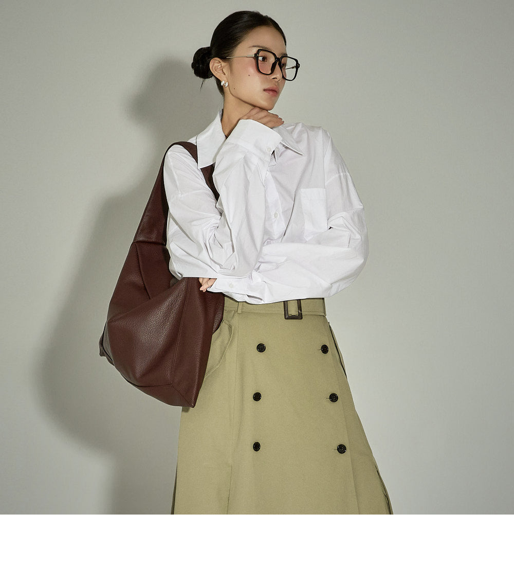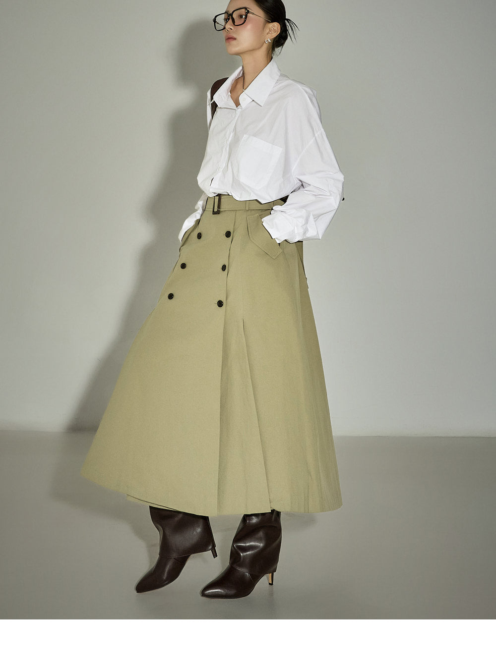 This belt set trench skirt exudes a casual vibe.