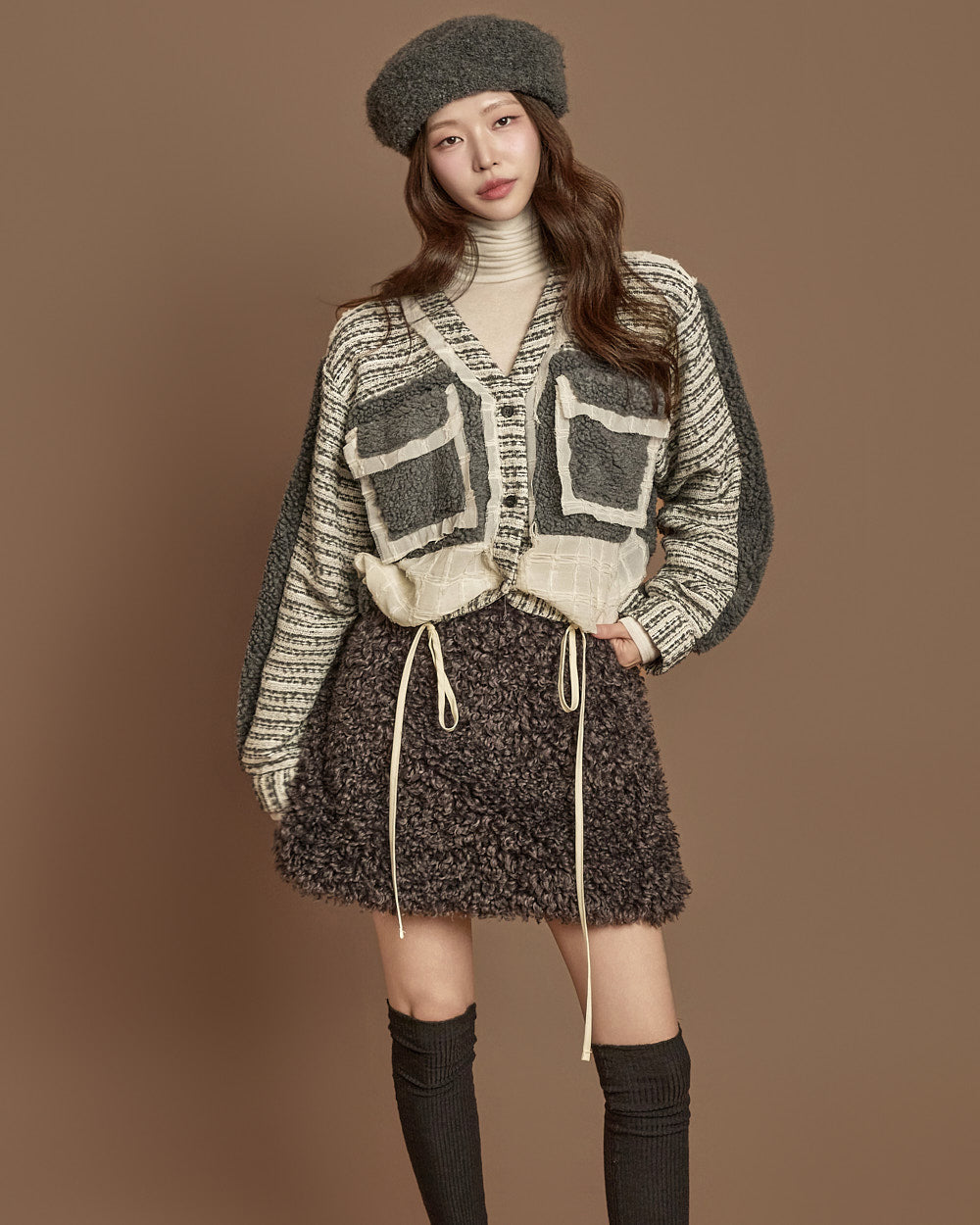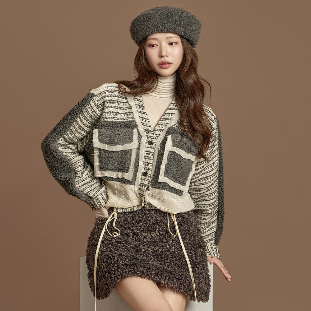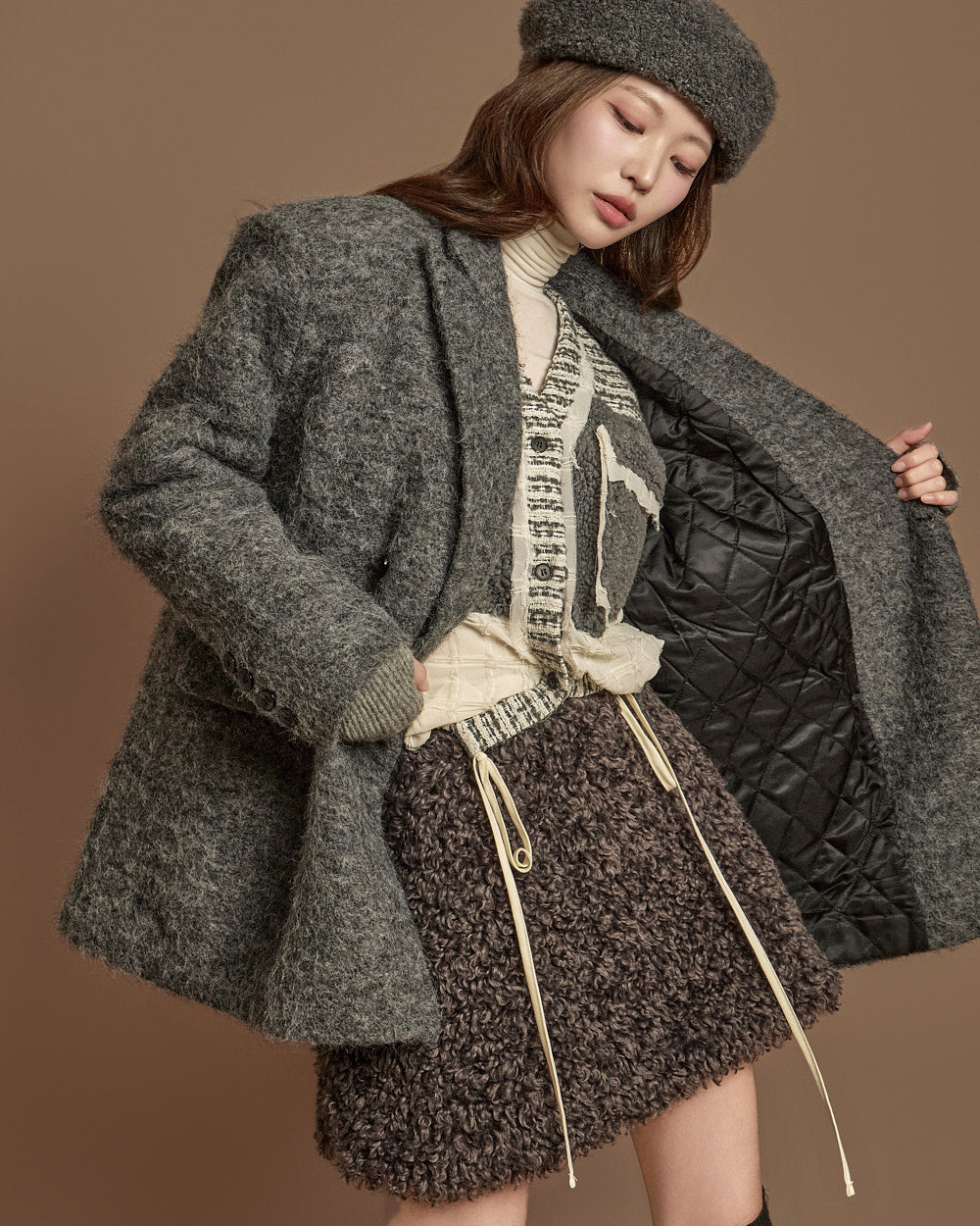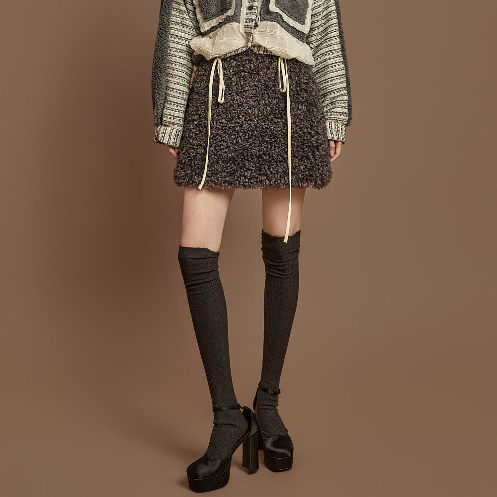 This boucle mini skirt exudes a cozy and lovely mood.