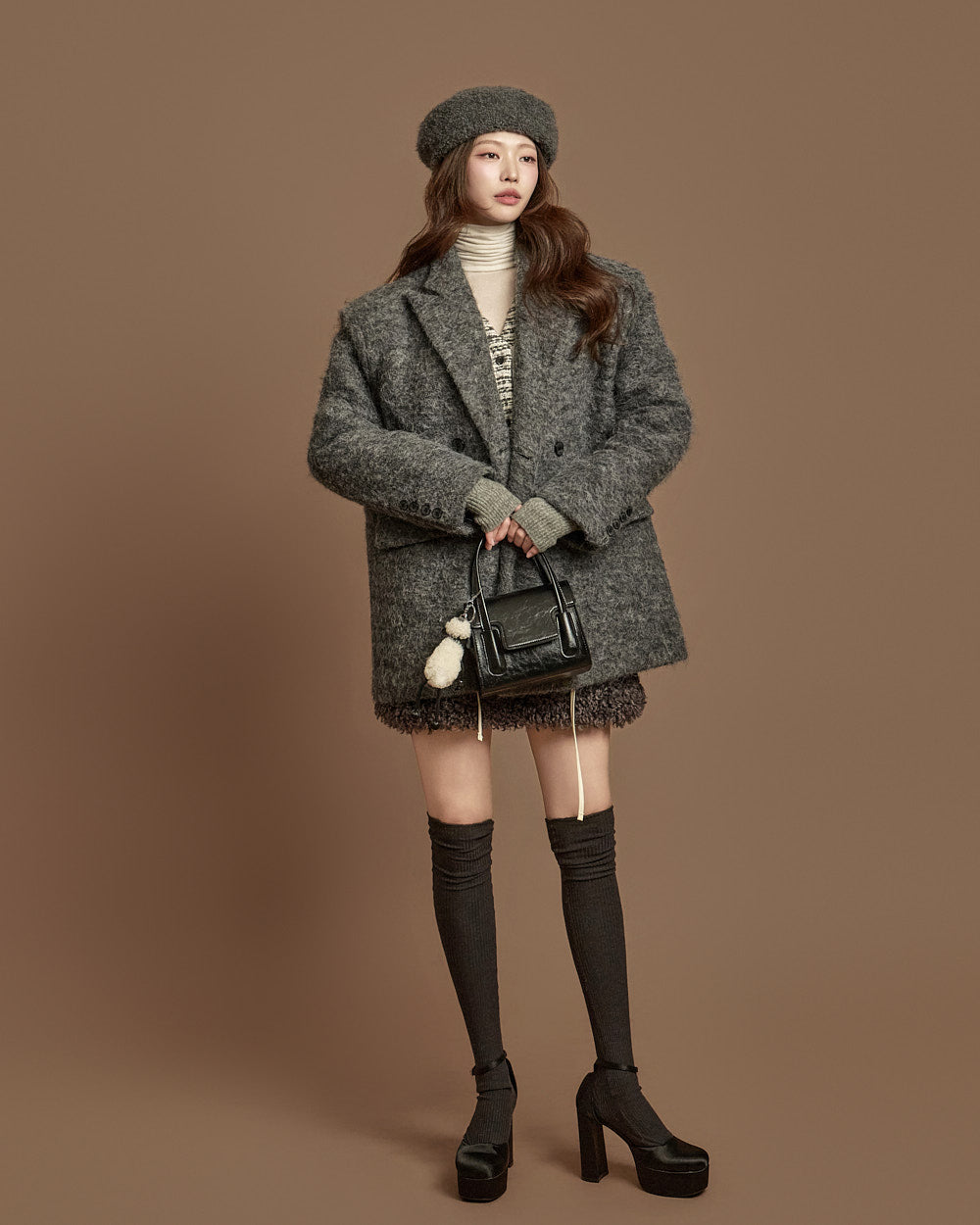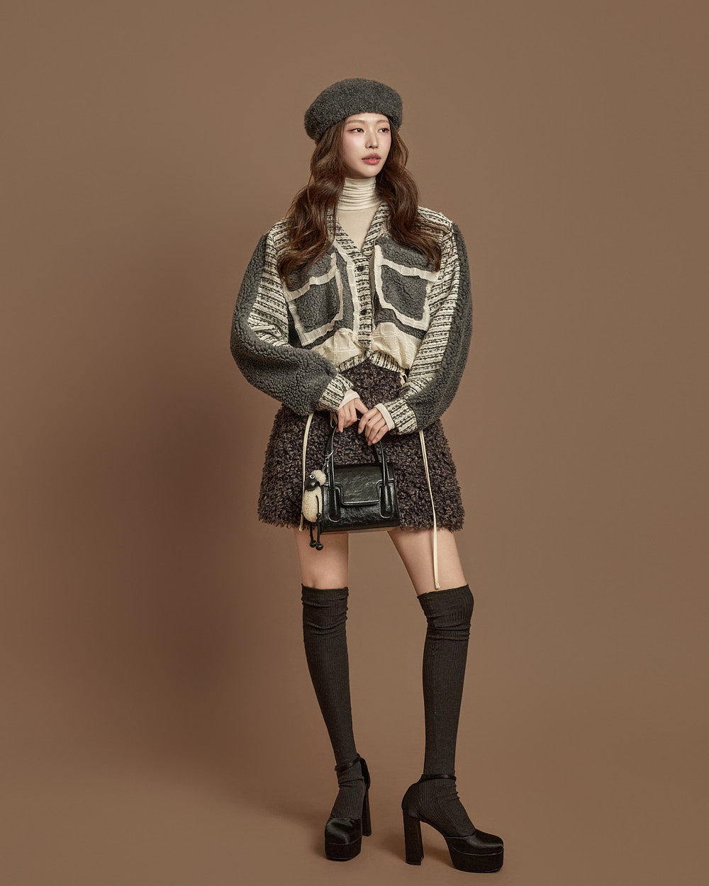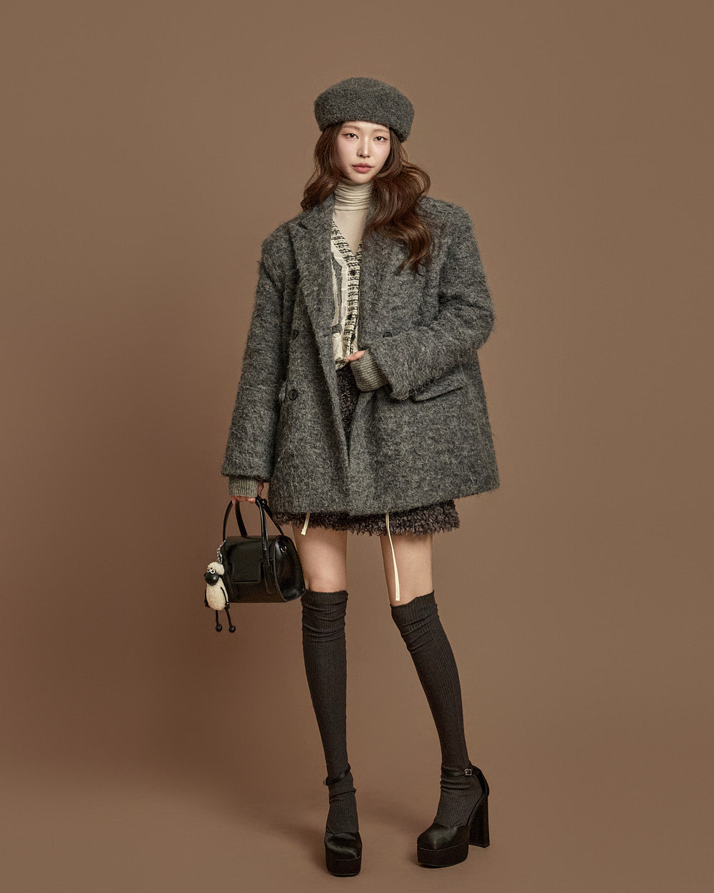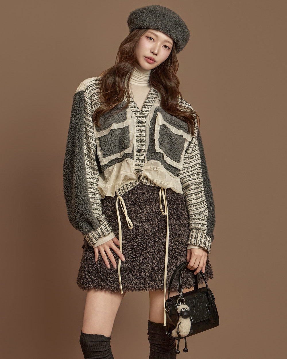 This boucle mini skirt exudes a cozy and lovely mood.