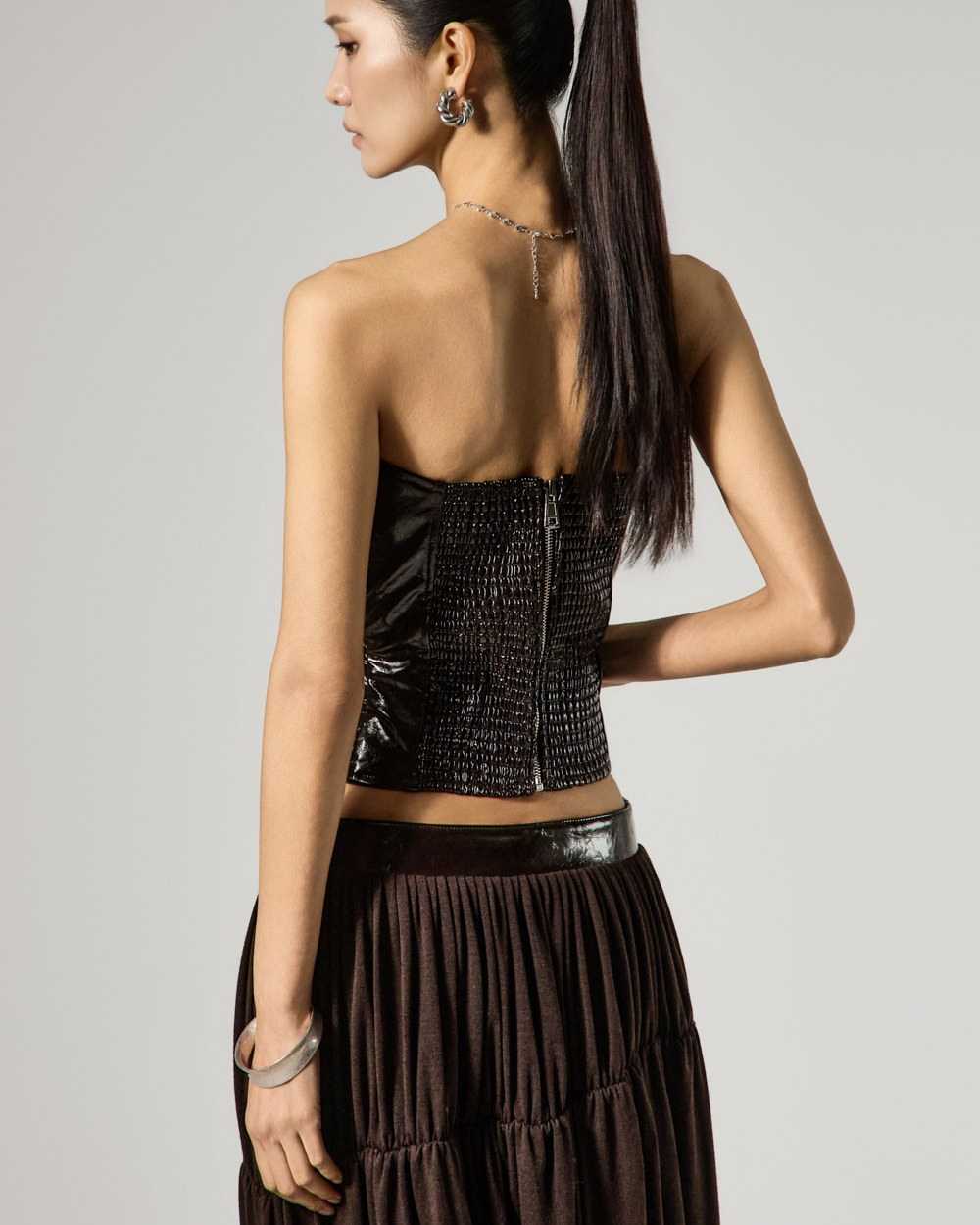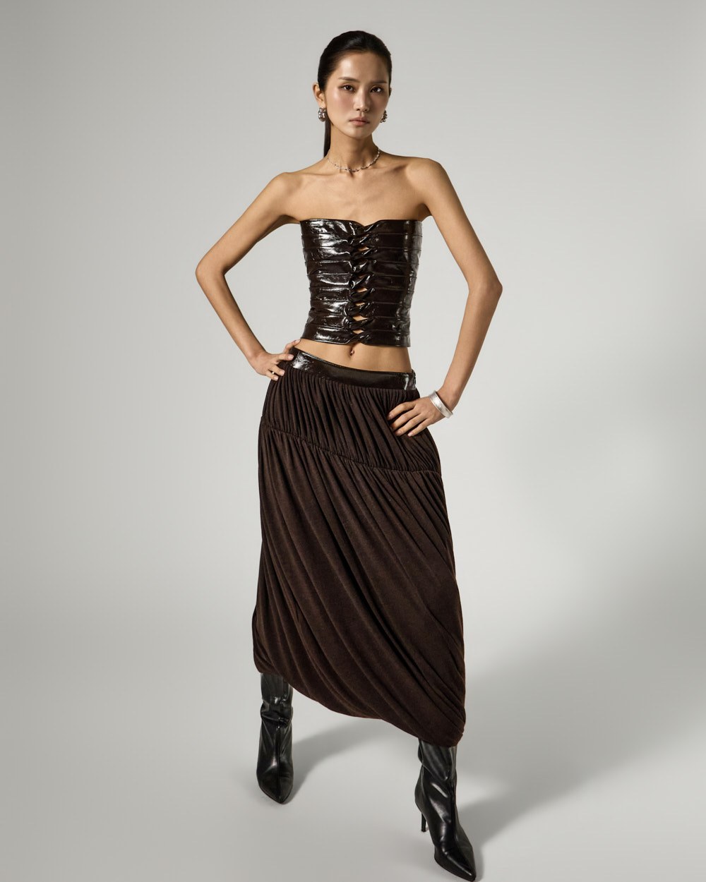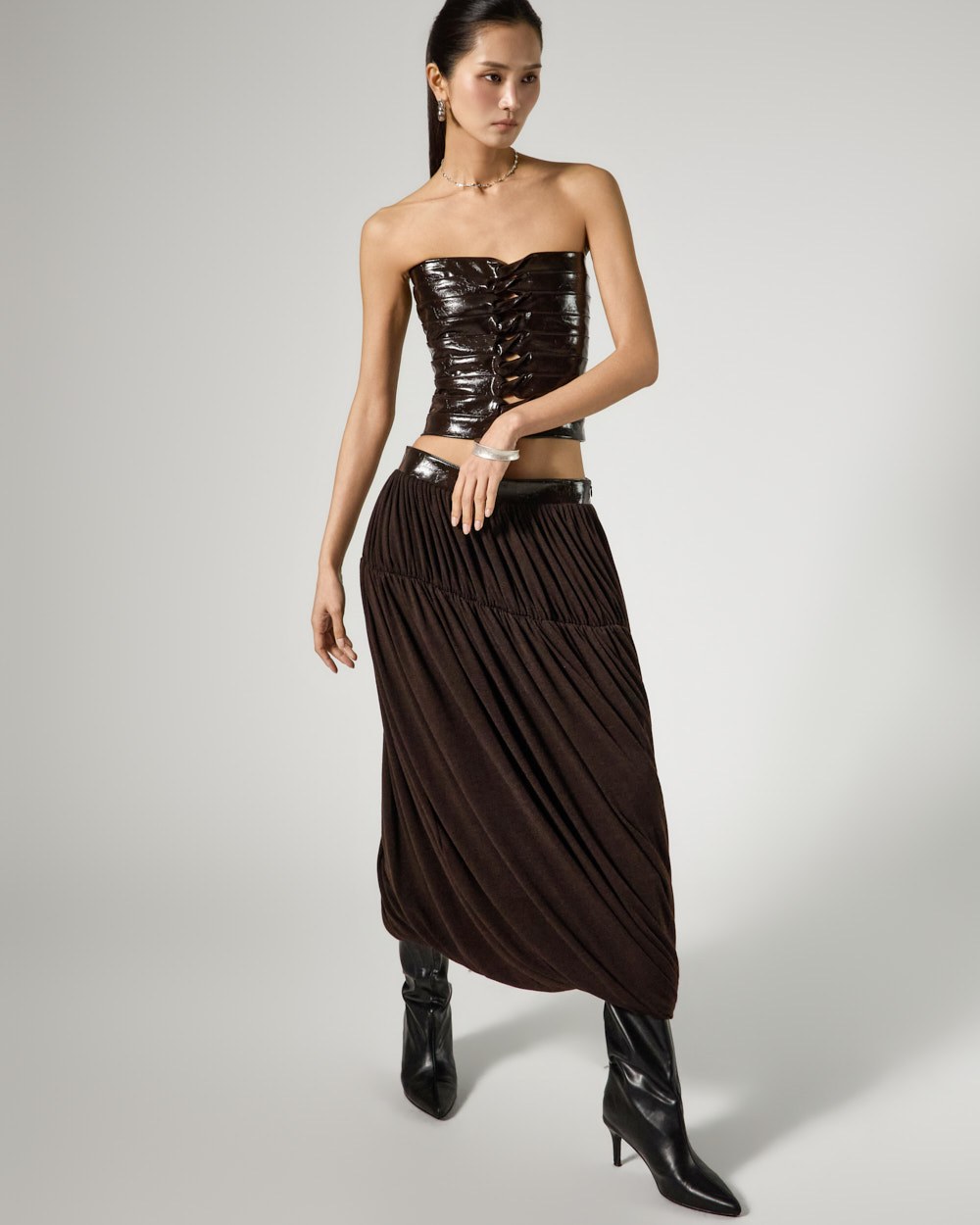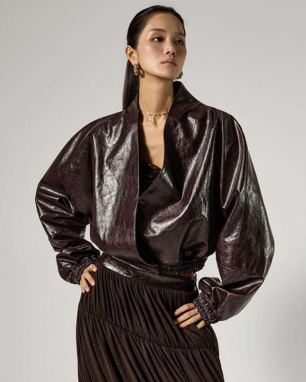 Model is 173cm tall and is wearing size S in DARK BROWN.