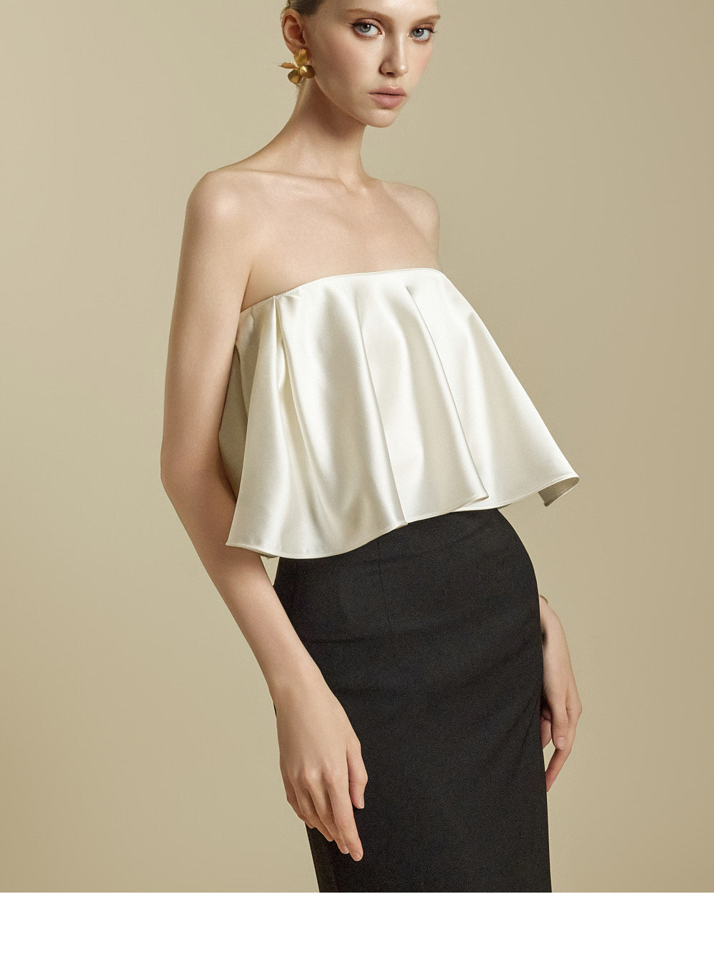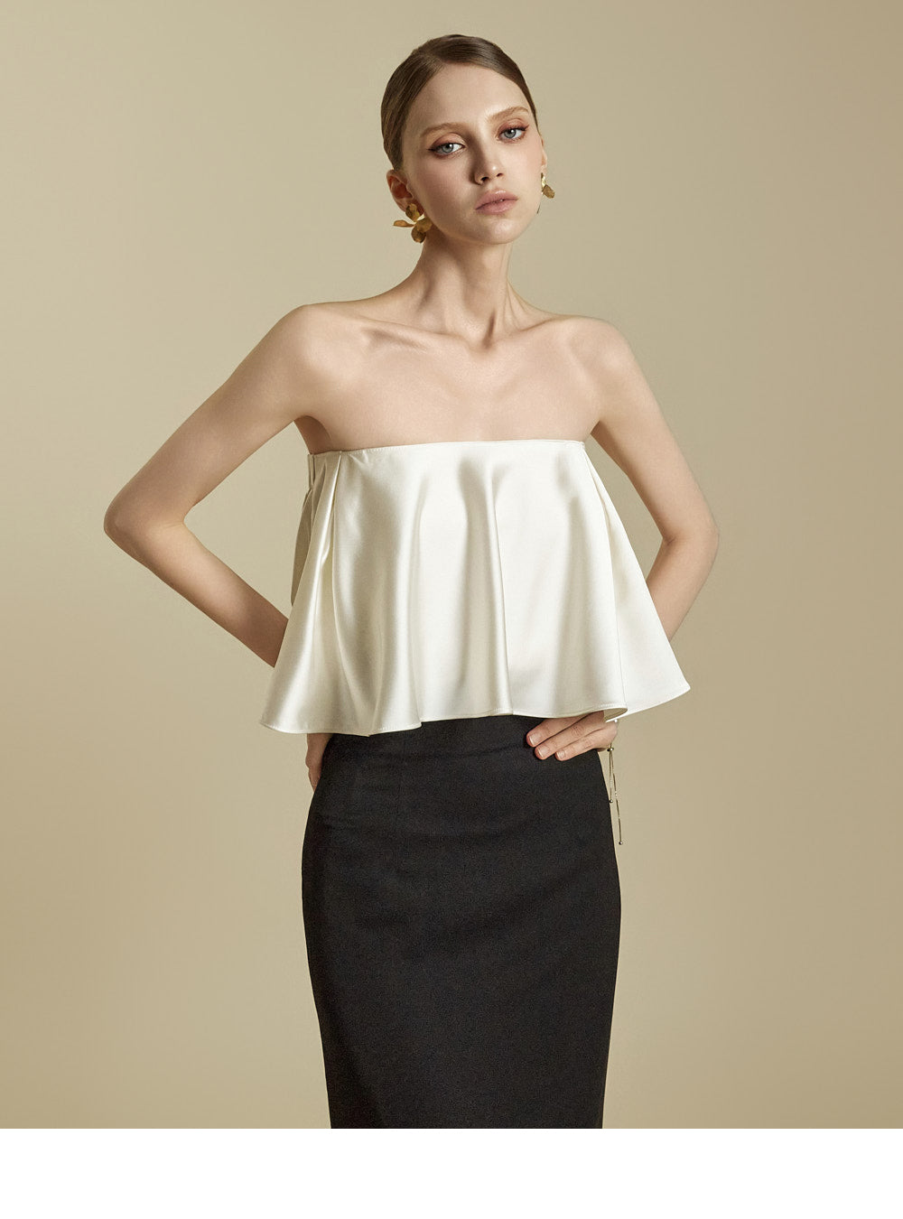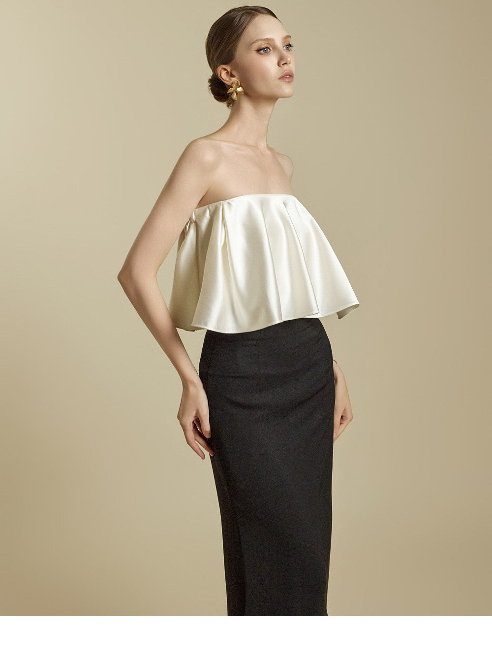 The high-waisted design and slim fit gently shape the waist and hip lines,