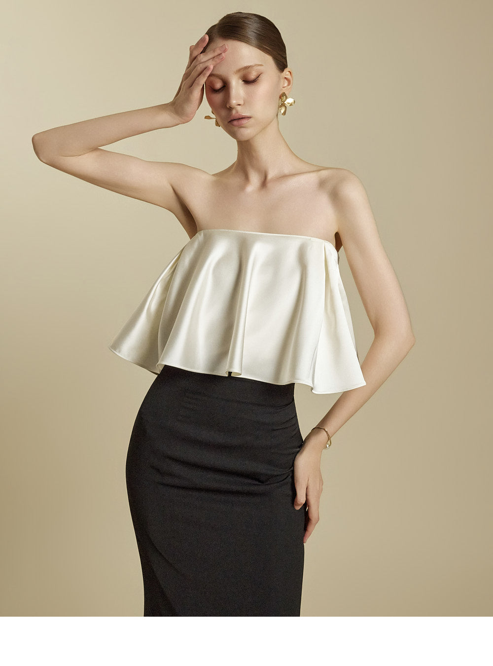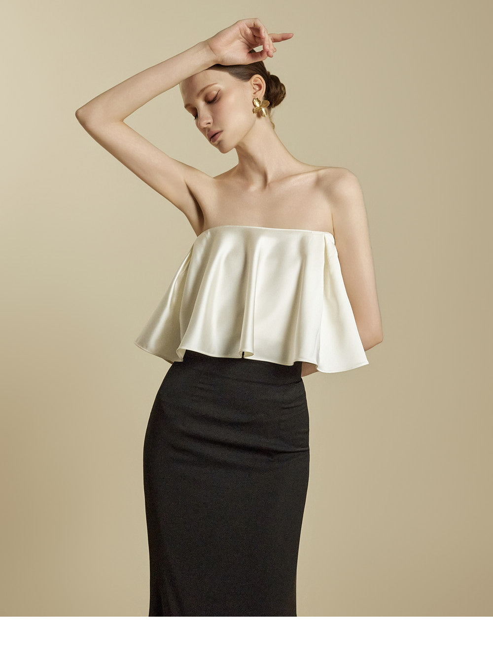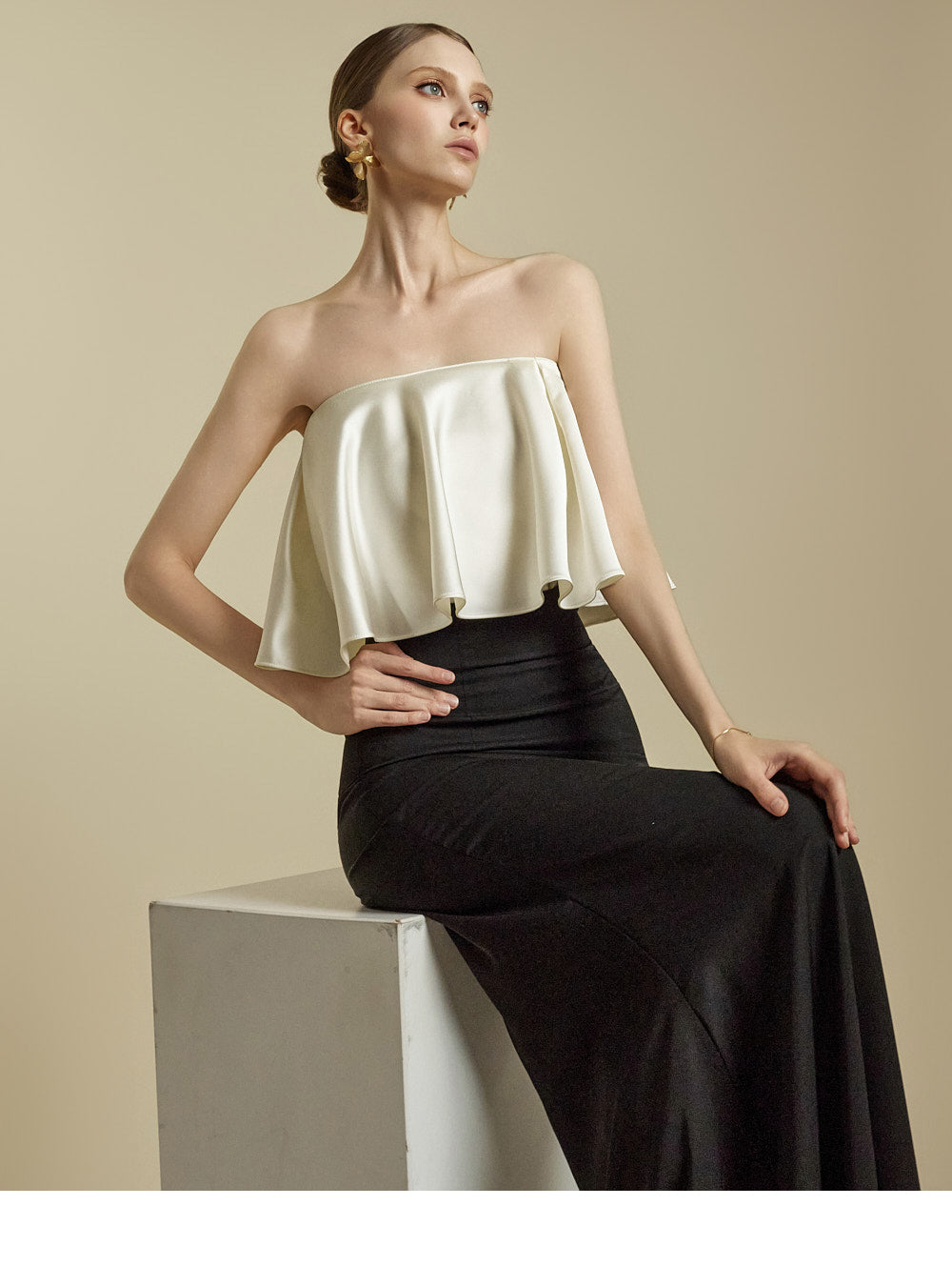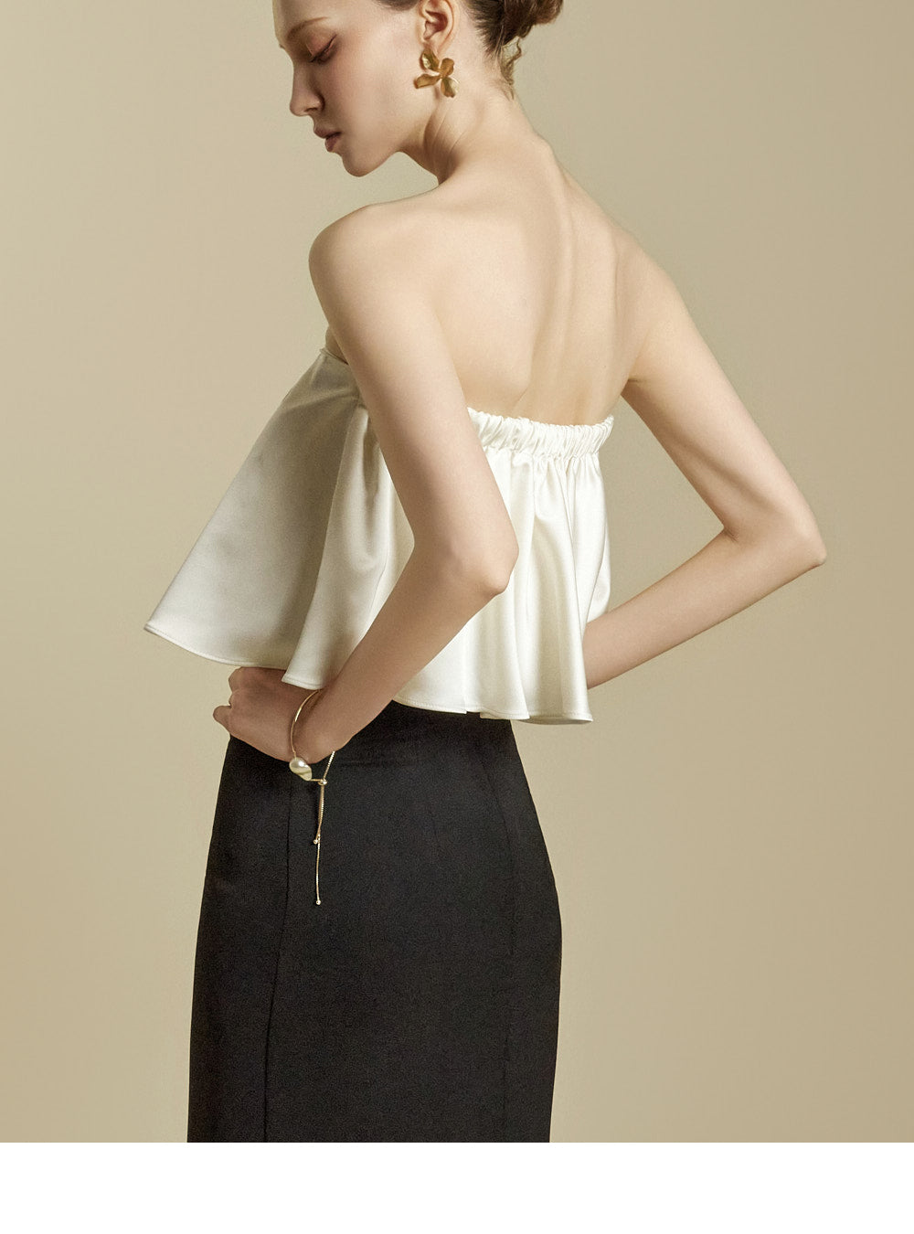 The high-waisted design and slim fit gently shape the waist and hip lines,