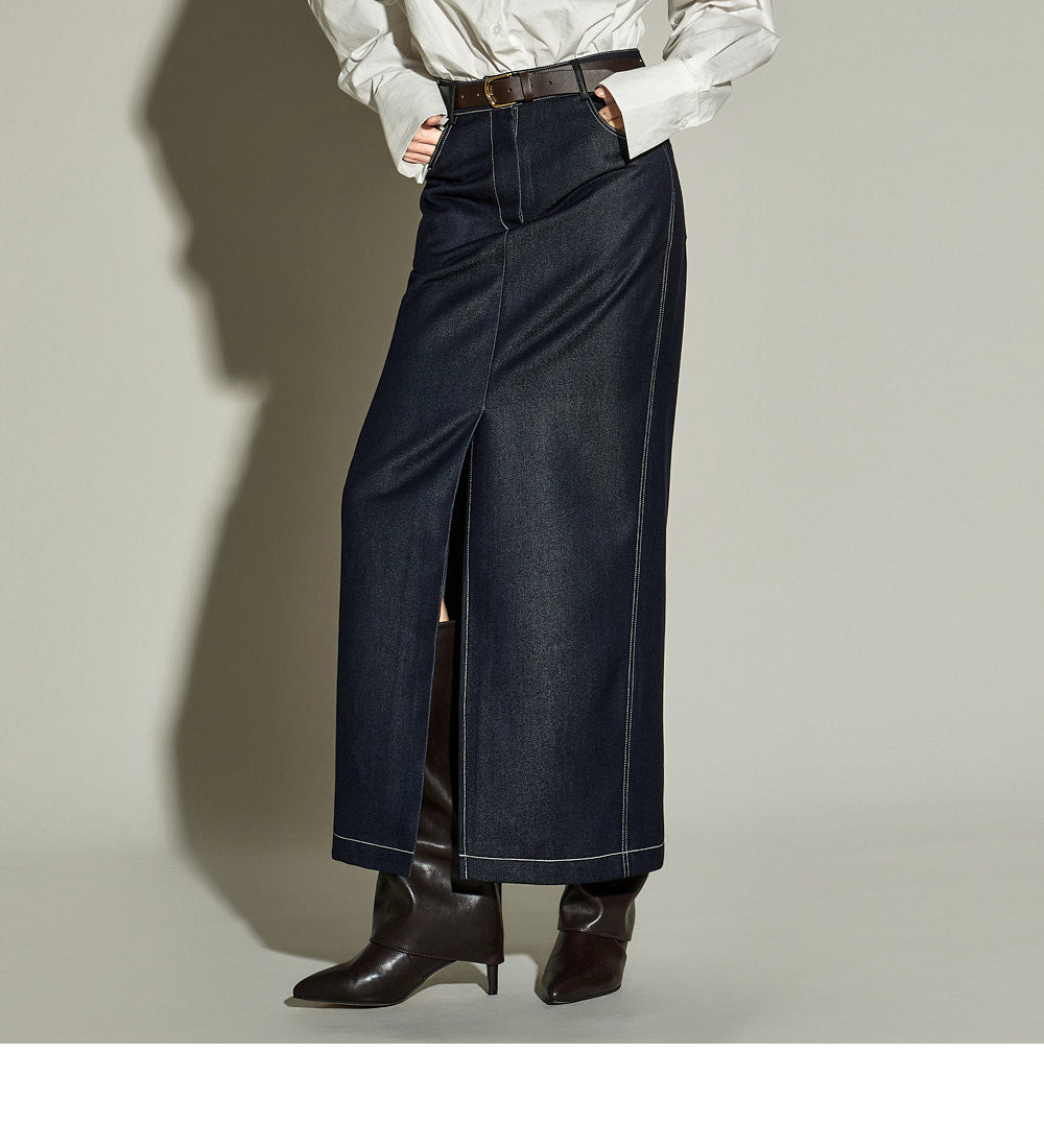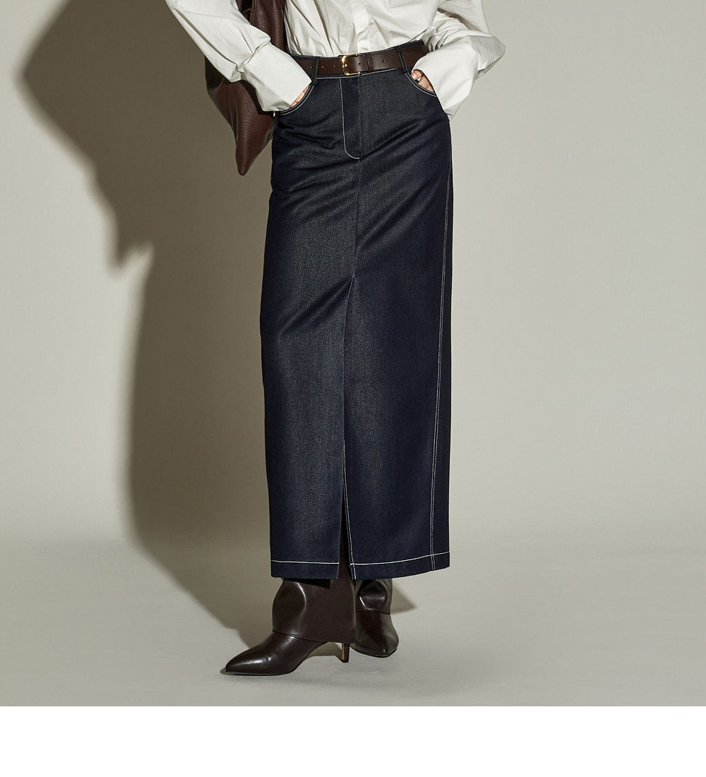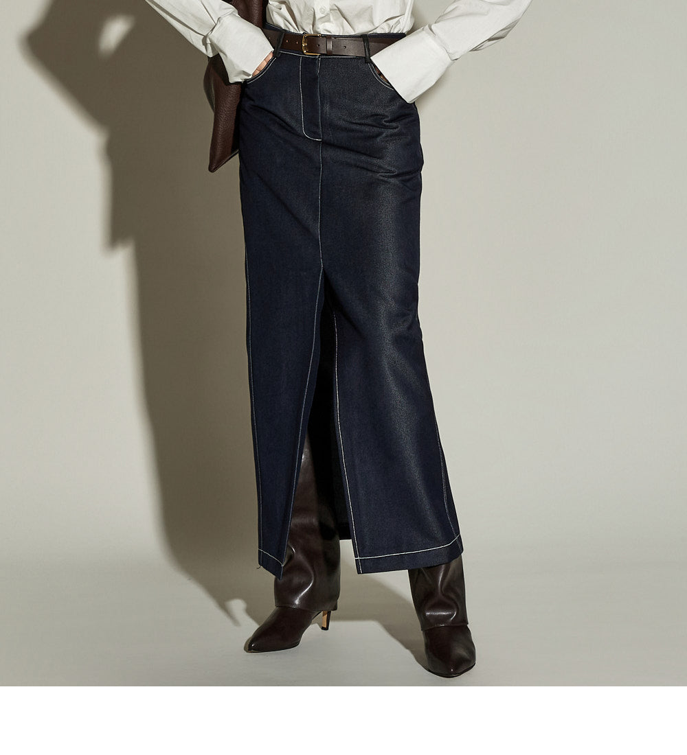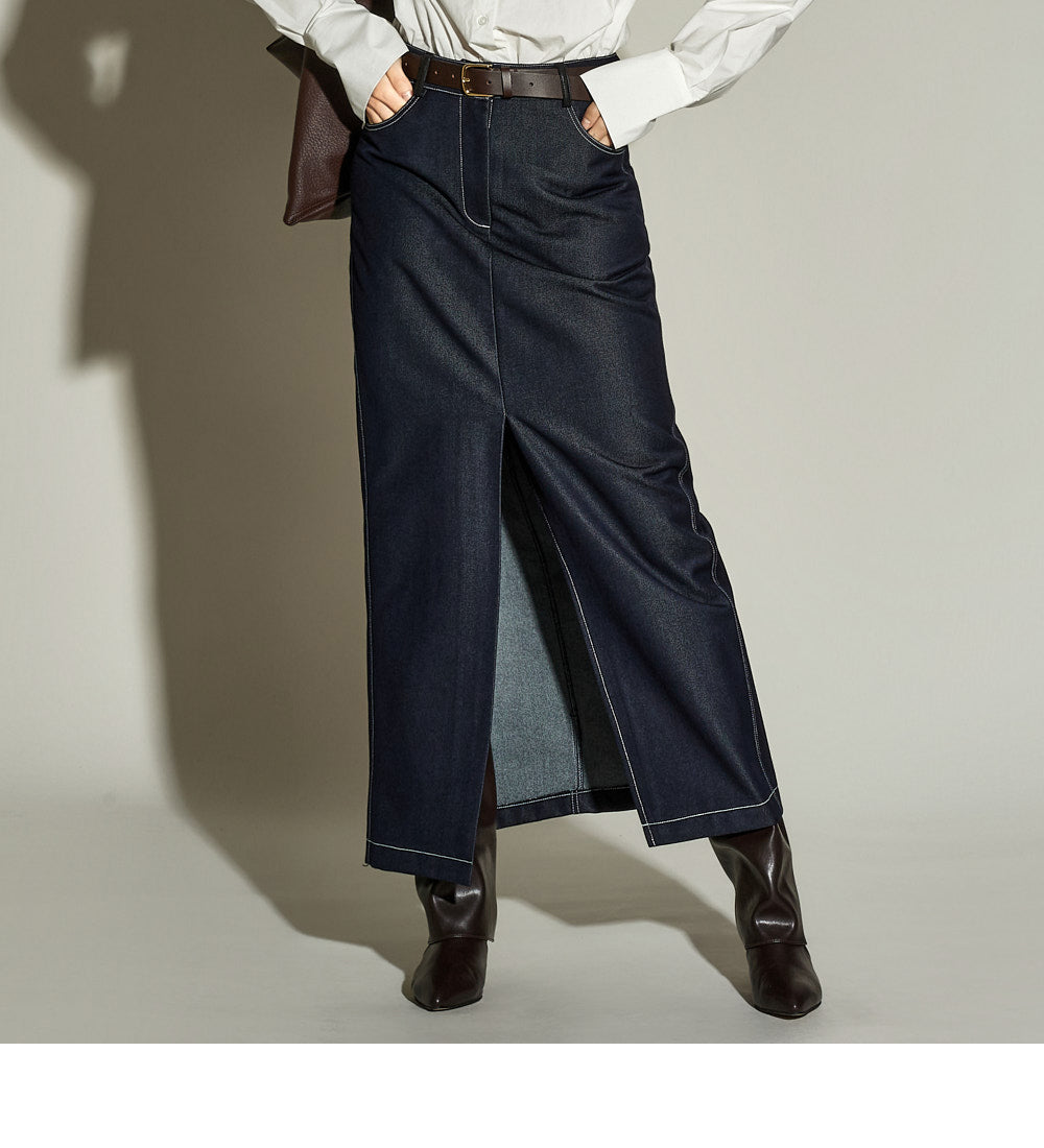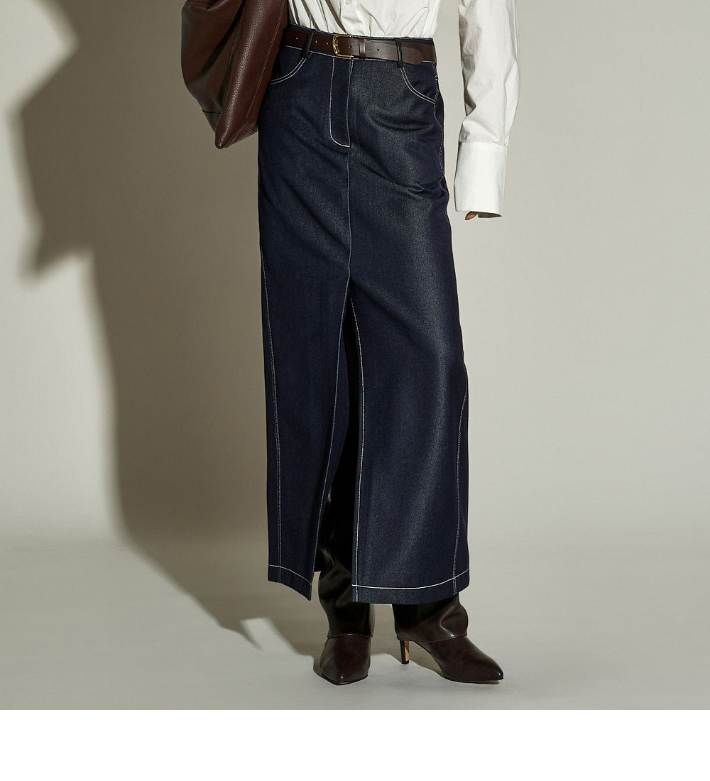 The stitched detailing and front slit are key features,