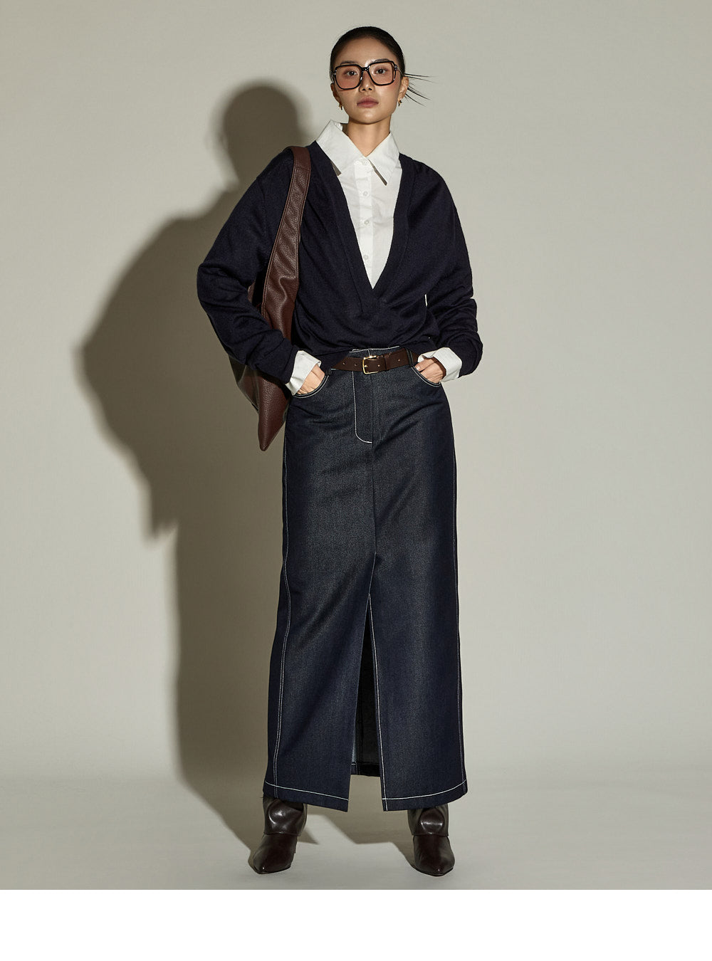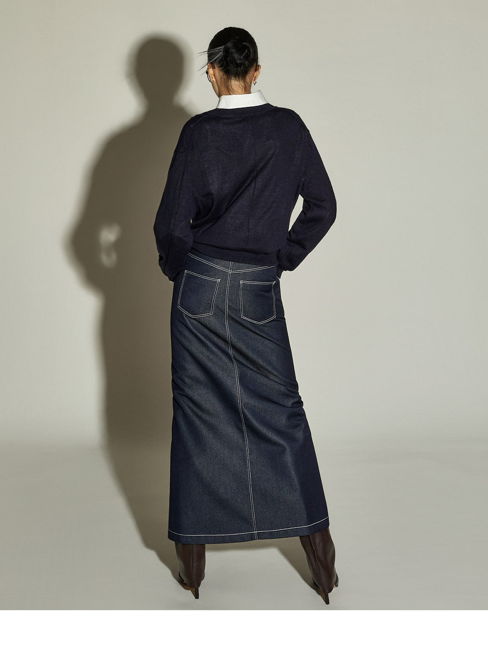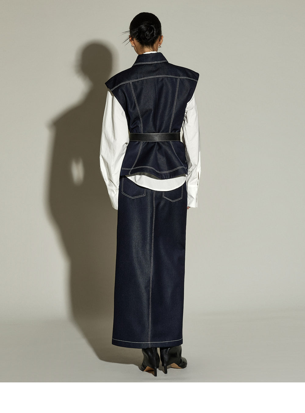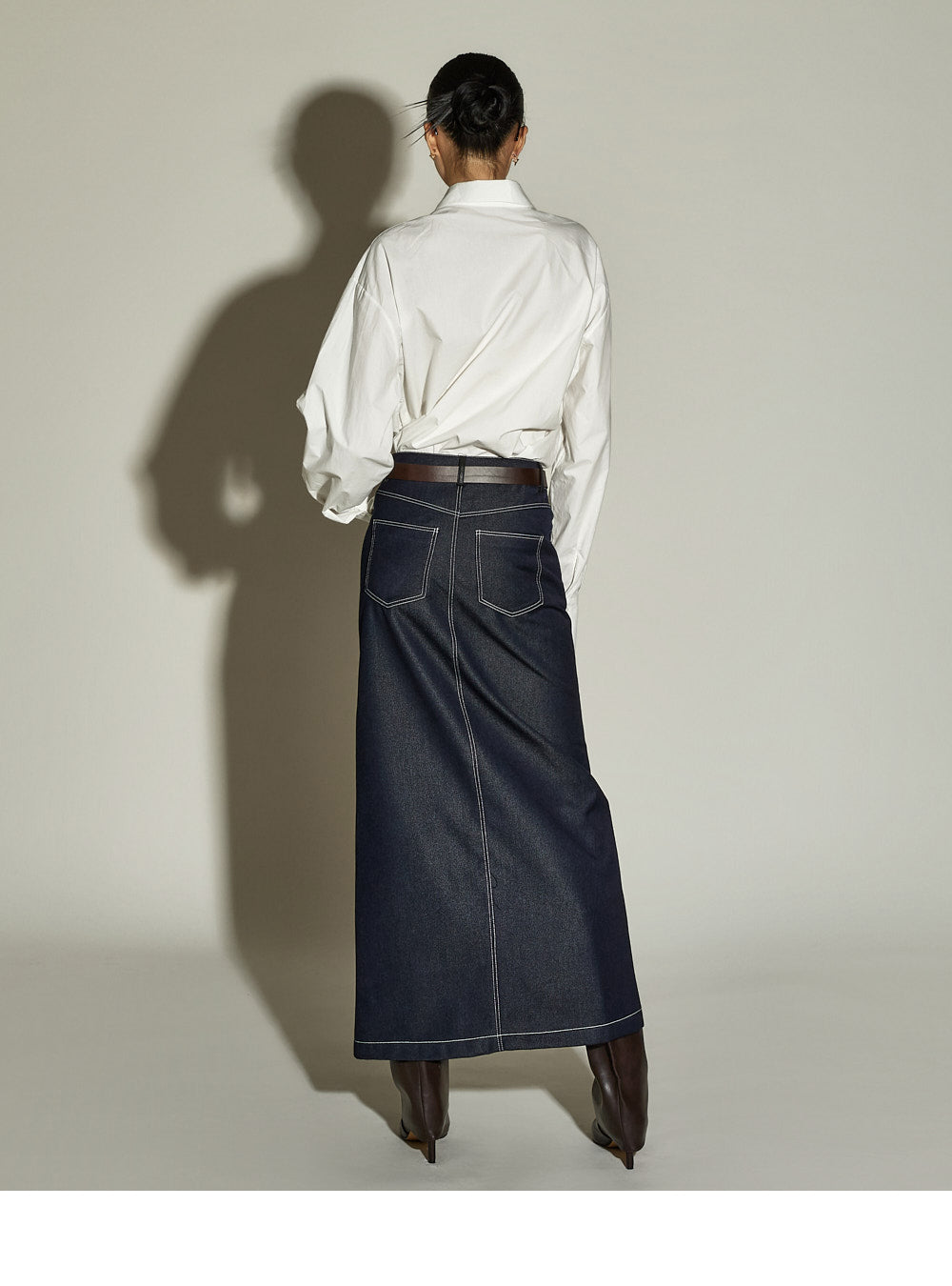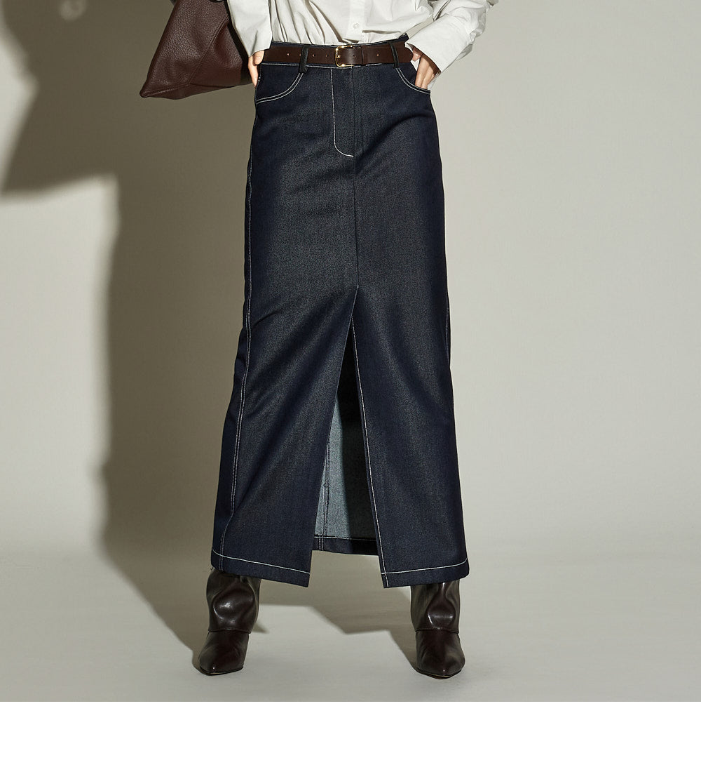 The stitched detailing and front slit are key features,