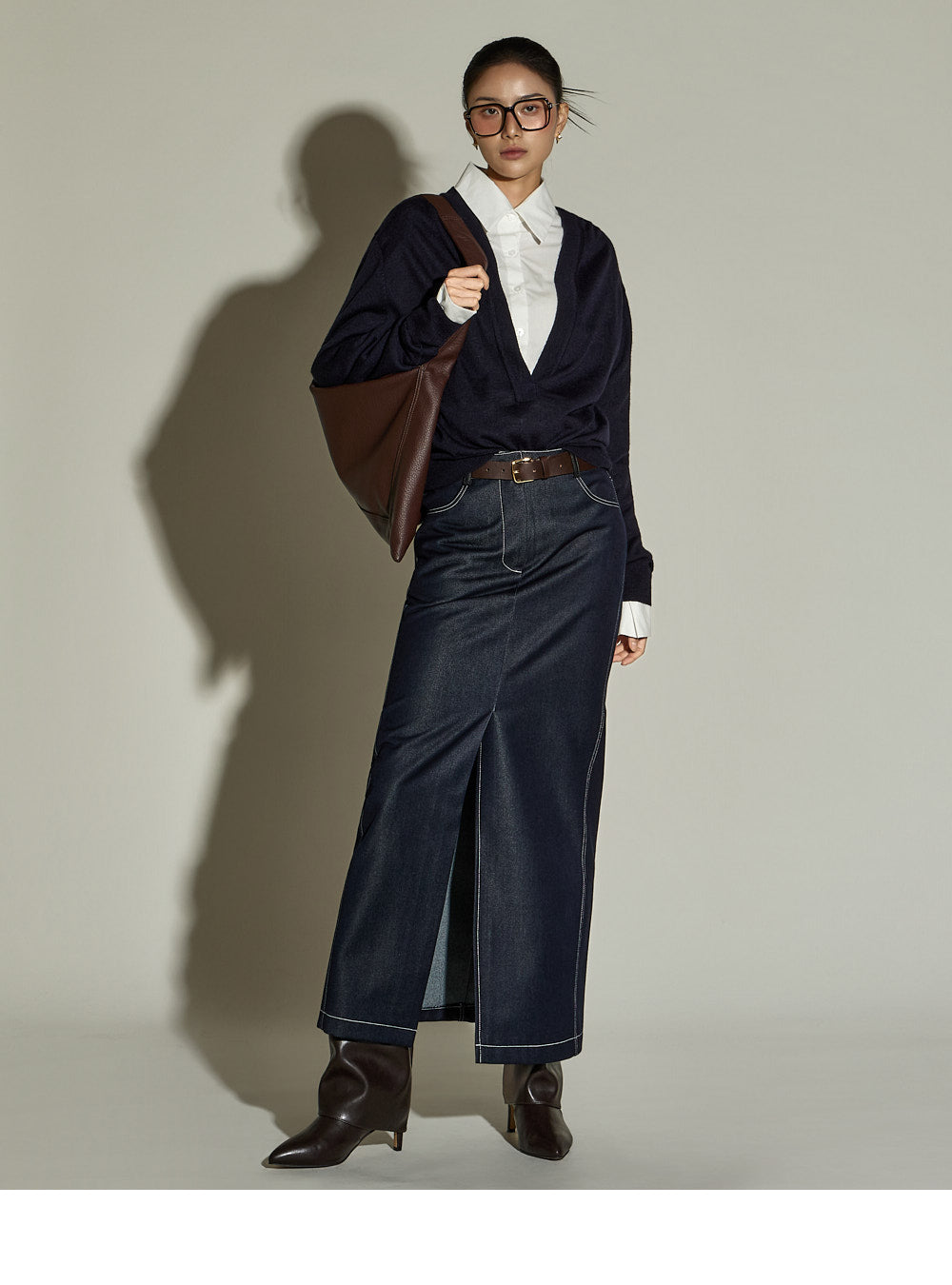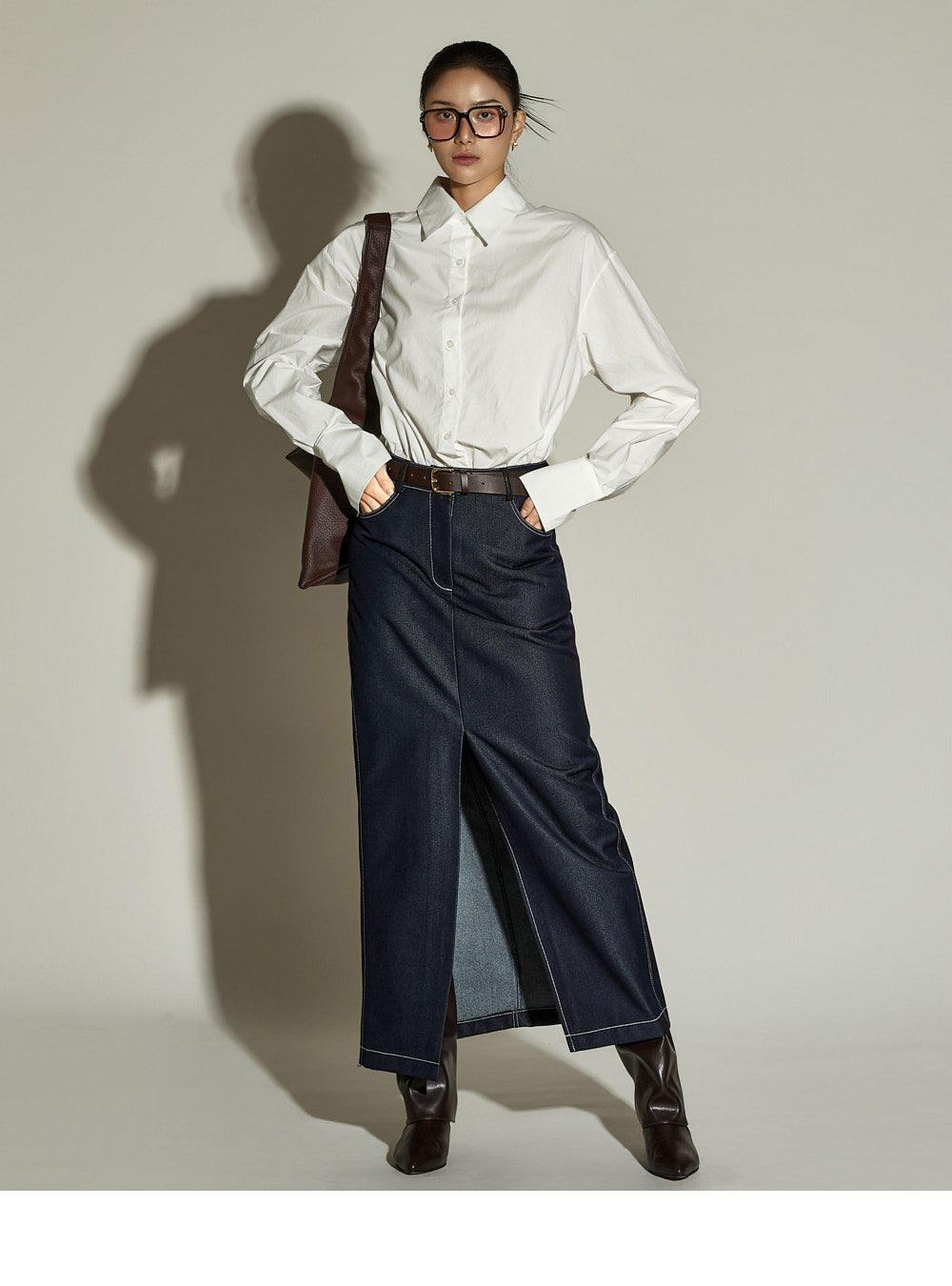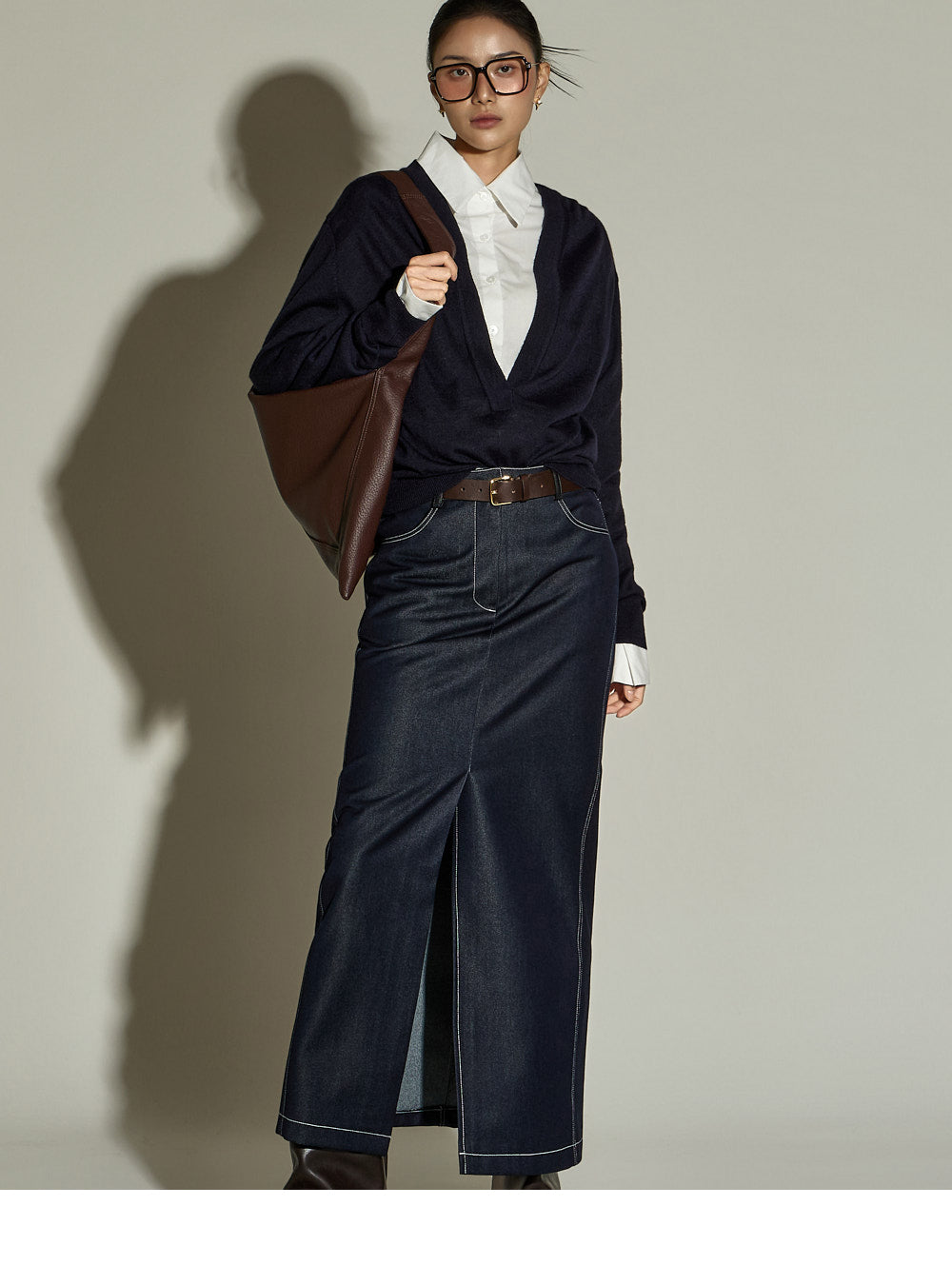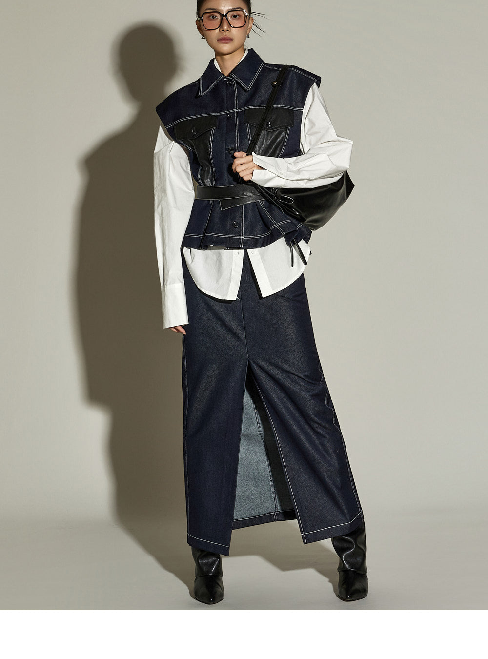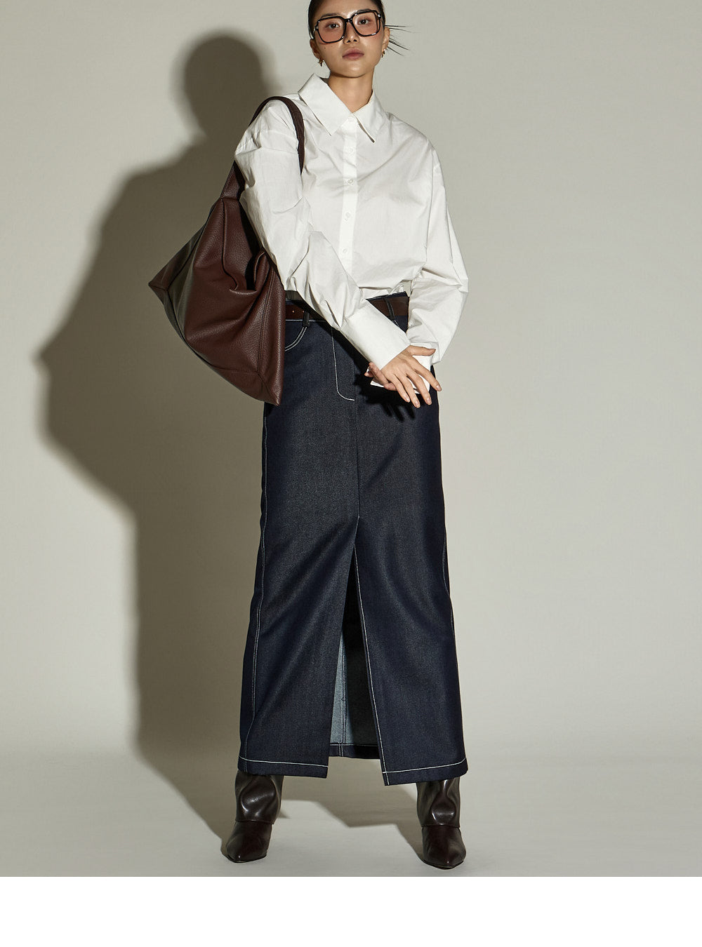 The stitched detailing and front slit are key features,