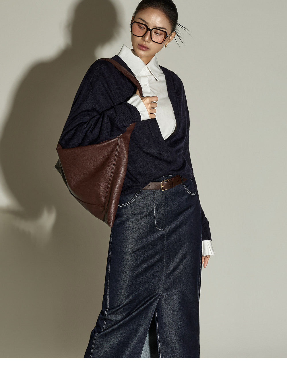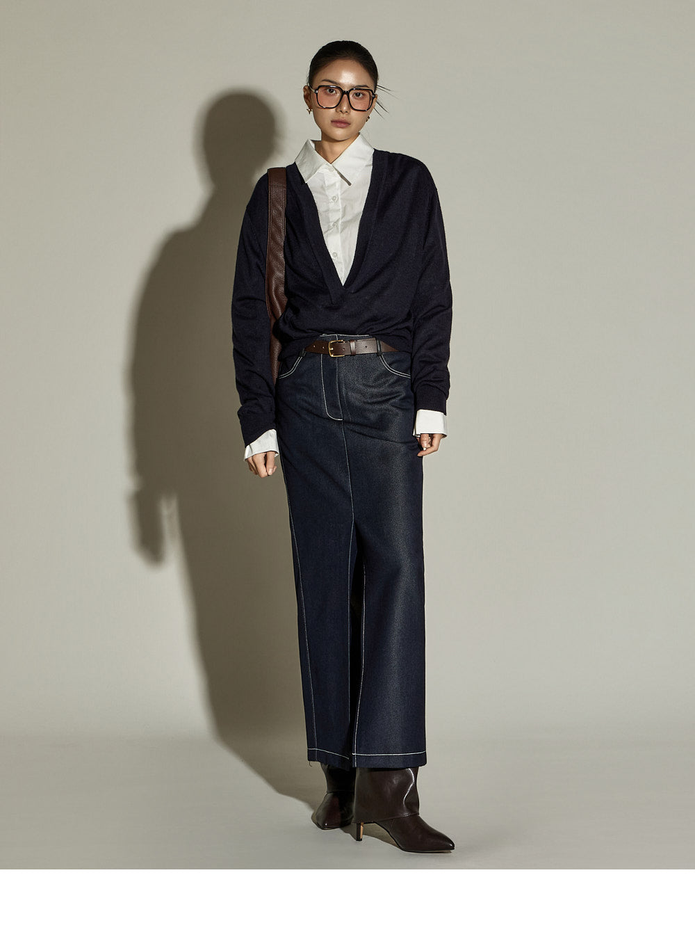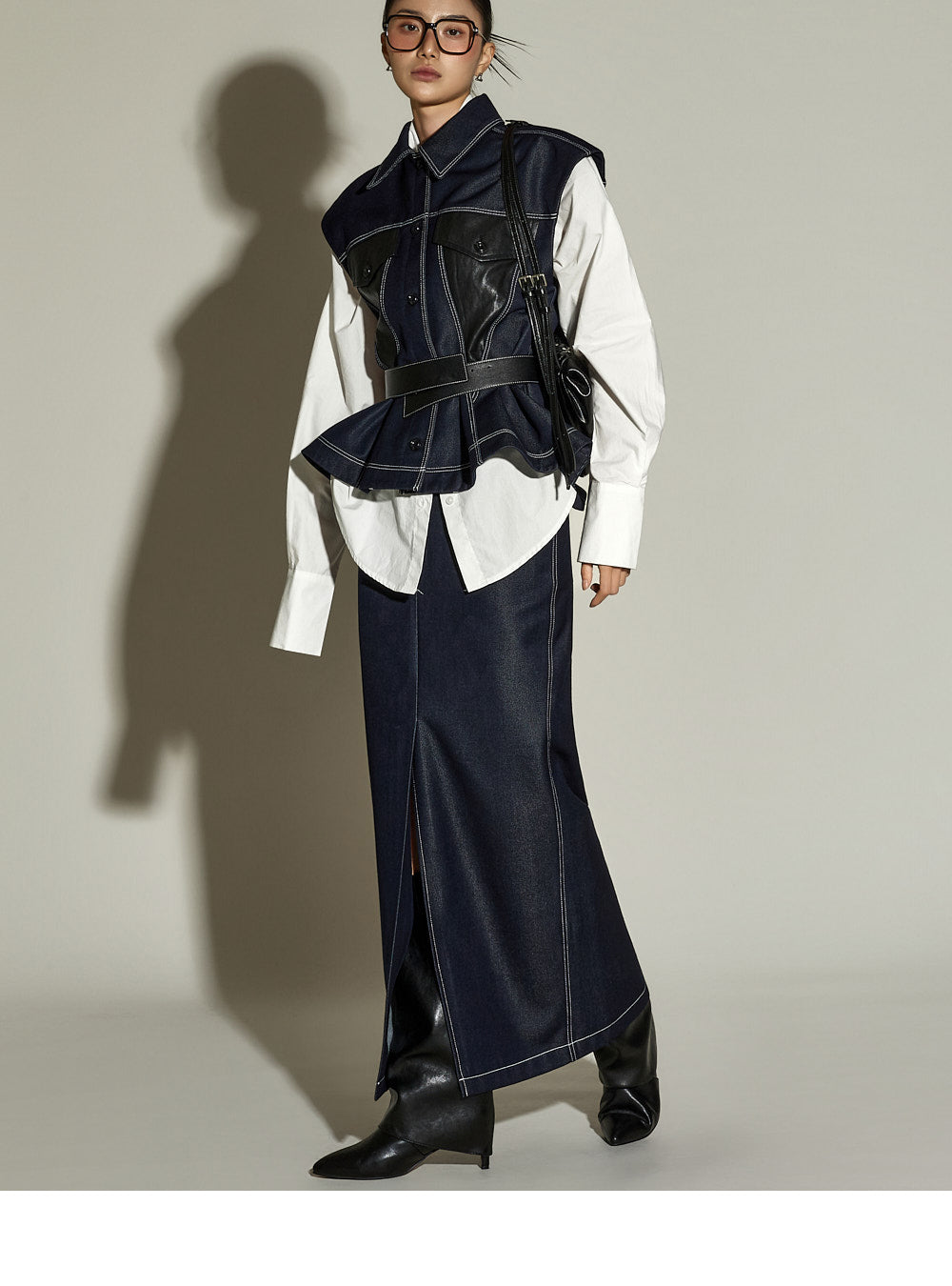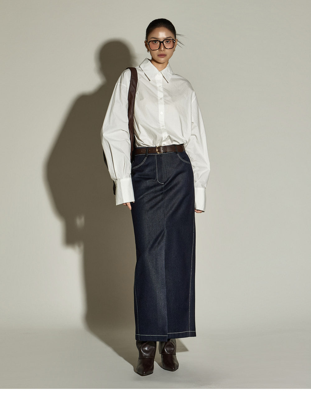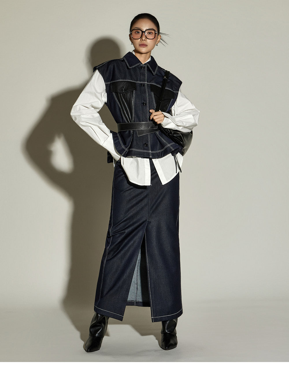 The stitched detailing and front slit are key features,