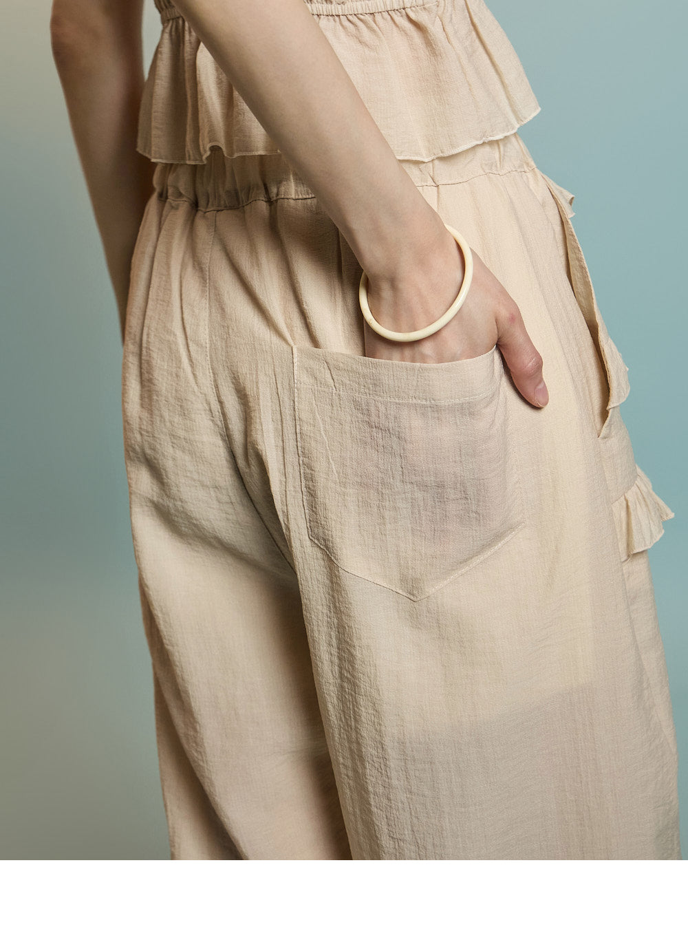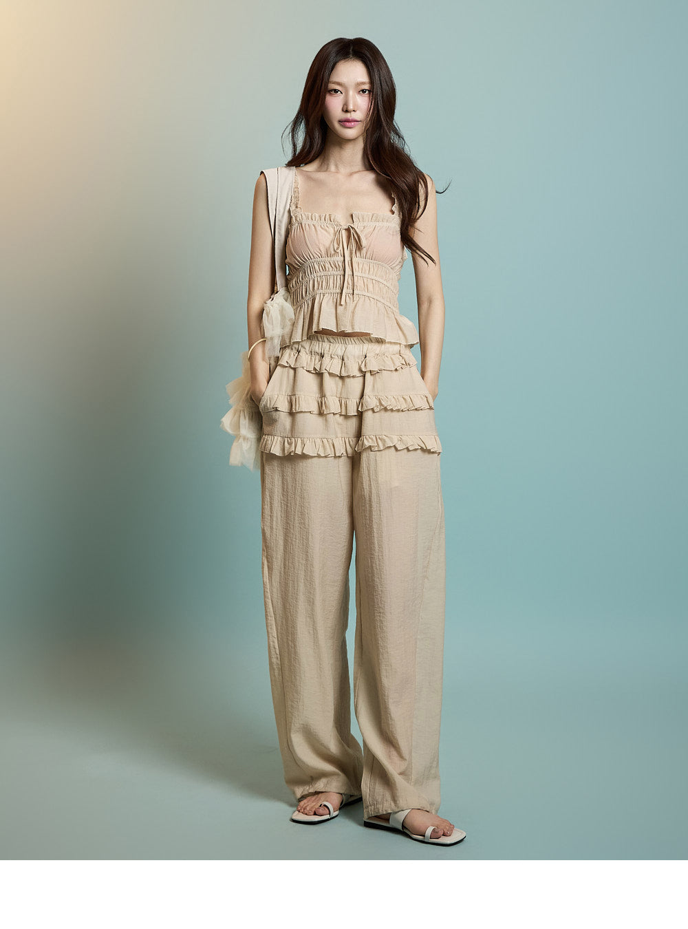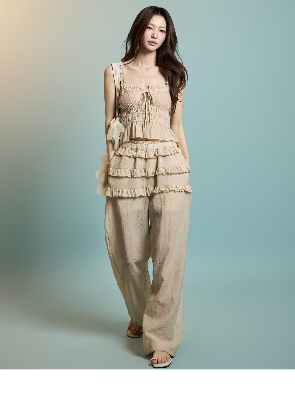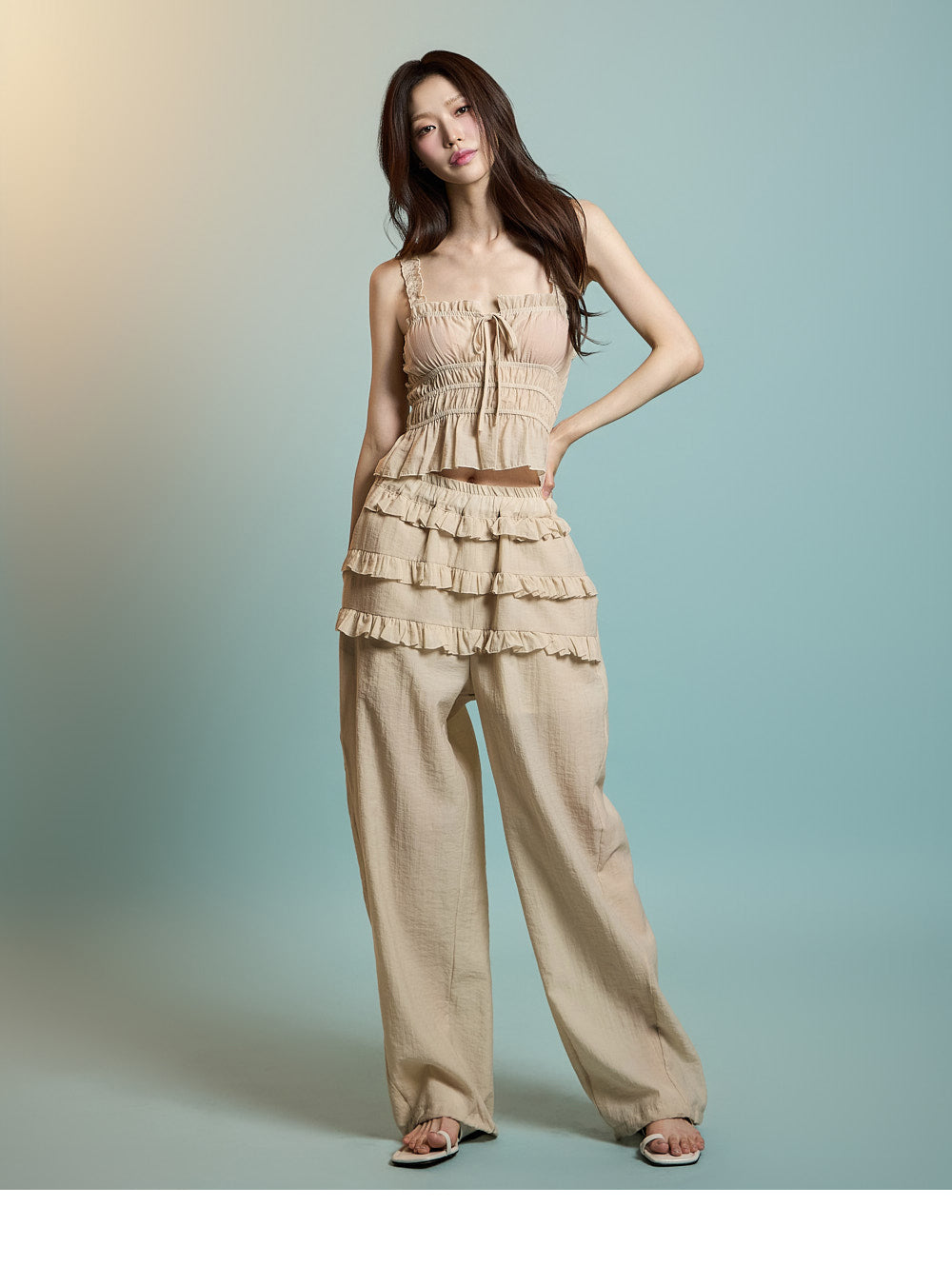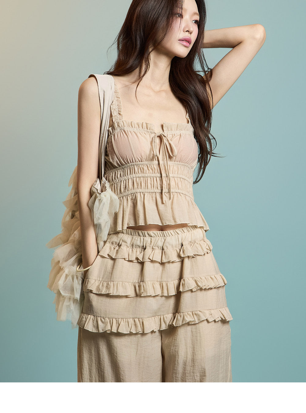The cropped sleeveless top features elastic bands at the waist, chest,