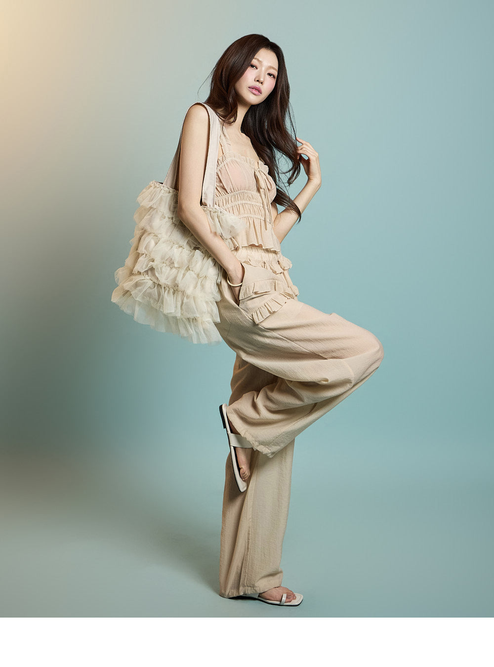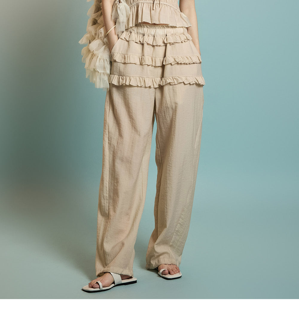 Frill detailing on the front and drawstrings at the hem allow for varied styling.