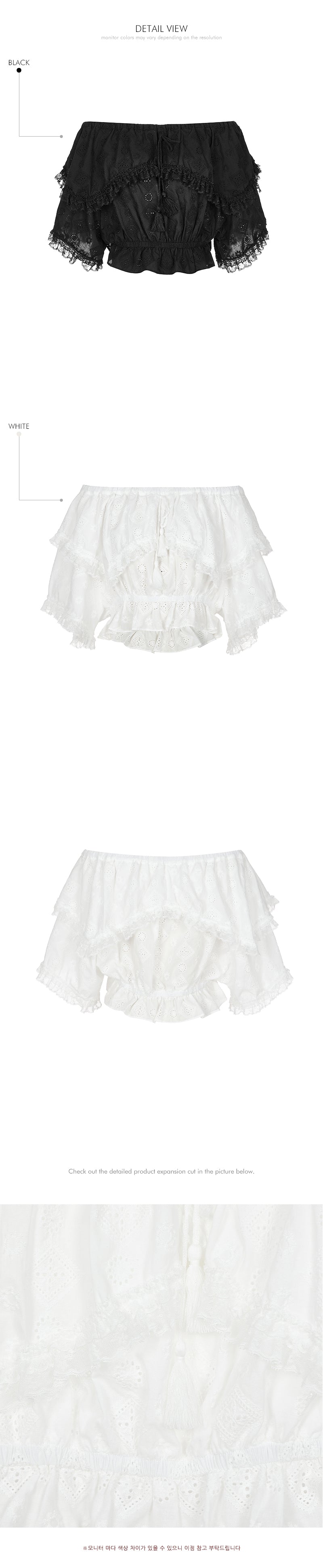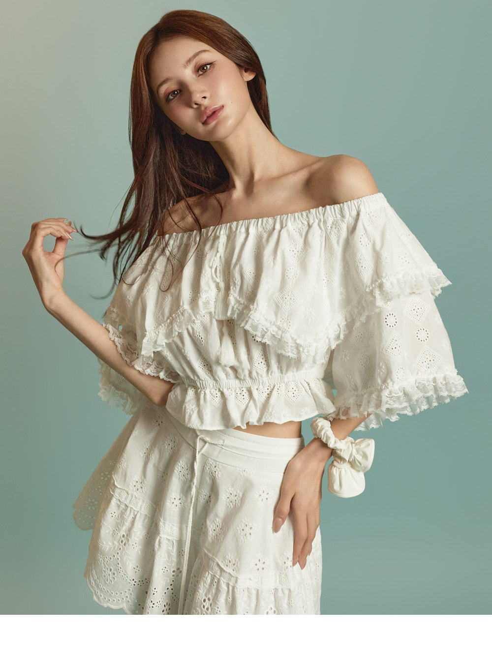 Its cropped length with eyelet details adds a breezy touch, while the elastic bands at the waist and bust ensure a comfortable fit.