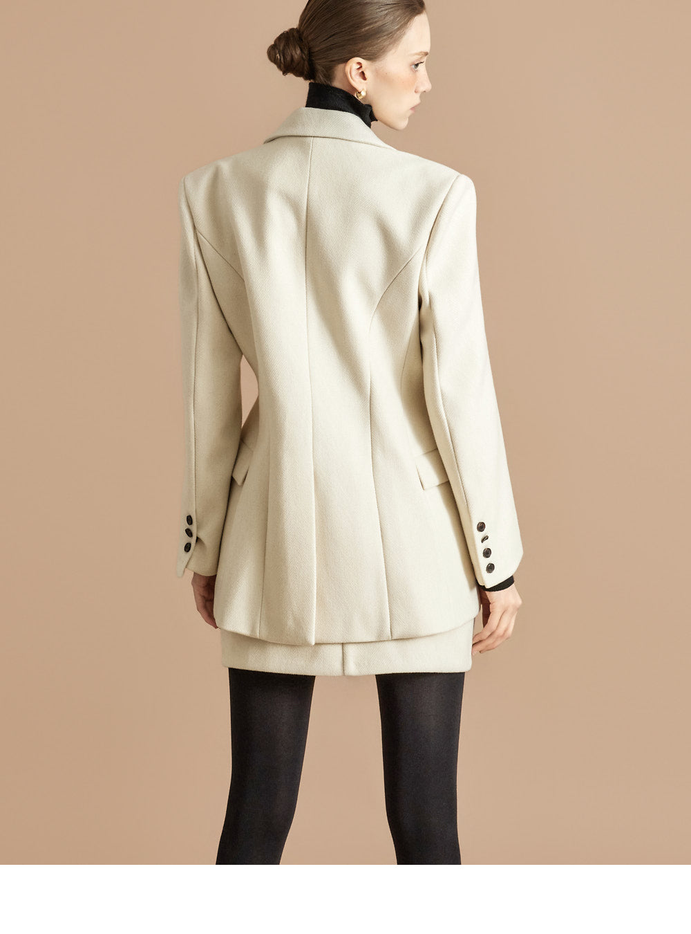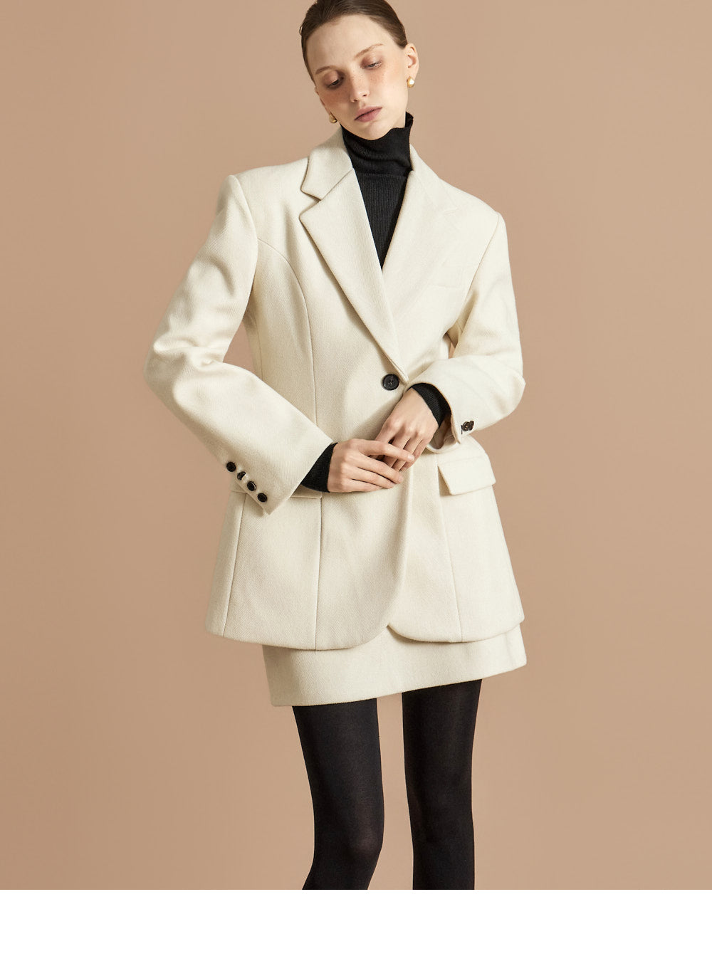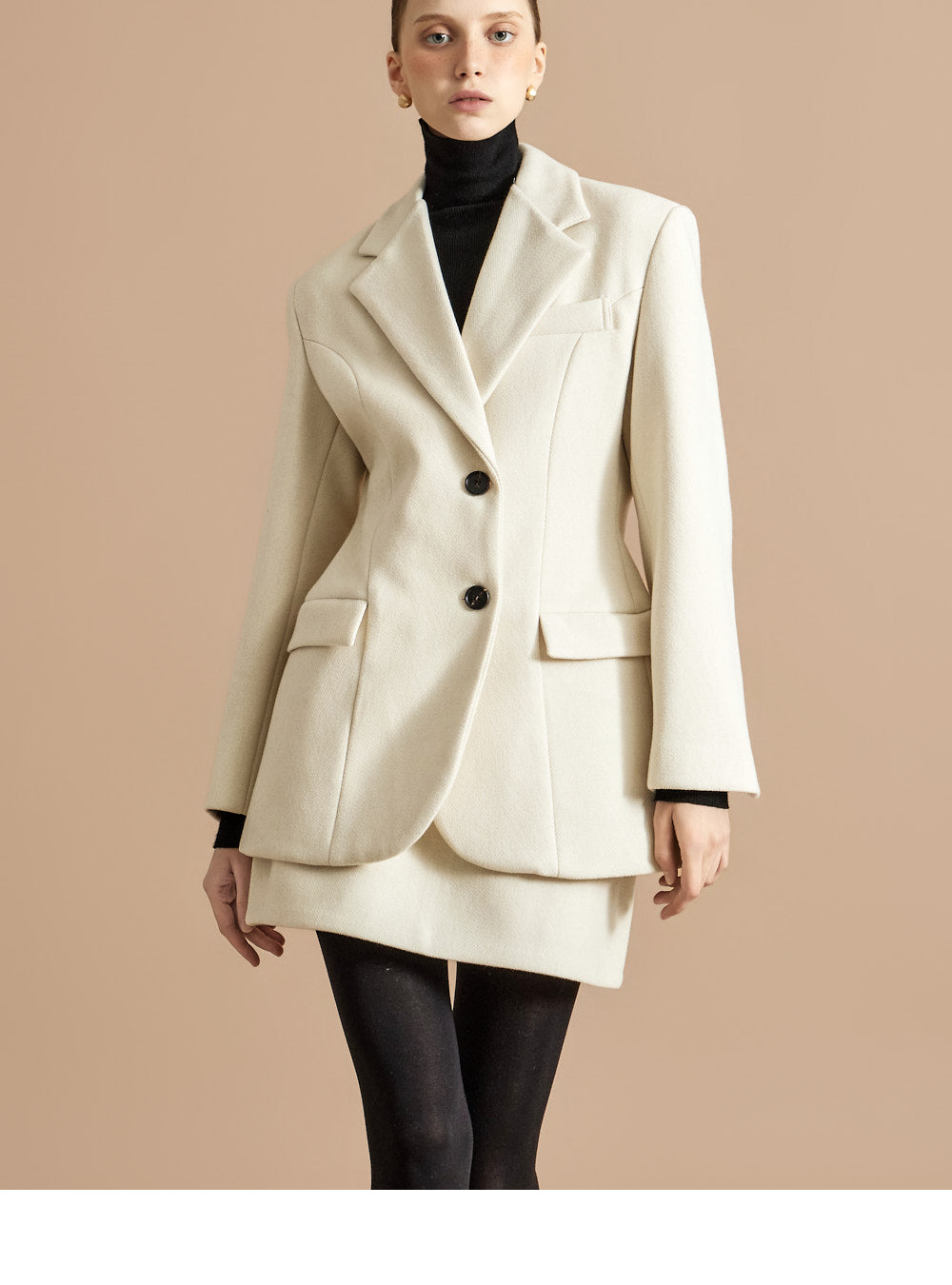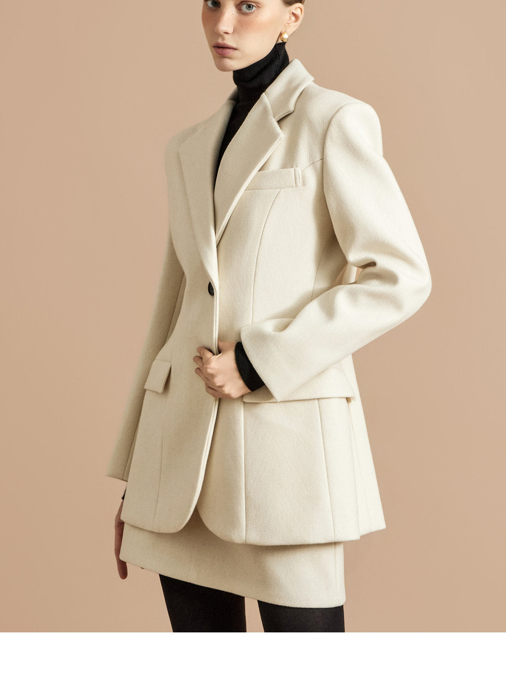The 174cm model is wearing a size ONE jacket, a size S skirt, and the color Ivory.