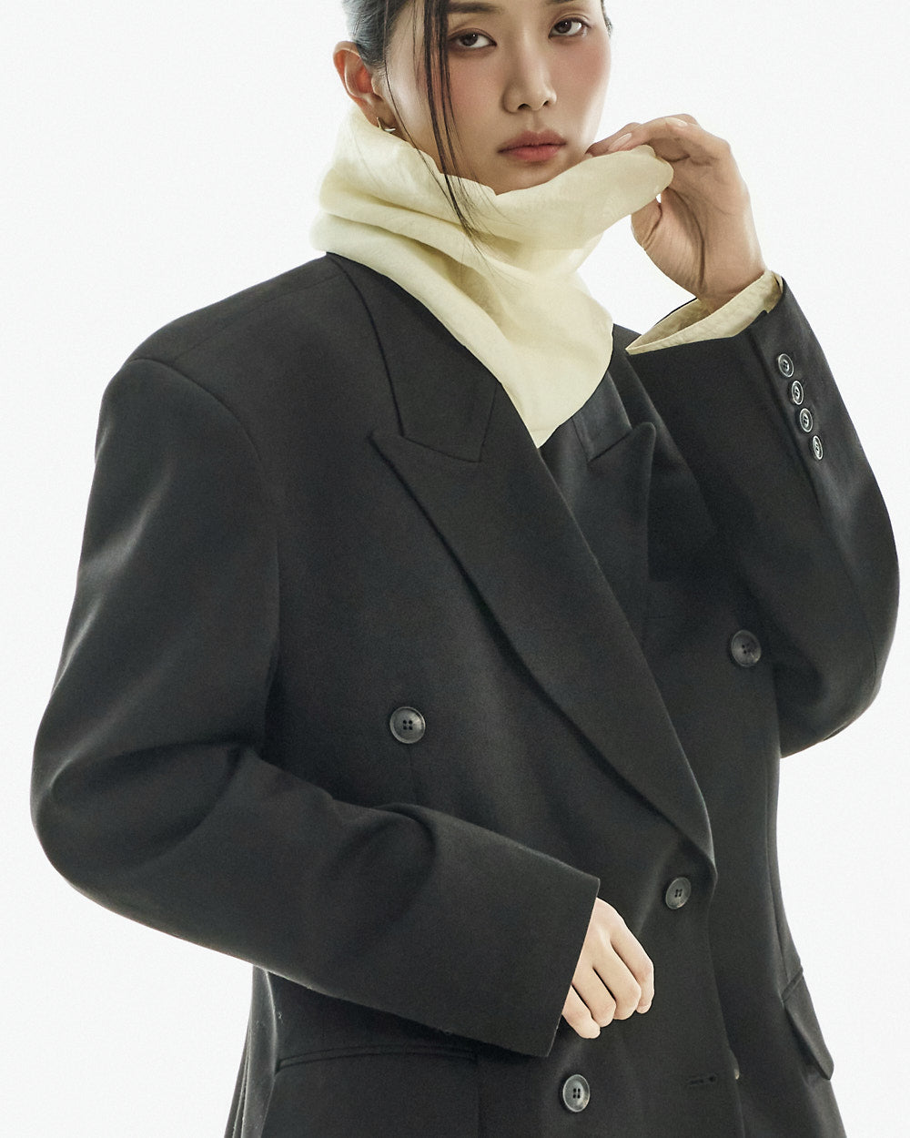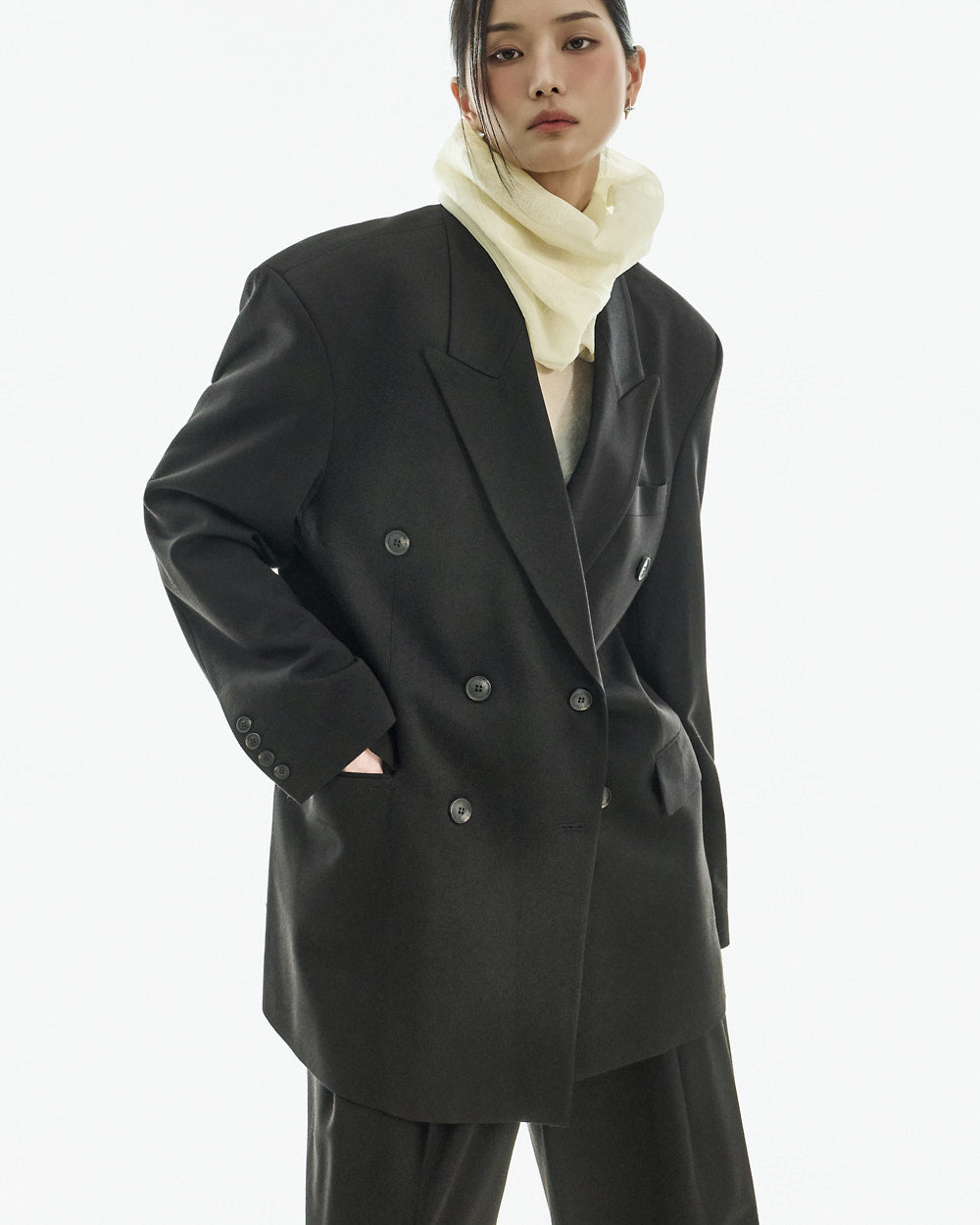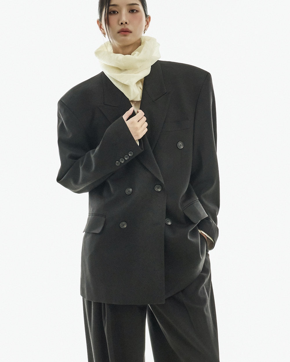 The jacket features an oversized silhouette with double buttons and a tailored collar,