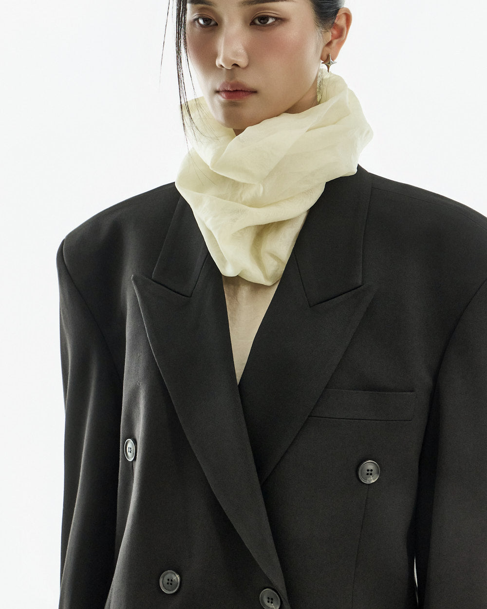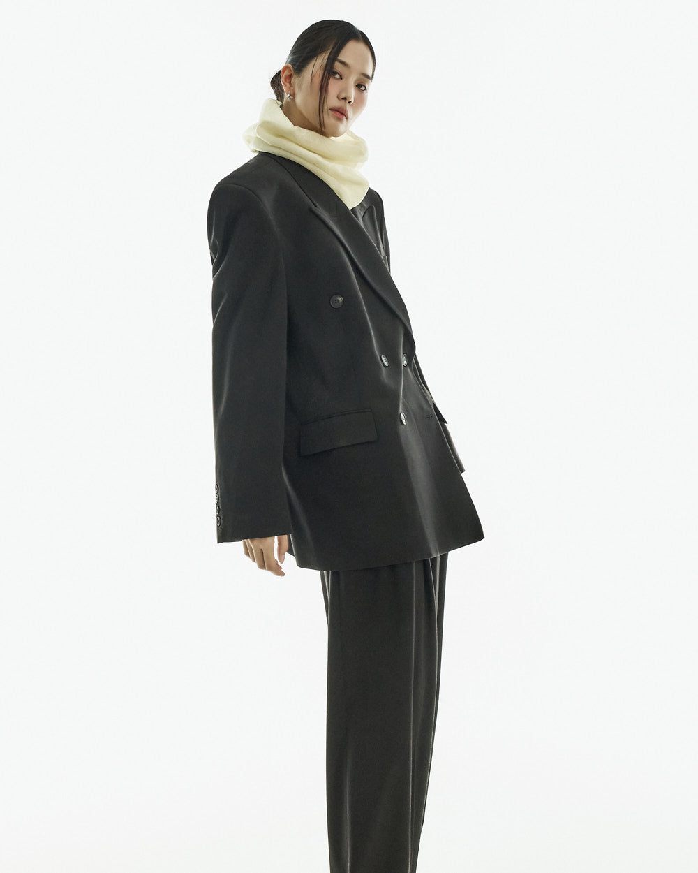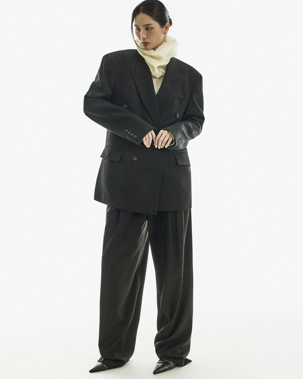 The jacket features an oversized silhouette with double buttons and a tailored collar,