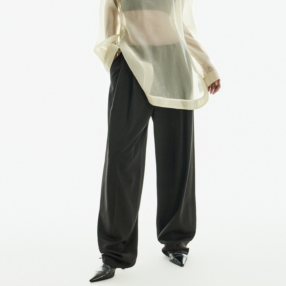 The slacks have a curved fit, cascading naturally,