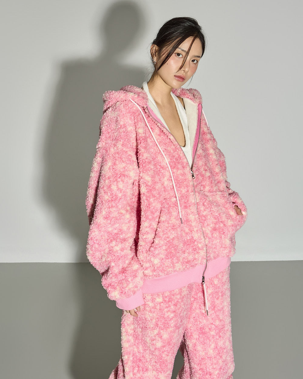 The hooded jumper features an oversized silhouette