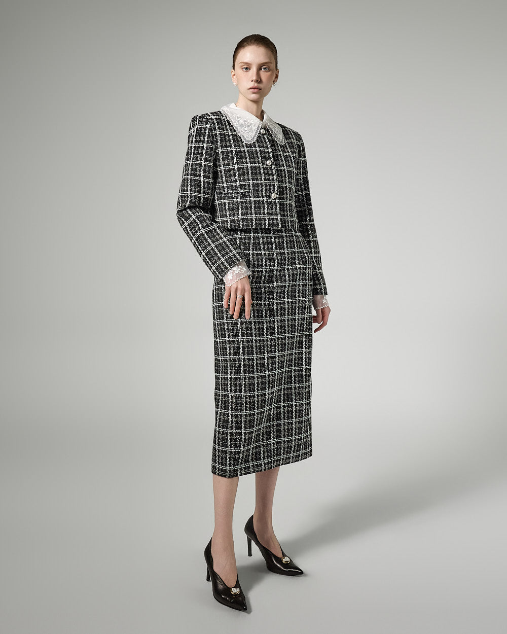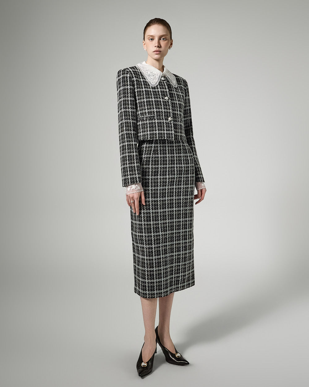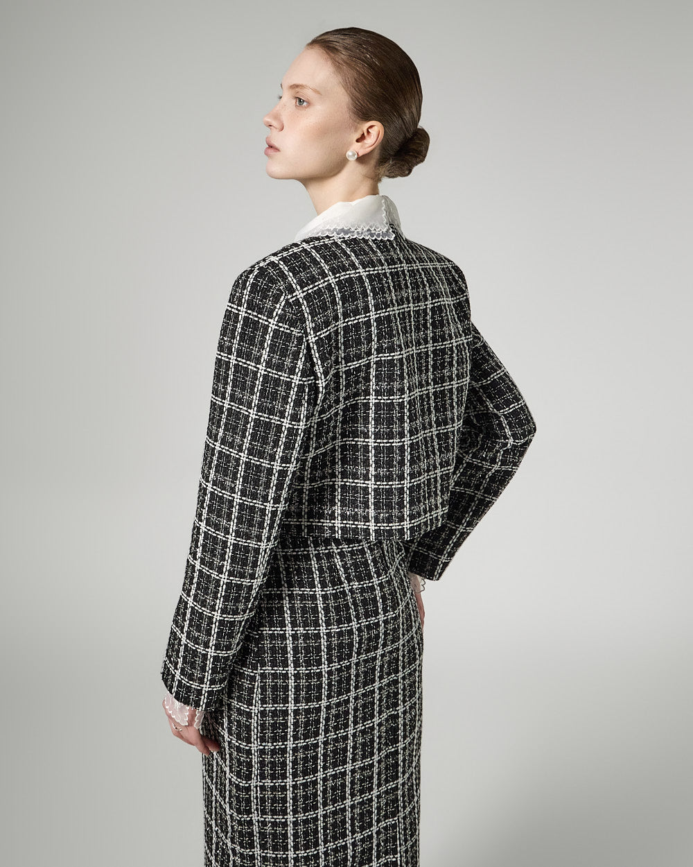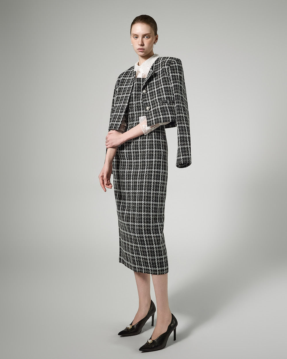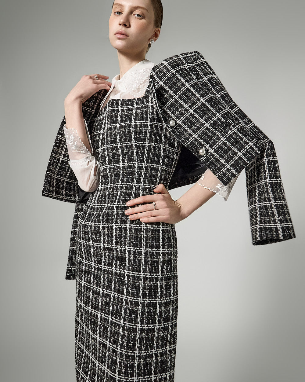This feminine tweed jacket and dress set exudes a feminine vibe.