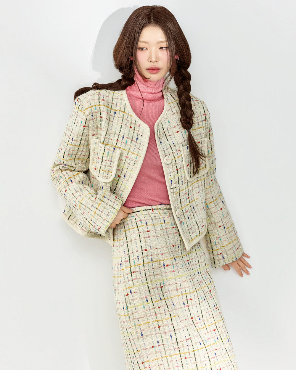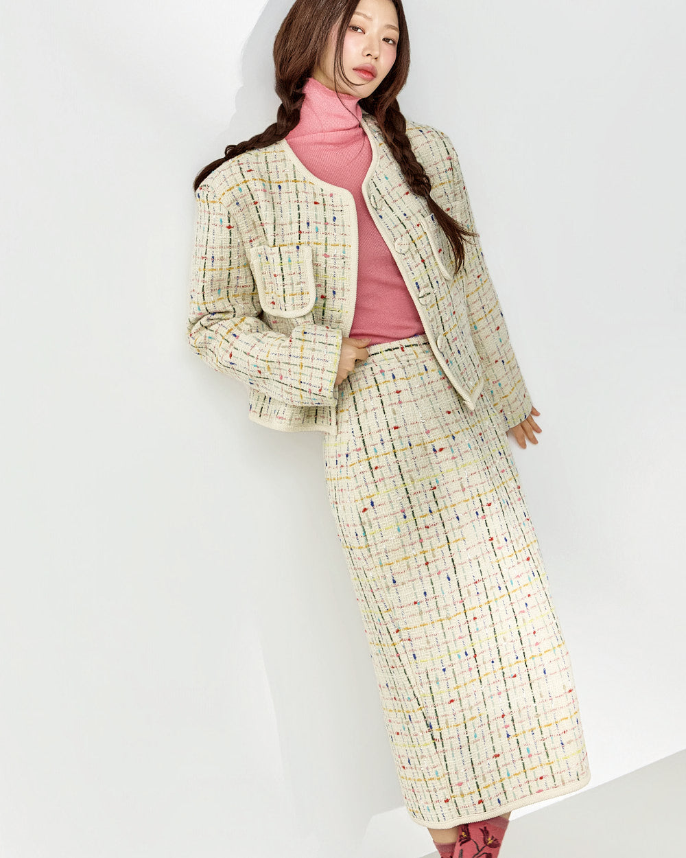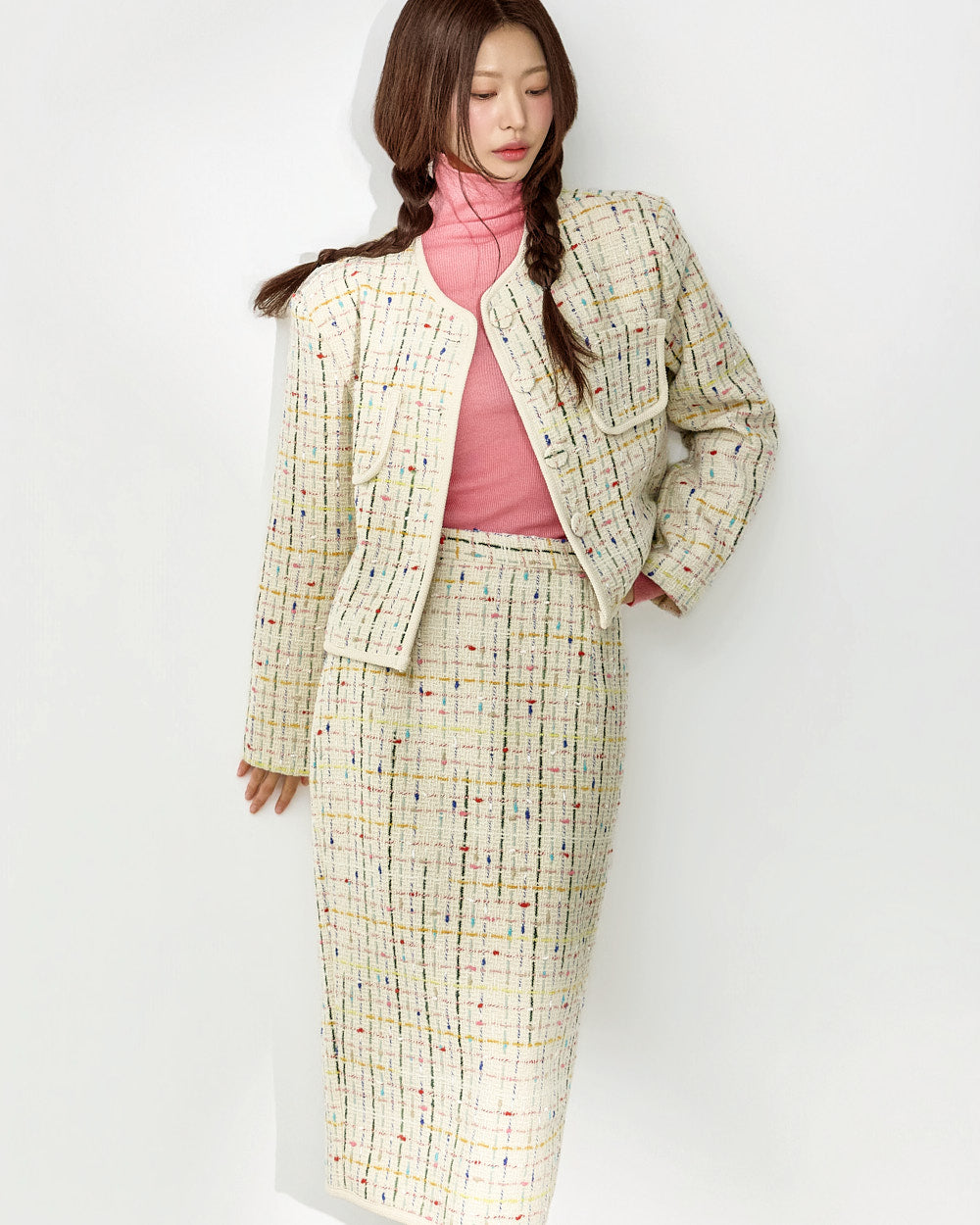 This tweed jacket and skirt set exudes a modern, casual vibe.