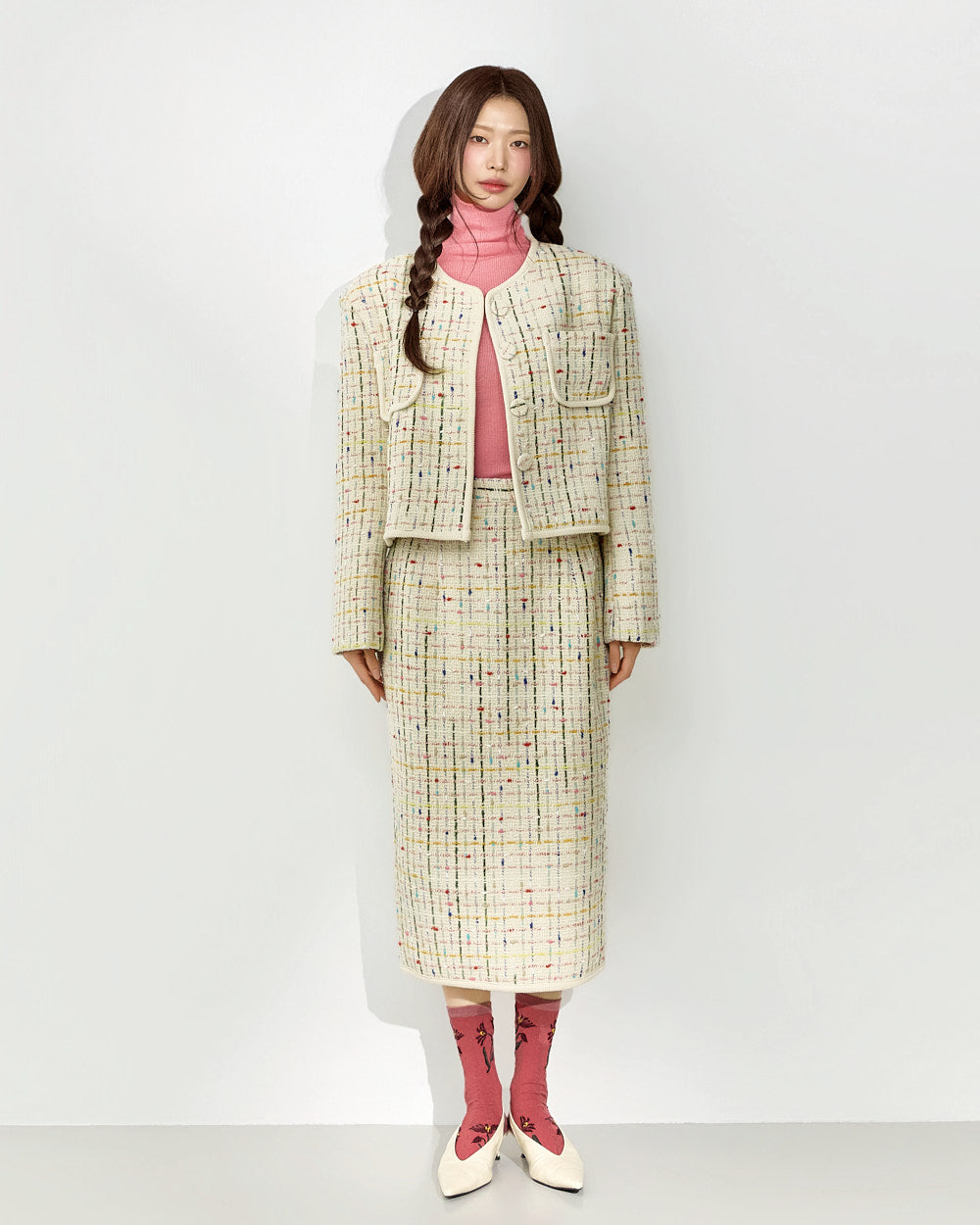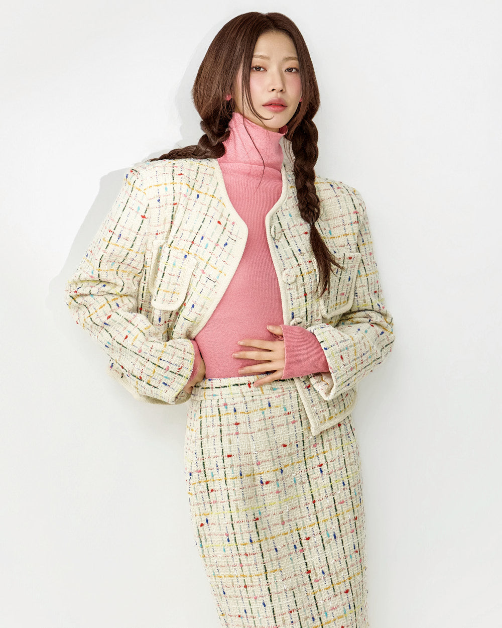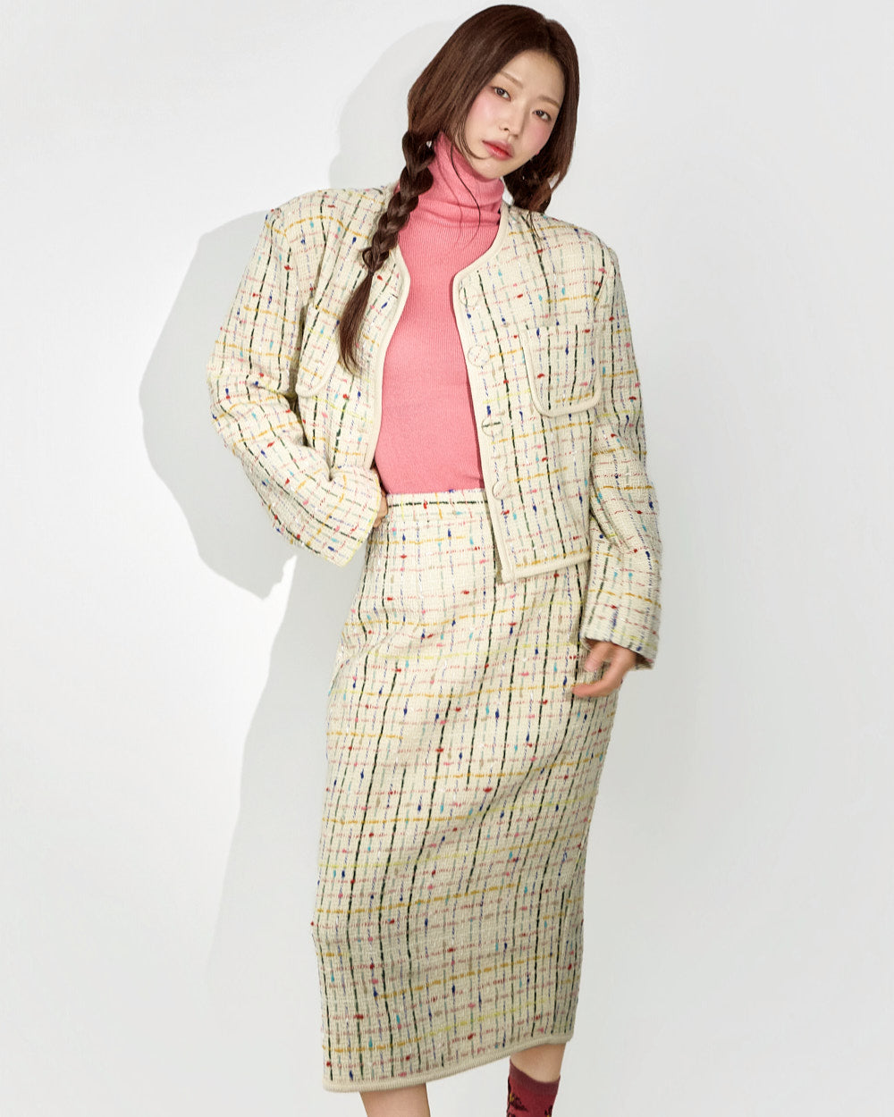 This tweed jacket and skirt set exudes a modern, casual vibe.