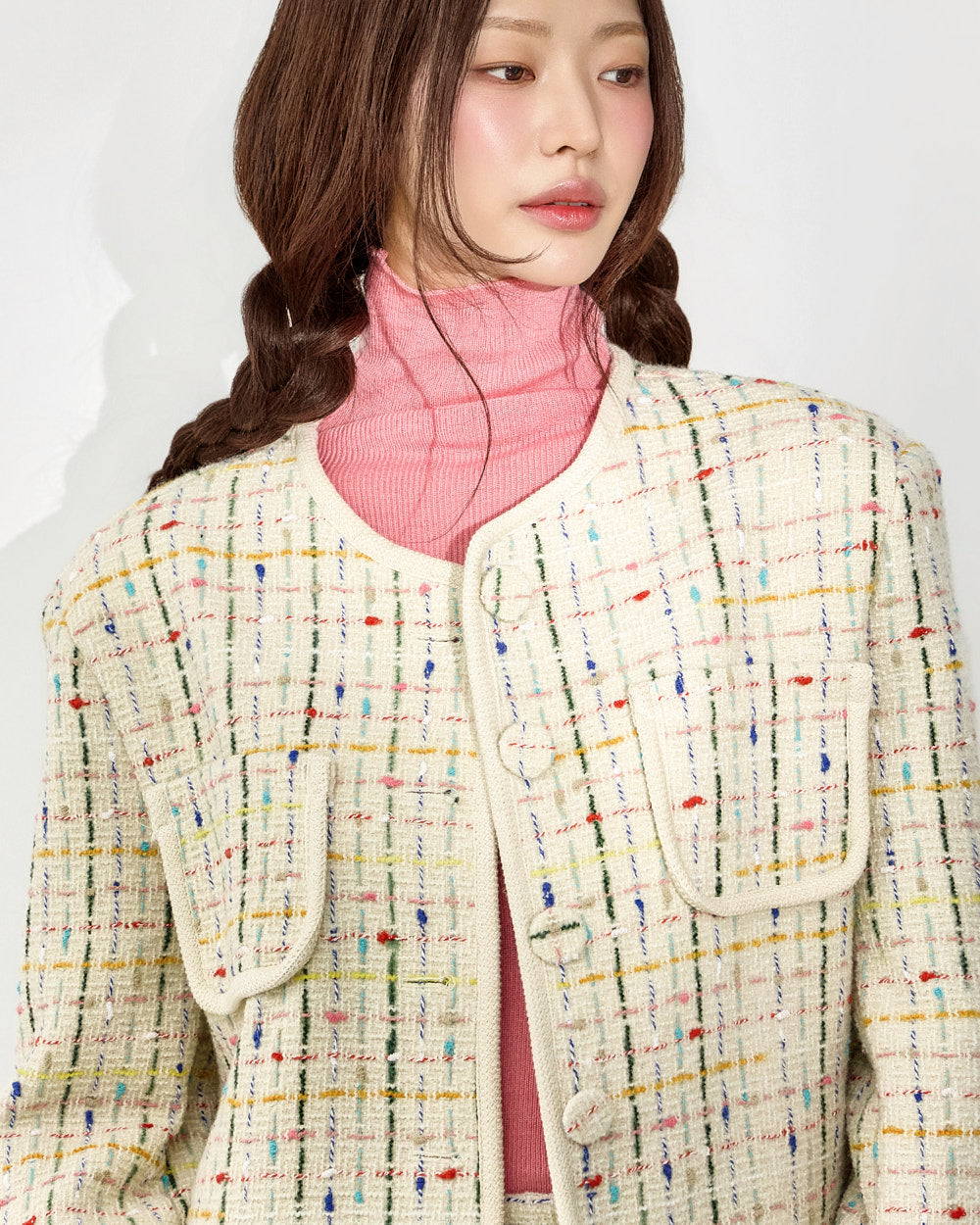 The jacket is a short, fitted length that neatly frames the upper body,