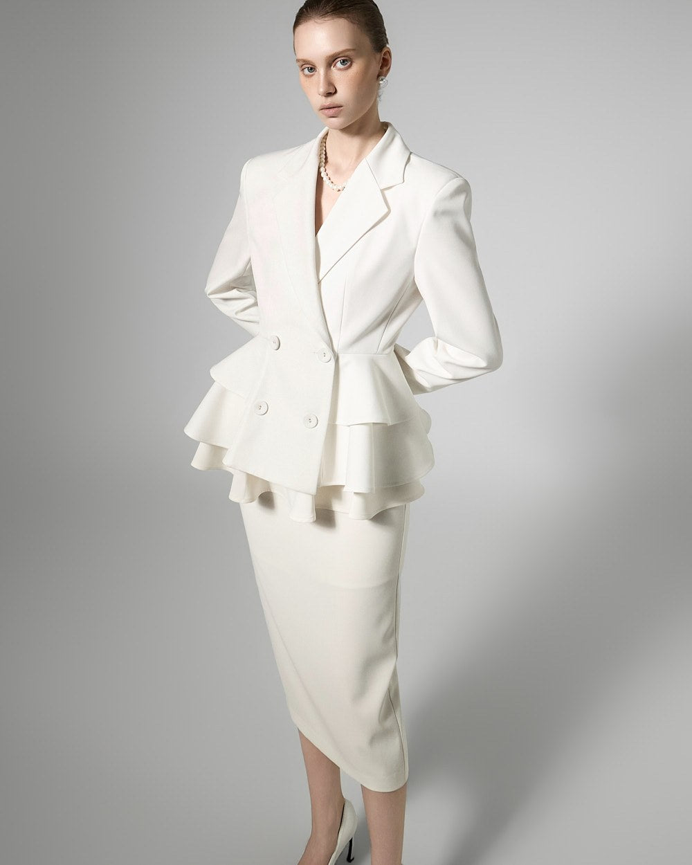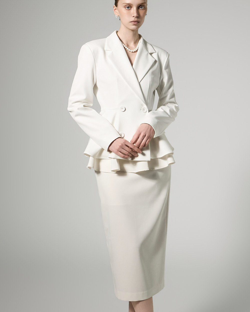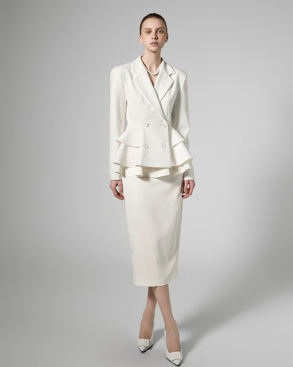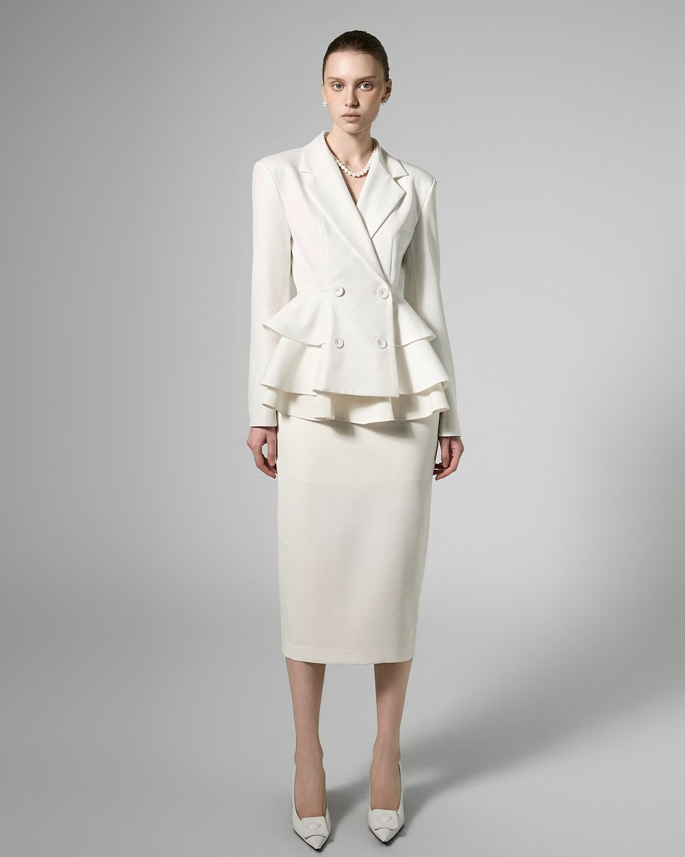 This jacket and skirt set exudes a modern, lovely vibe.
