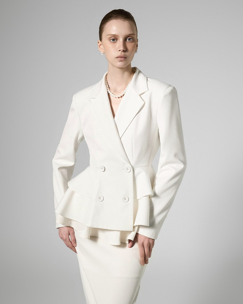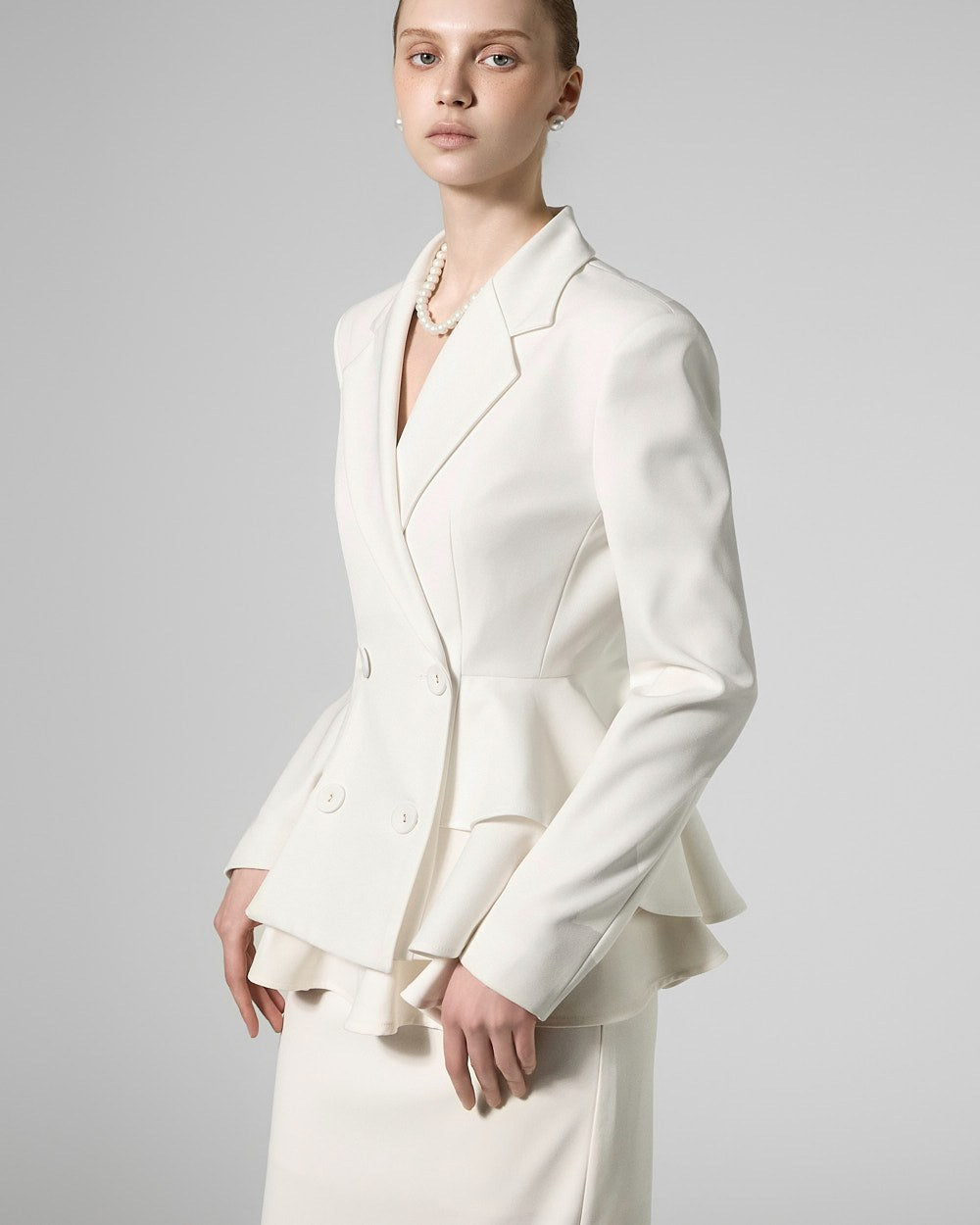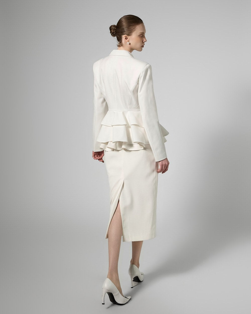 The jacket features a slim fit with a ruffled waist,