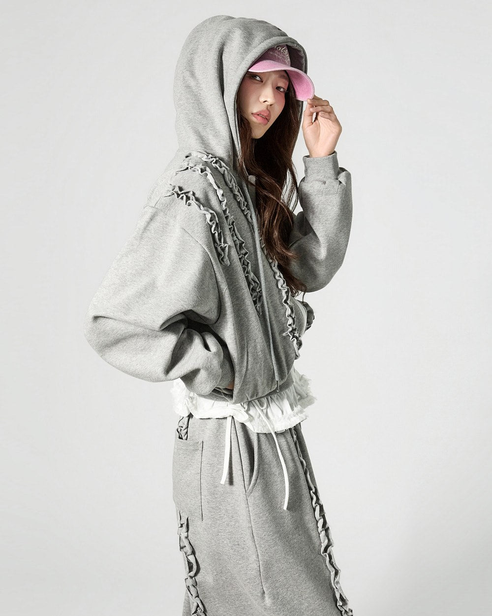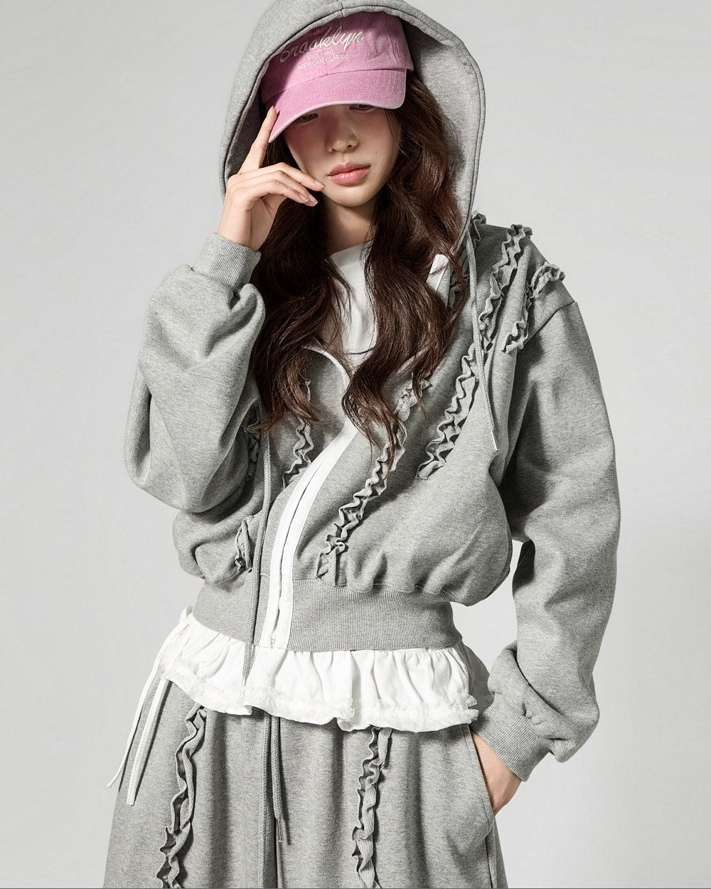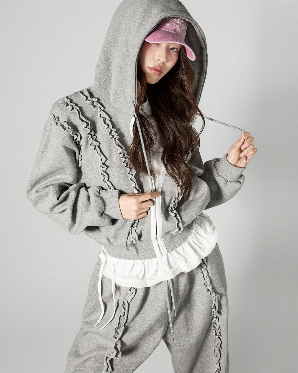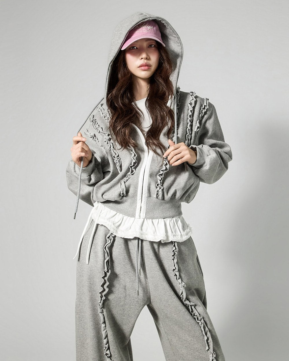 The combination of a cropped hooded zip-up and loose-fitting pants creates a trendy yet stylish outfit.