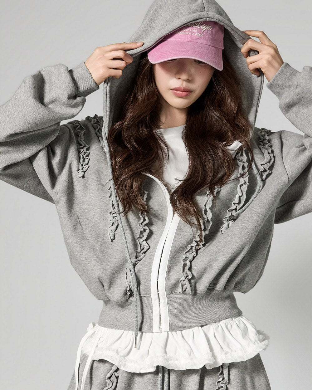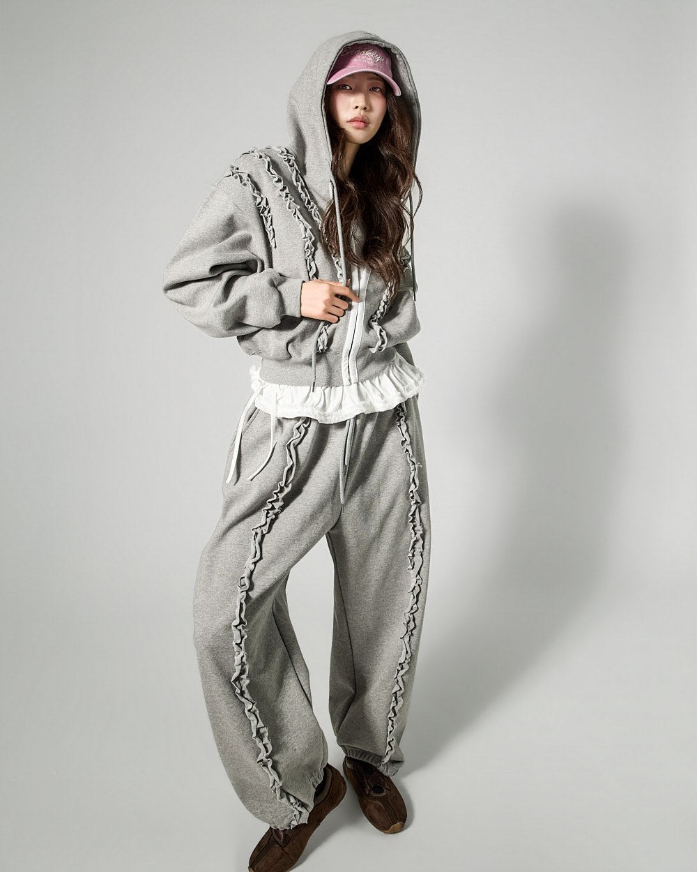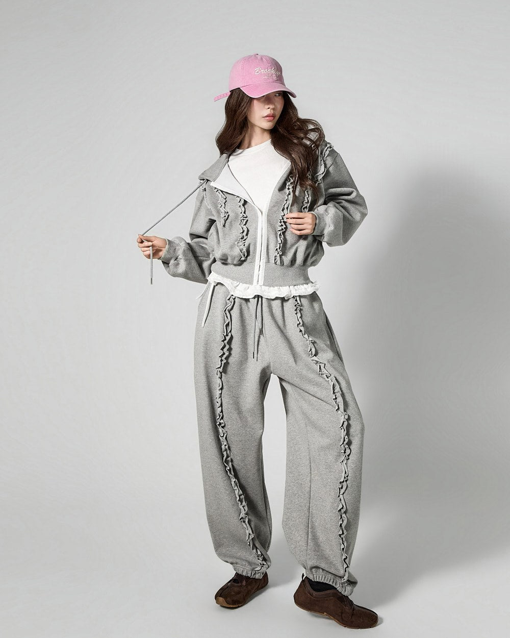 The combination of a cropped hooded zip-up and loose-fitting pants creates a trendy yet stylish outfit.
