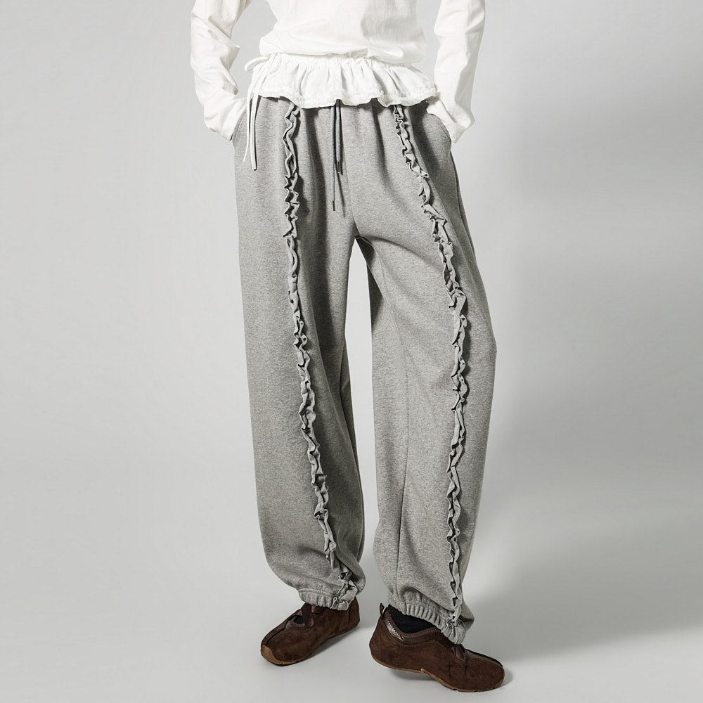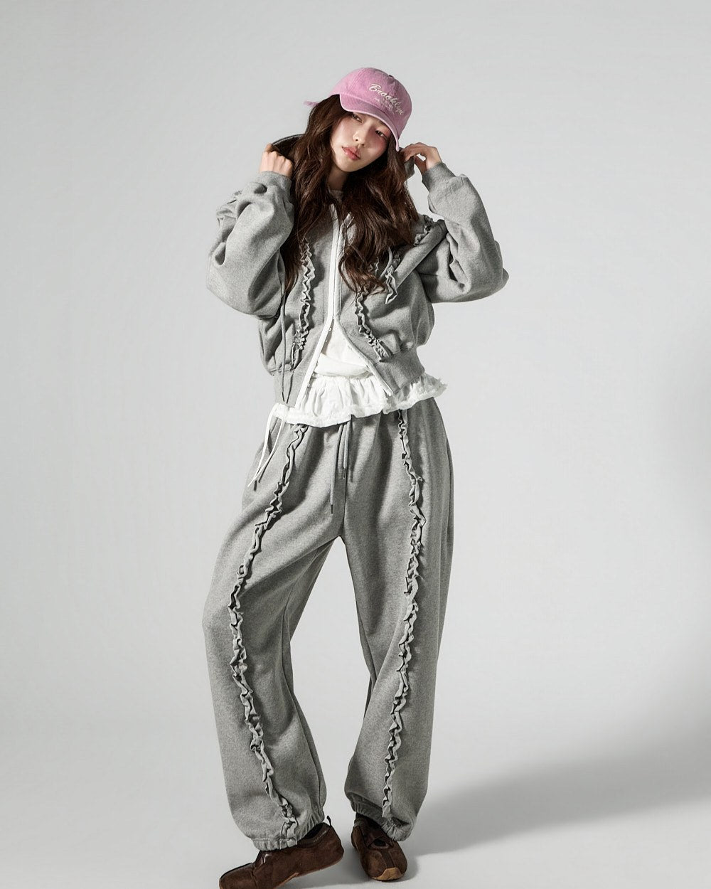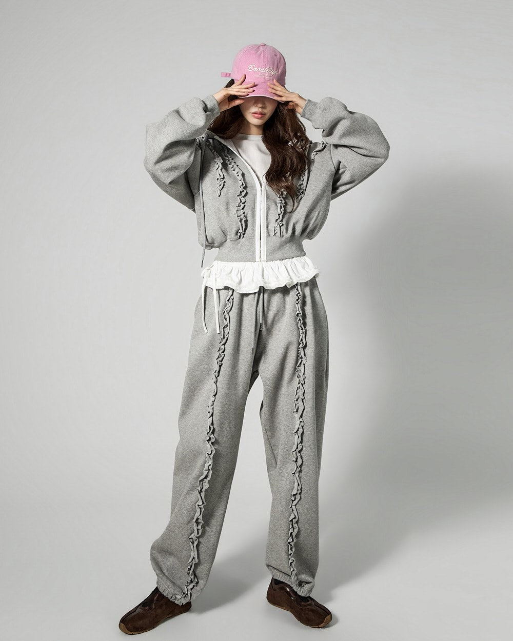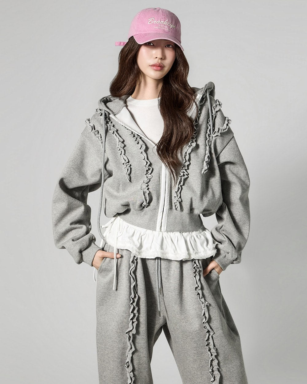 The combination of a cropped hooded zip-up and loose-fitting pants creates a trendy yet stylish outfit.