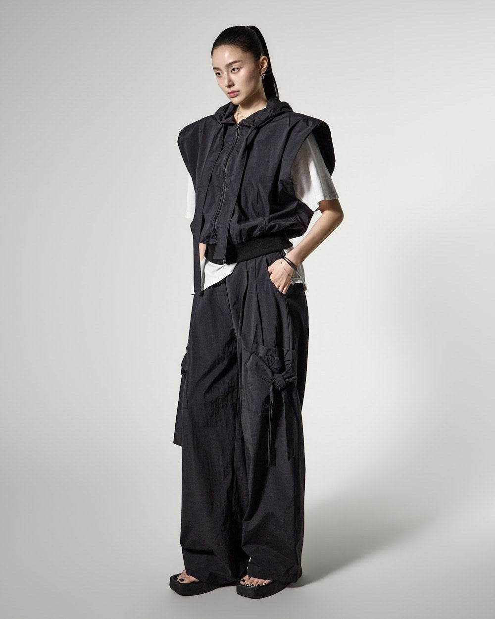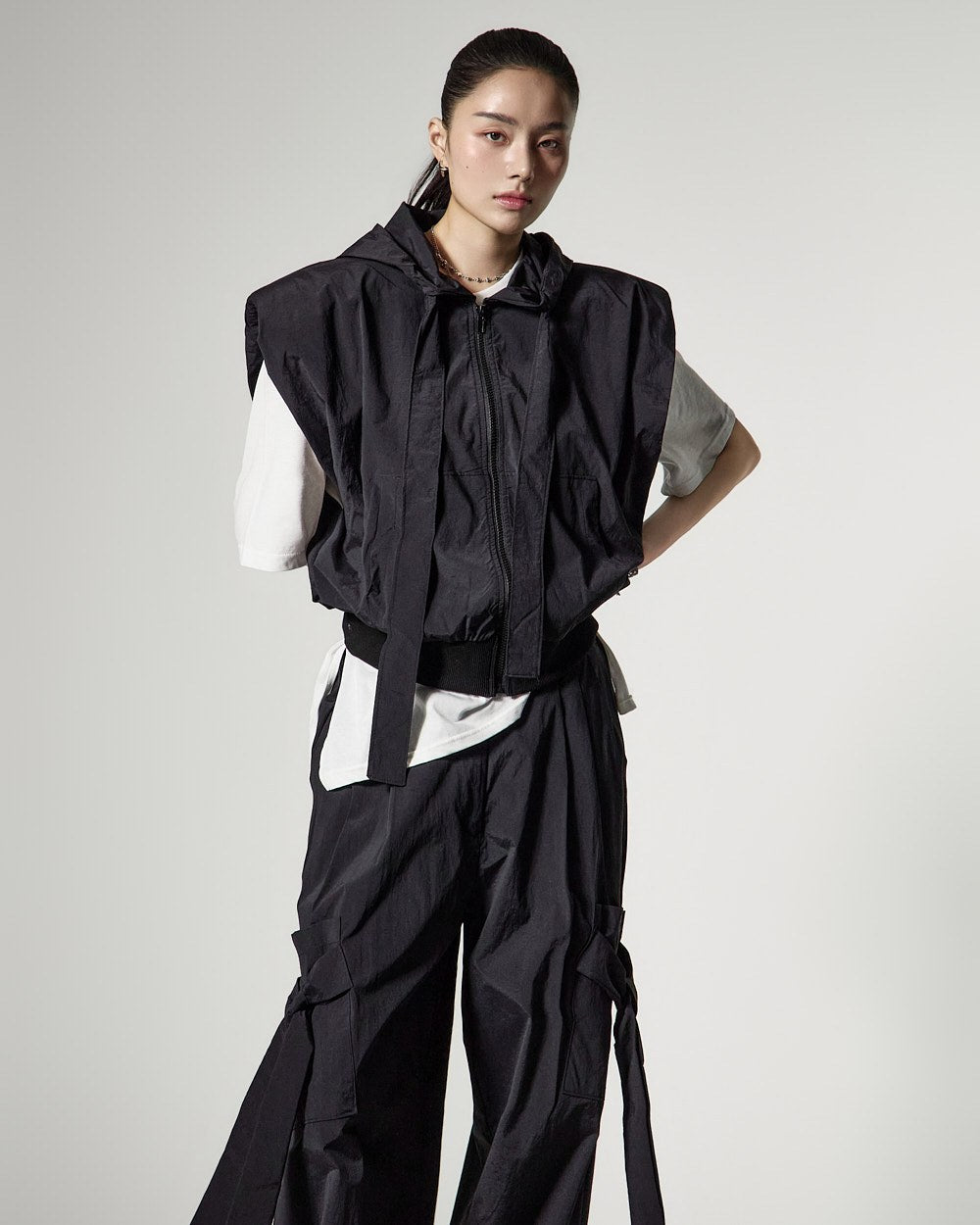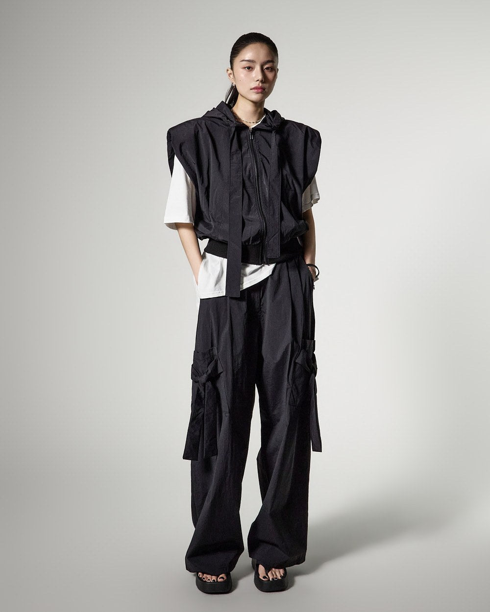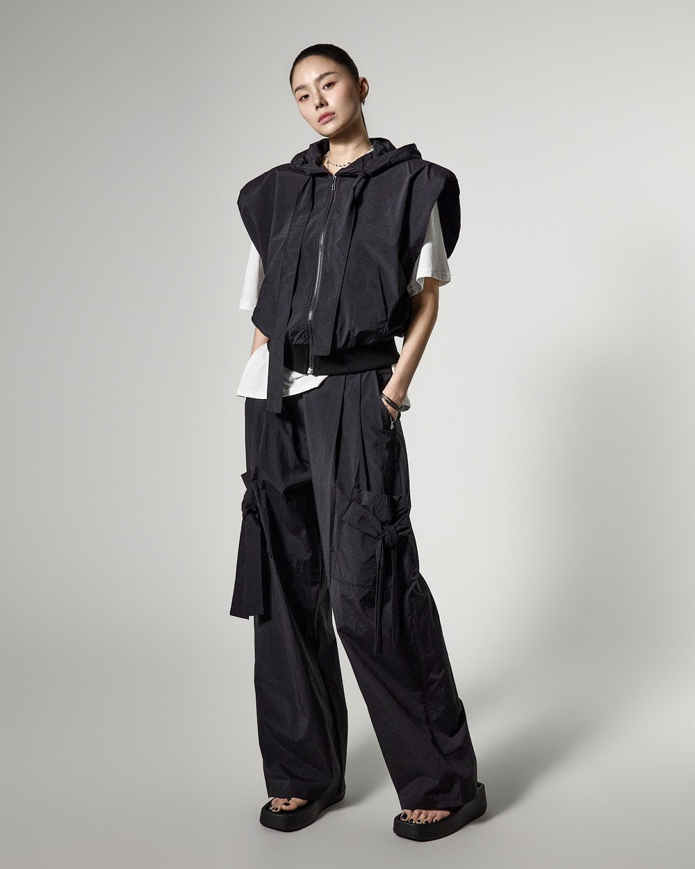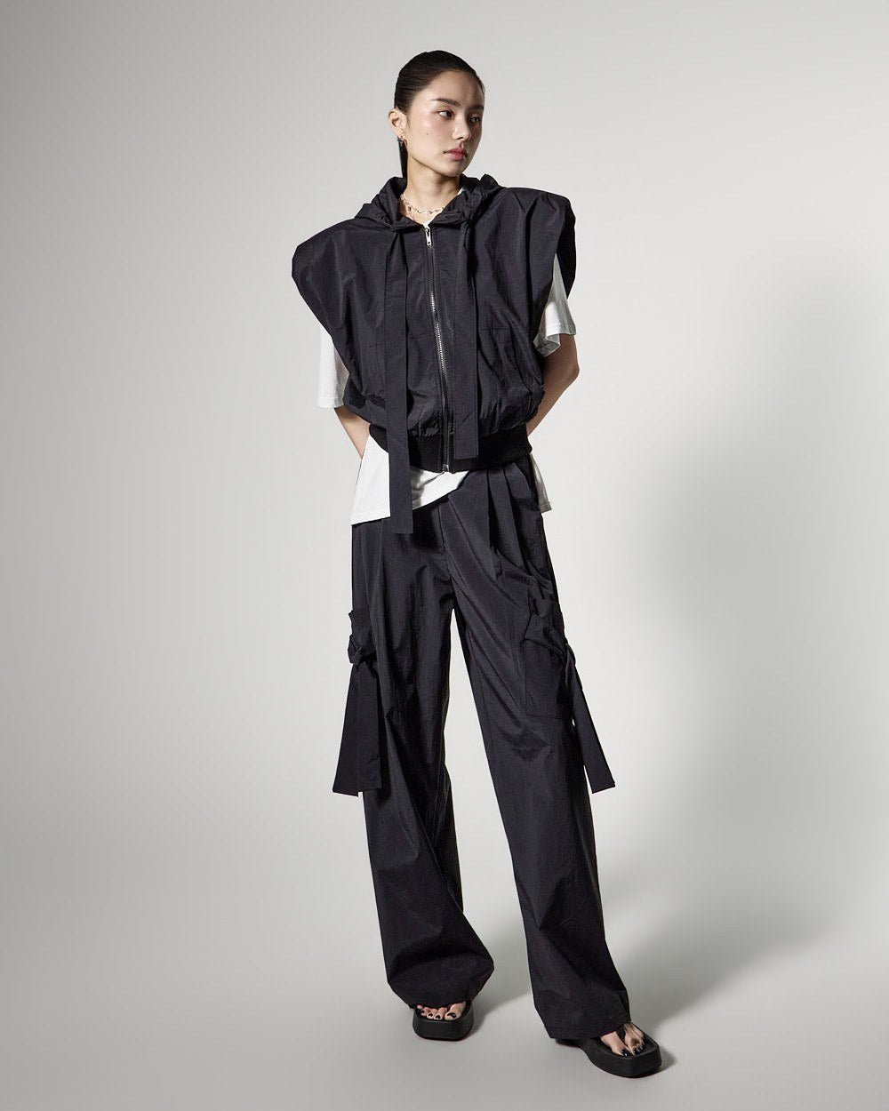 The button closure ensures a secure fit, and the addition of side pockets and ribbon details completes a stylish yet unique look. When worn as a set, it creates a polished sporty look,