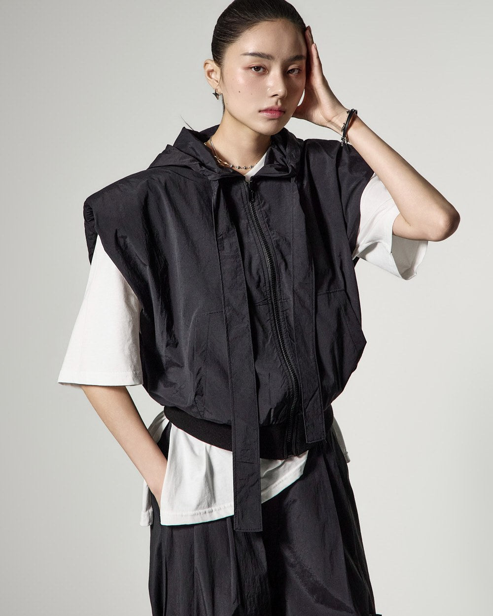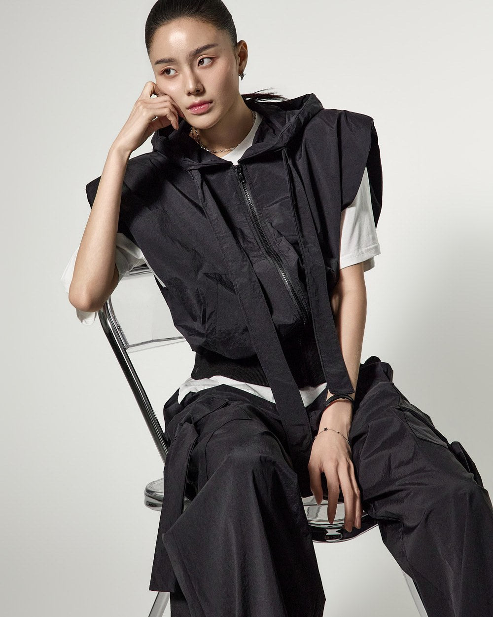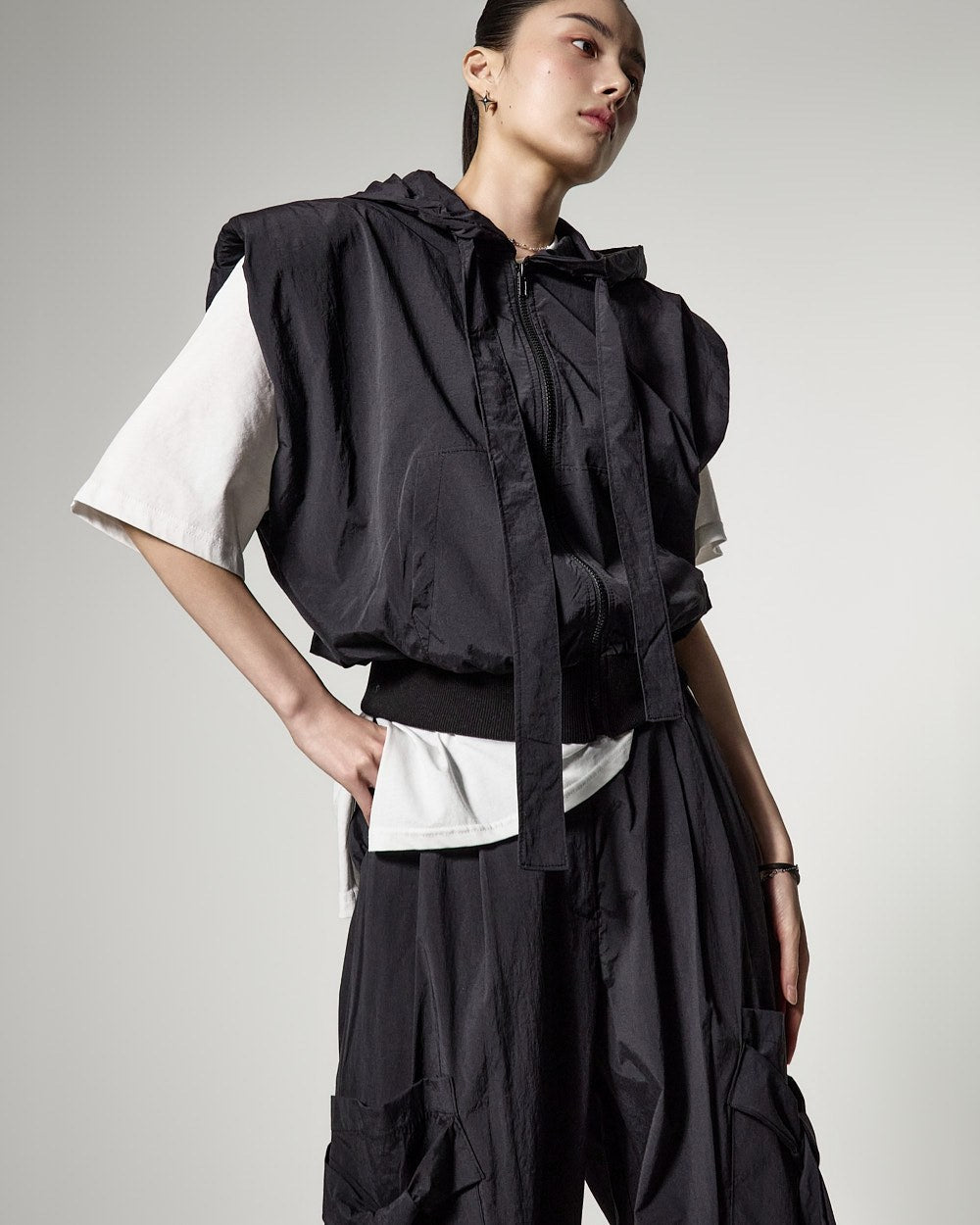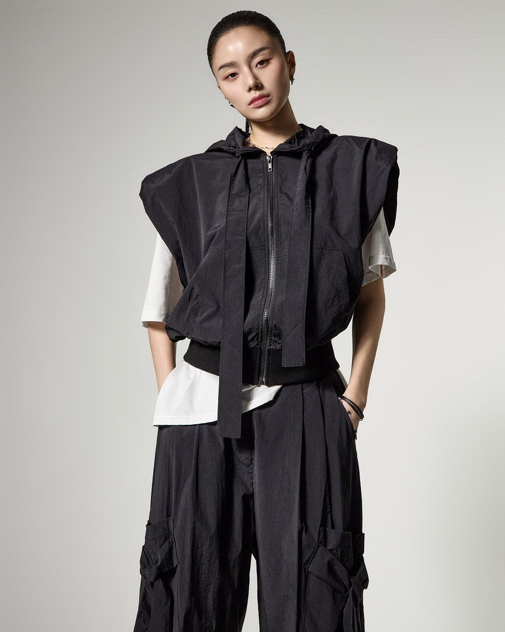 The button closure ensures a secure fit, and the addition of side pockets and ribbon details completes a stylish yet unique look. When worn as a set, it creates a polished sporty look,