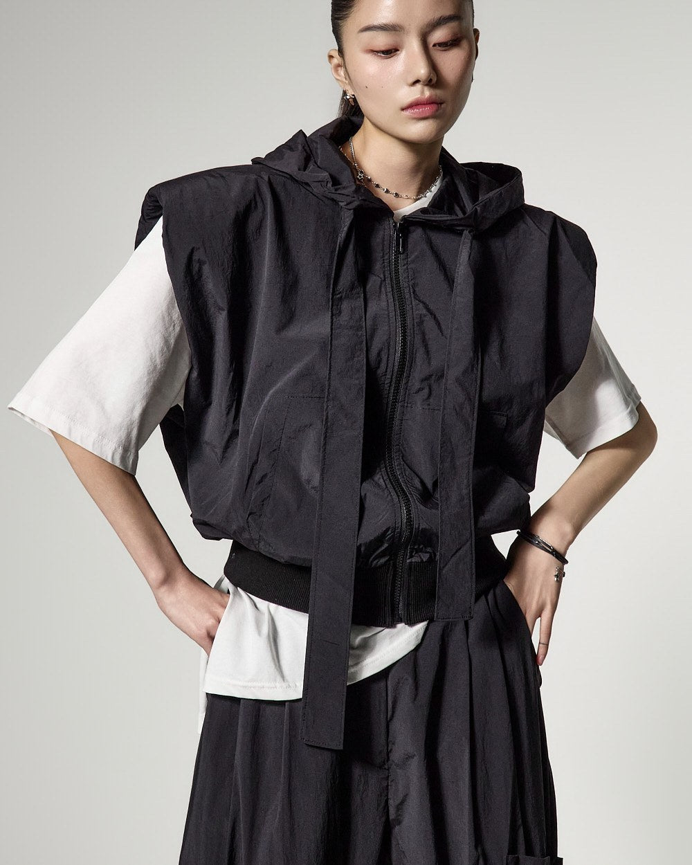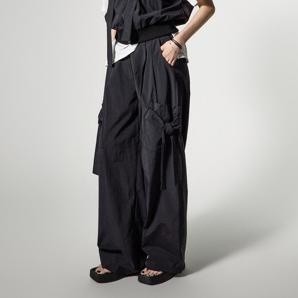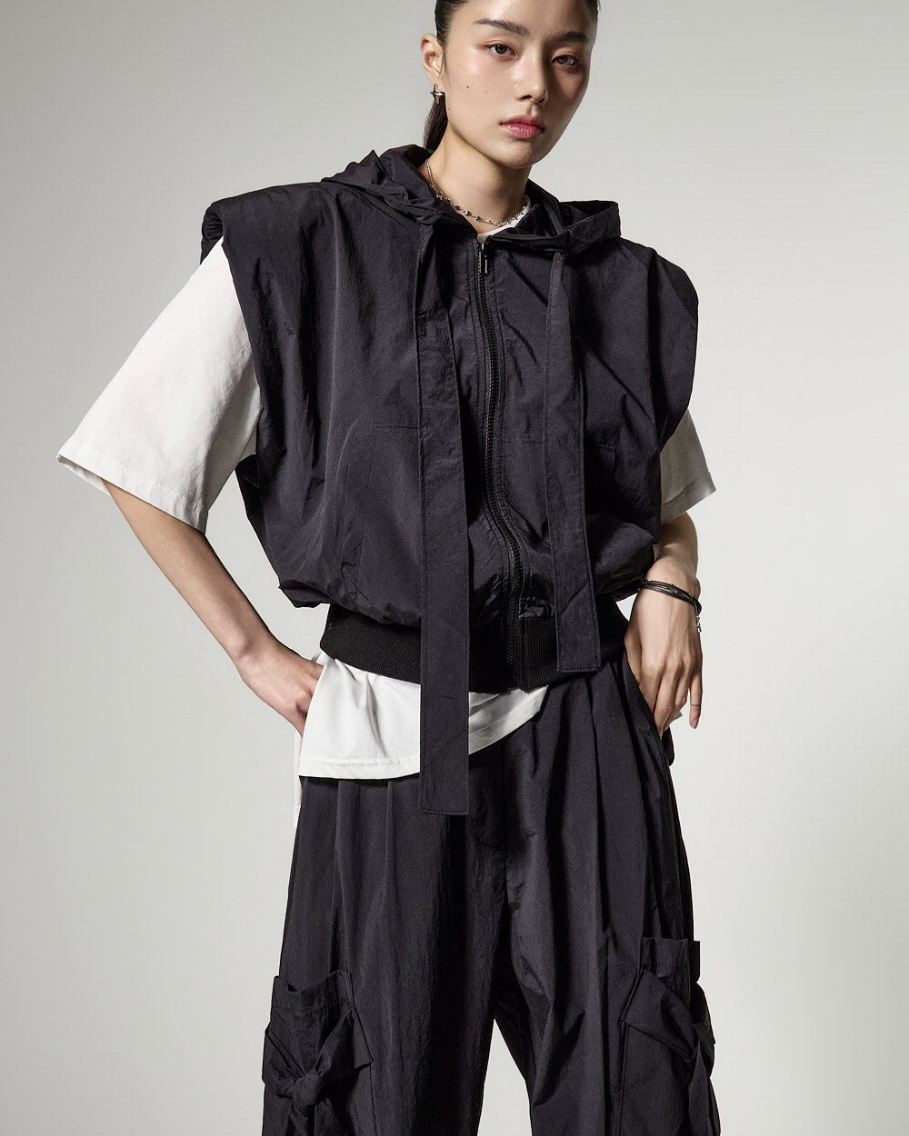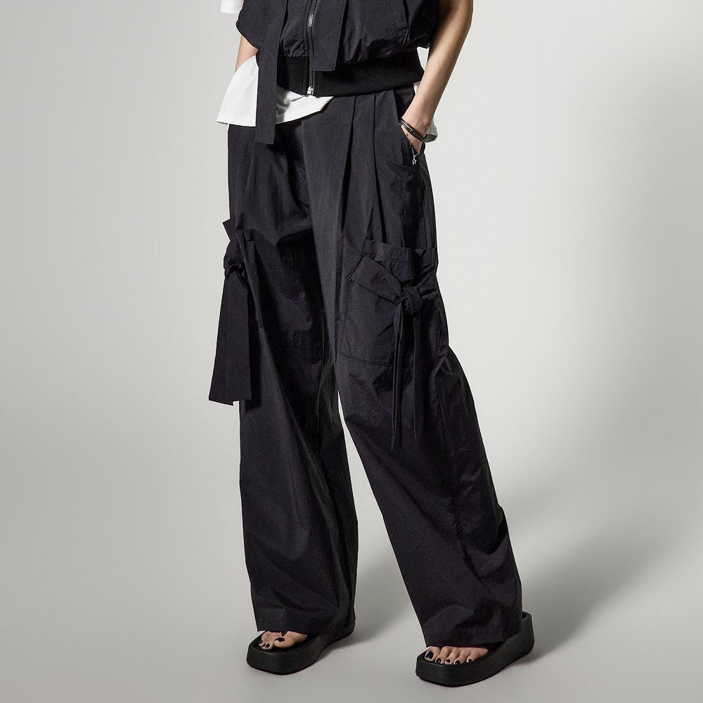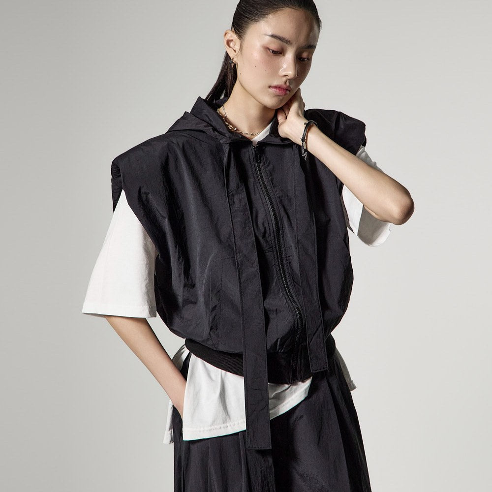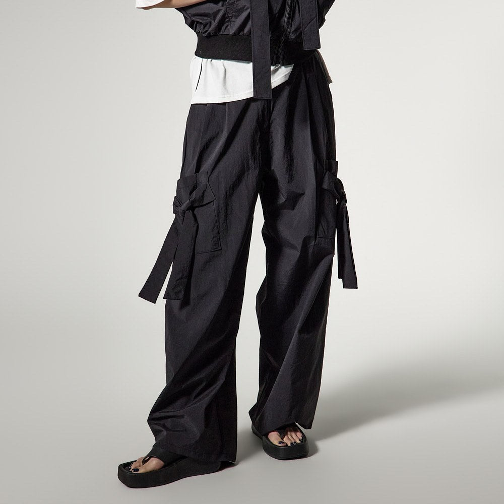 The button closure ensures a secure fit, and the addition of side pockets and ribbon details completes a stylish yet unique look. When worn as a set, it creates a polished sporty look,