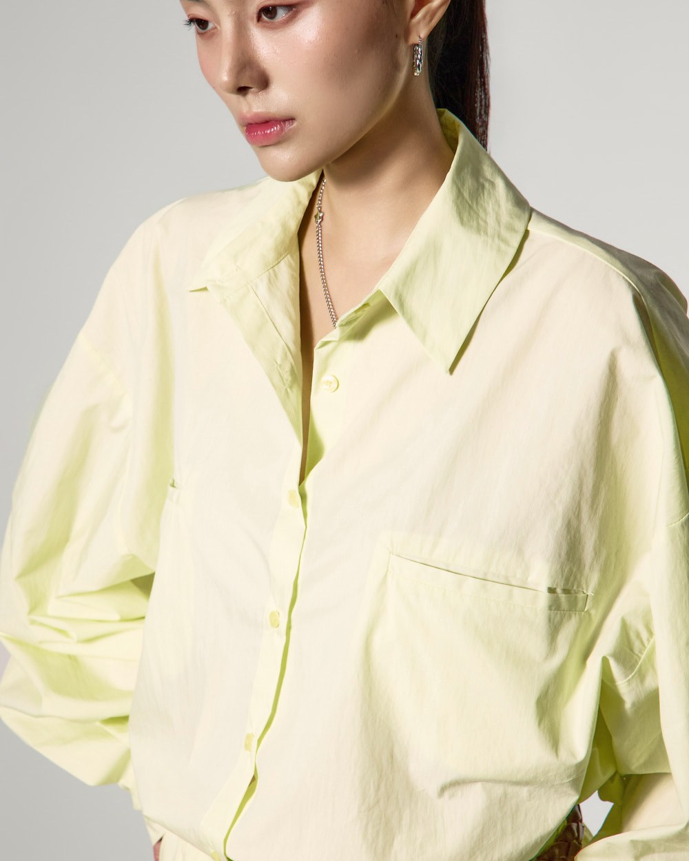 The shirt features a loose, oversized silhouette,