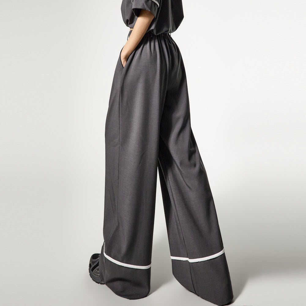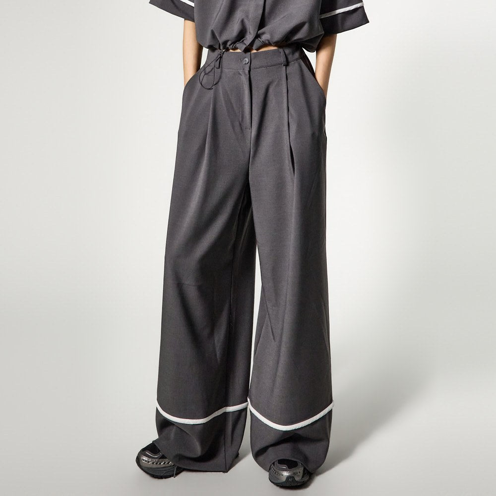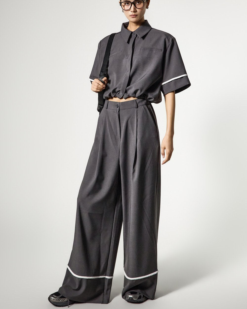 while the pants add a stylish touch with a relaxed fit and white line accents at the hem.