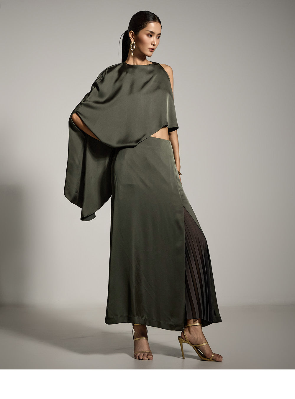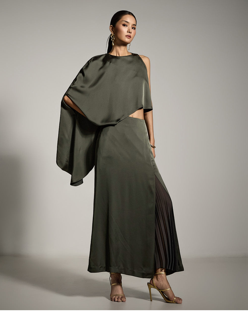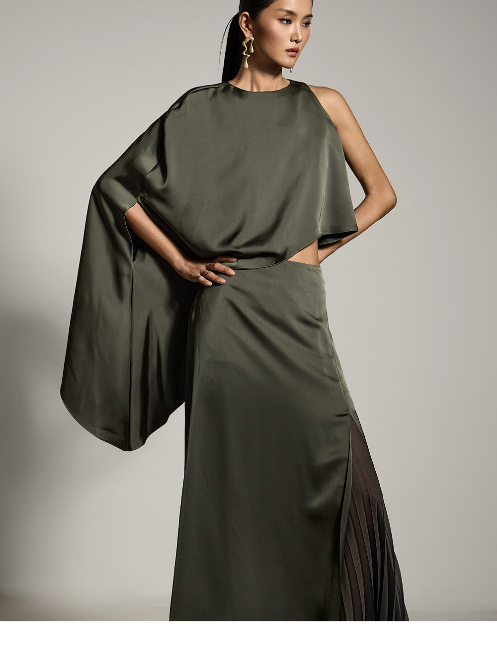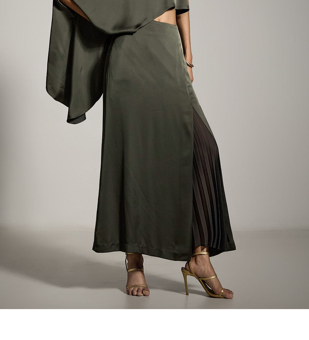 Model is 173cm tall, wearing top in ONE size and skirt in S, Khaki color.