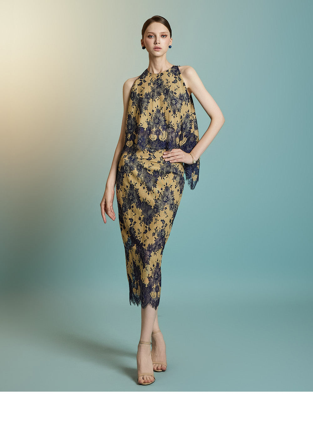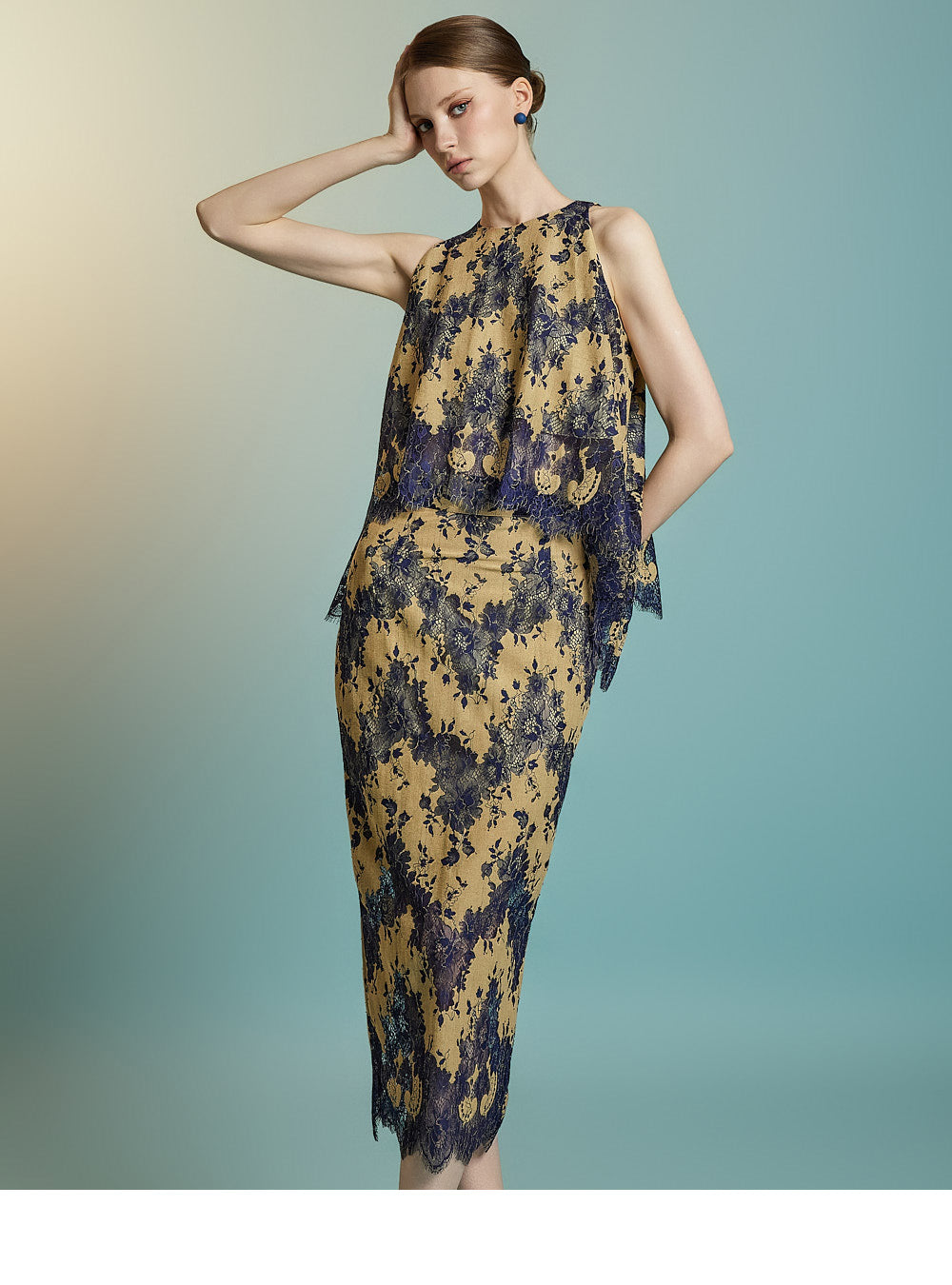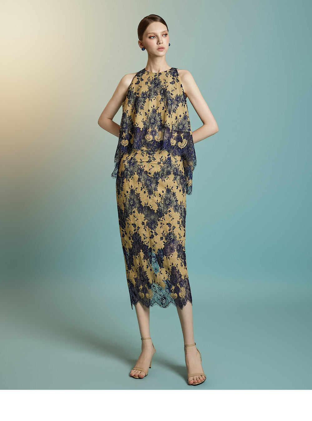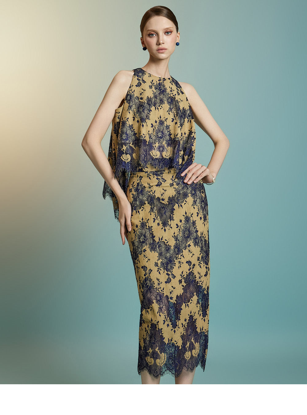 The subtle floral lace pattern on both the top and skirt creates a polished, sophisticated look.