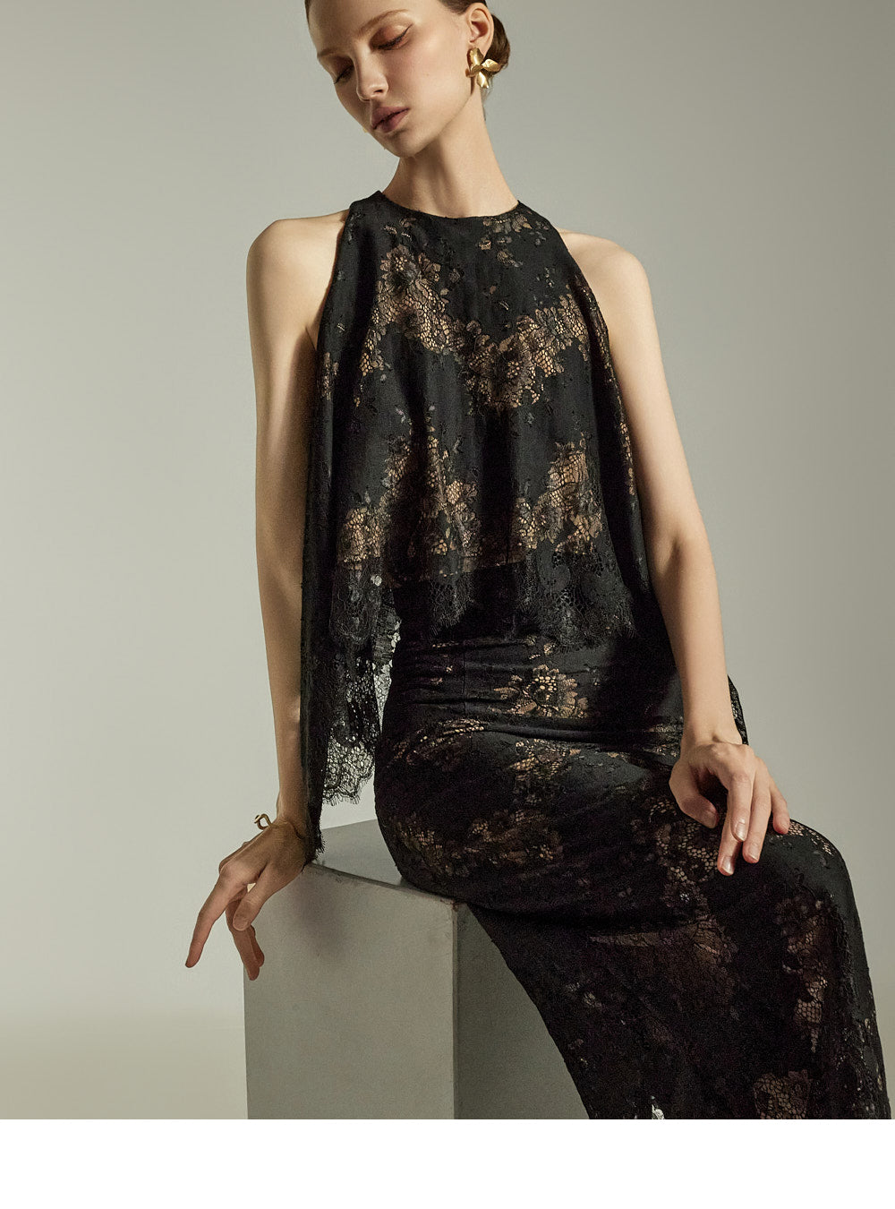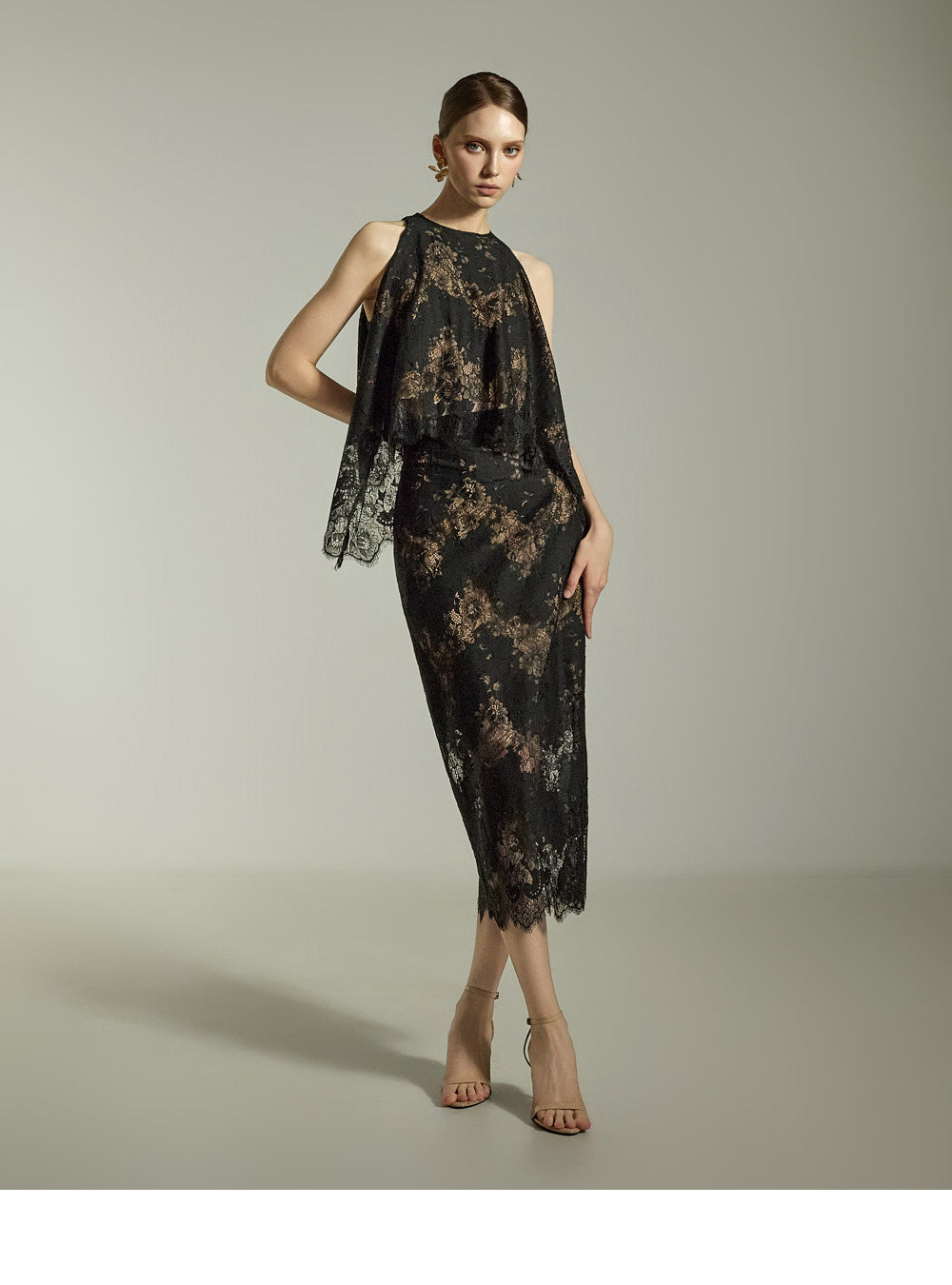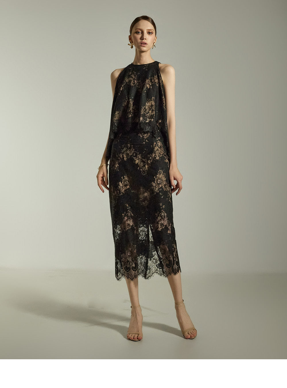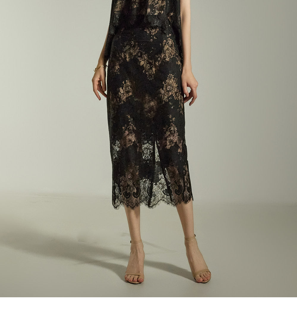 The subtle floral lace pattern on both the top and skirt creates a polished, sophisticated look.