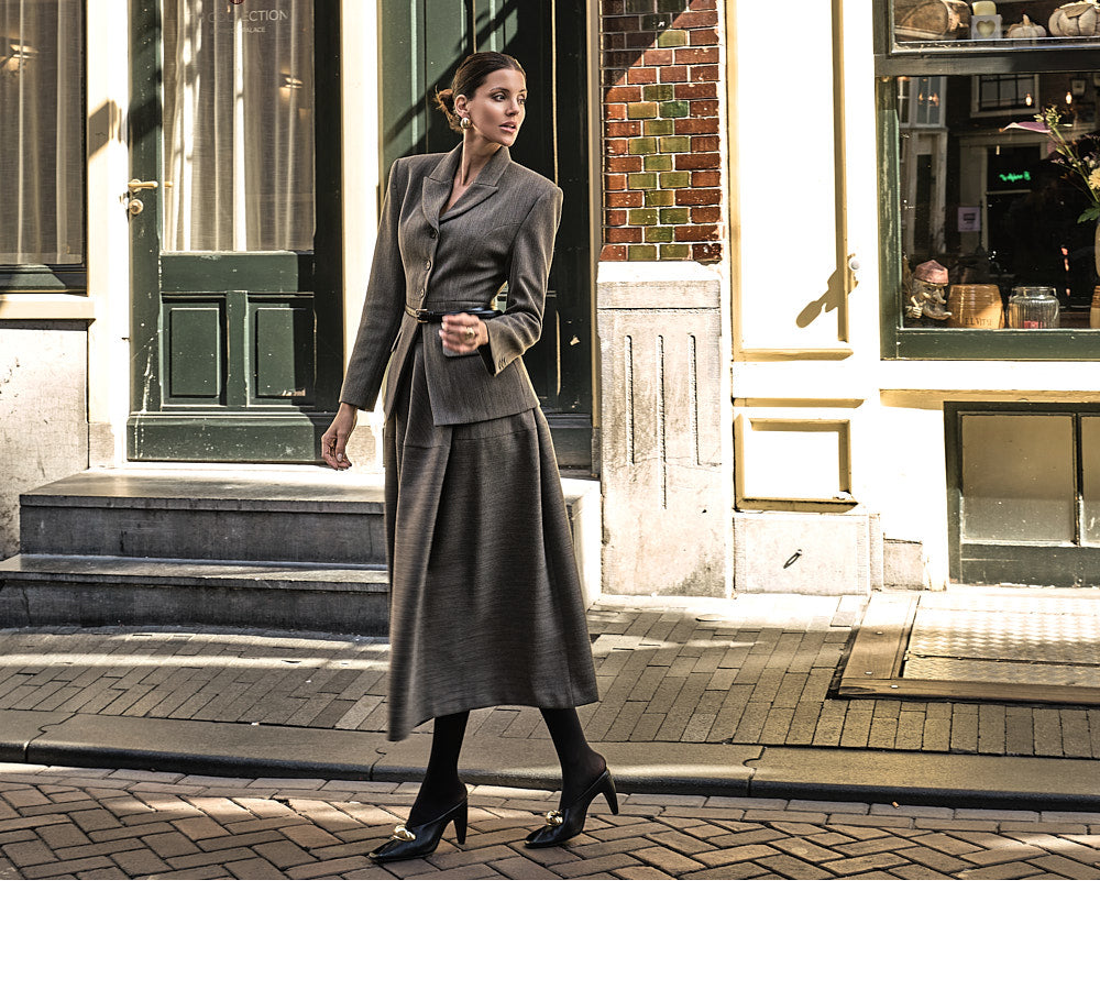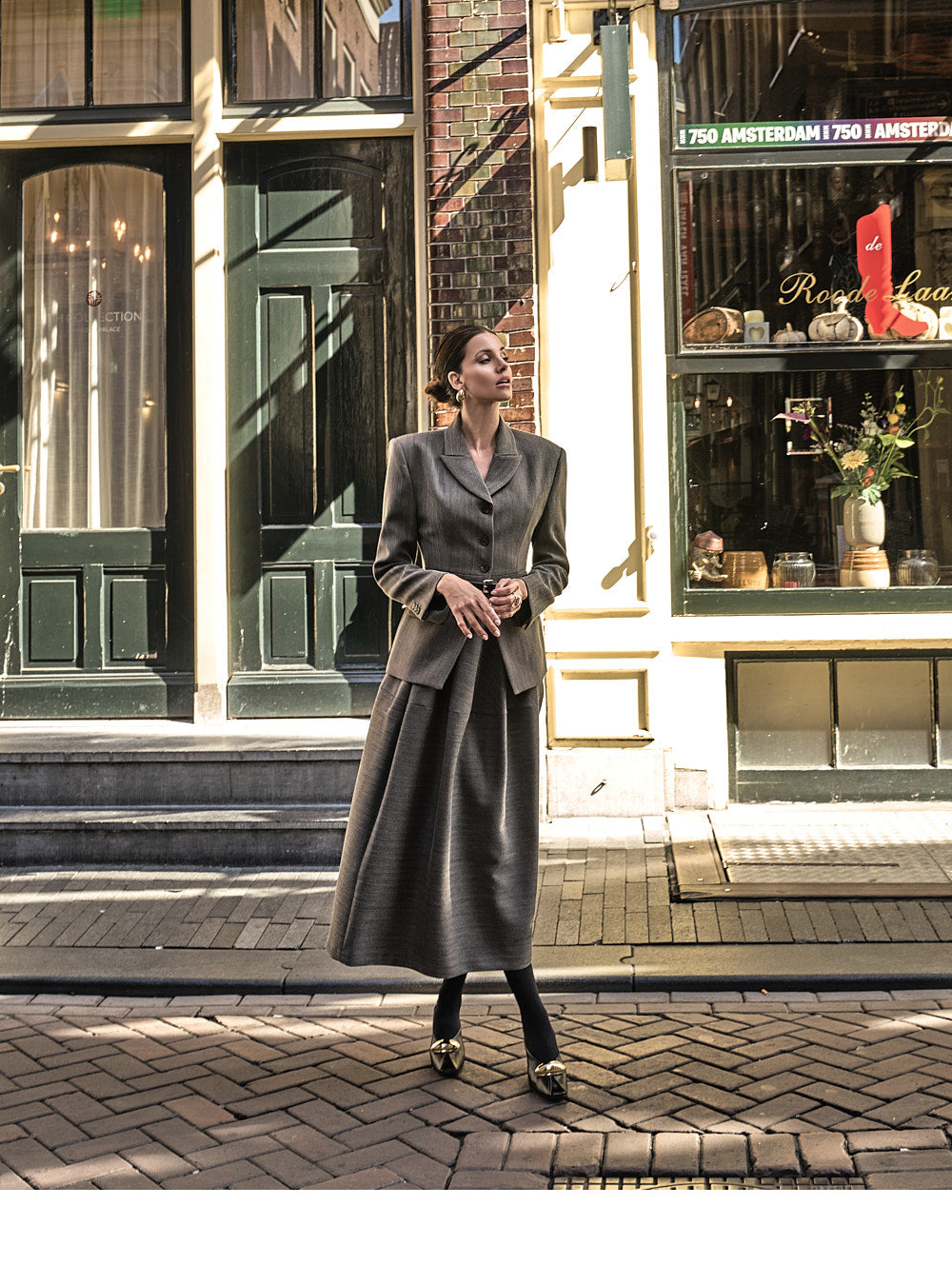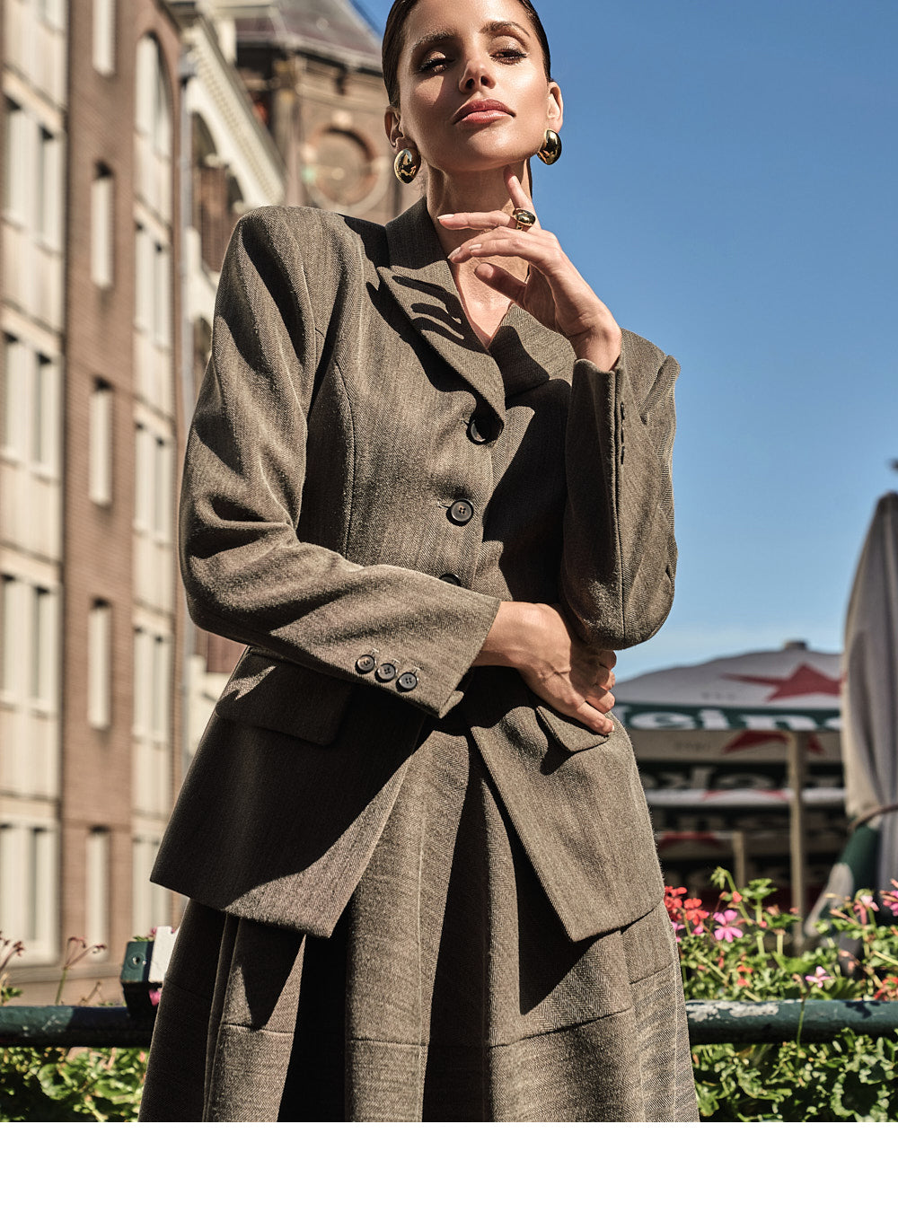 Both the jacket and skirt are crafted from a polyester, rayon, and