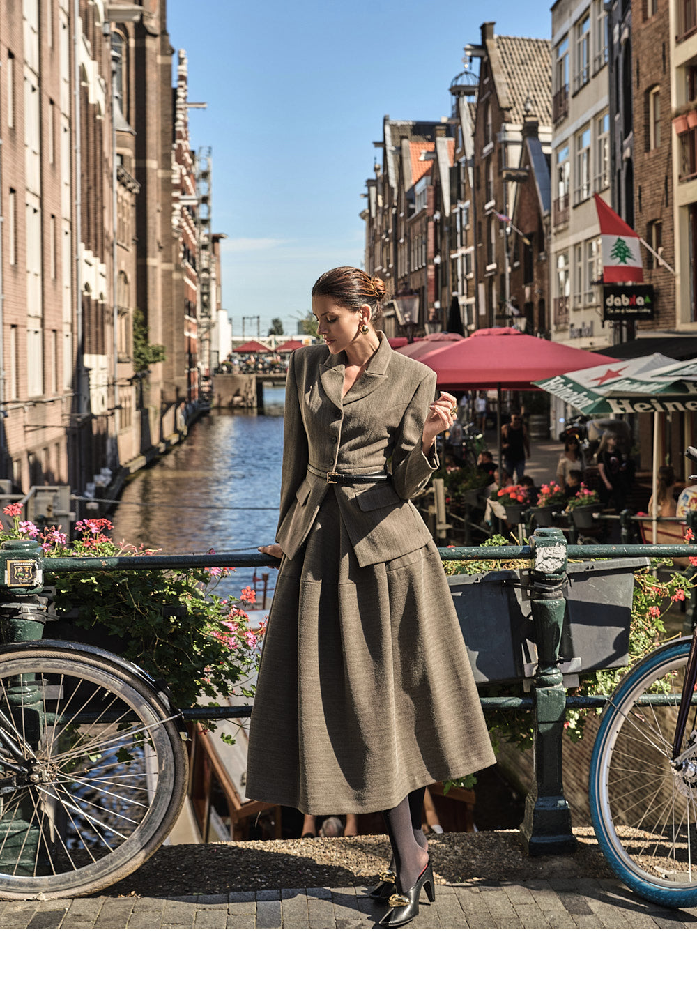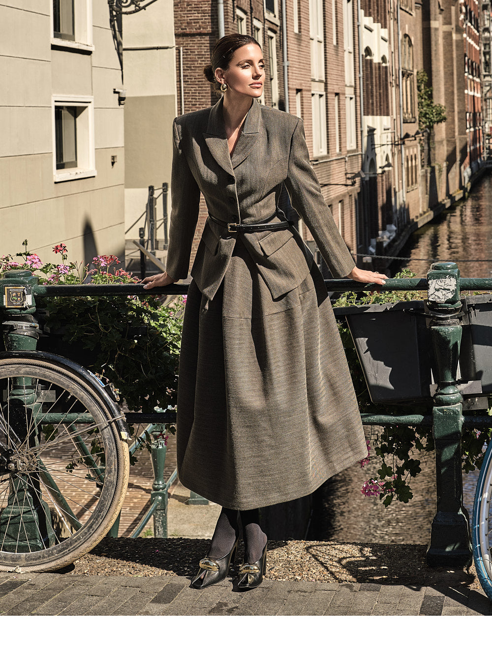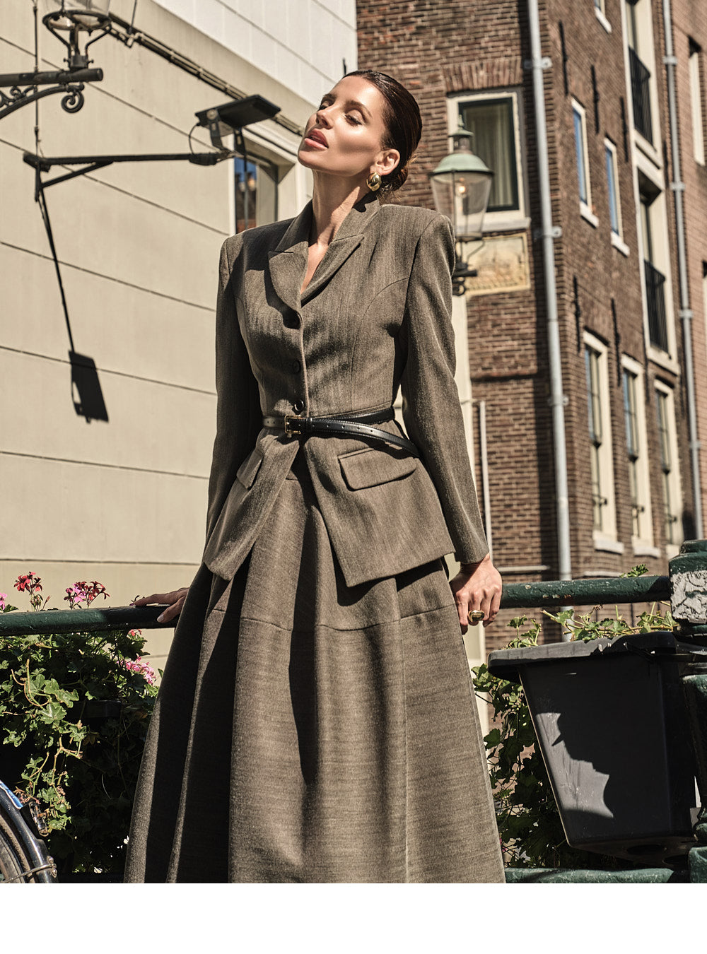 Both the jacket and skirt are crafted from a polyester, rayon, and