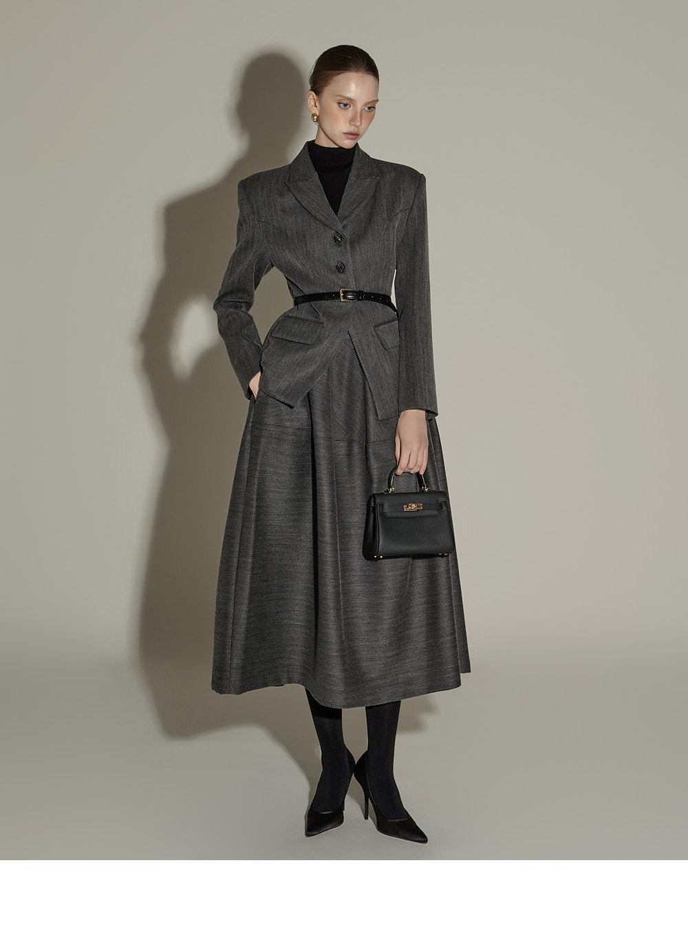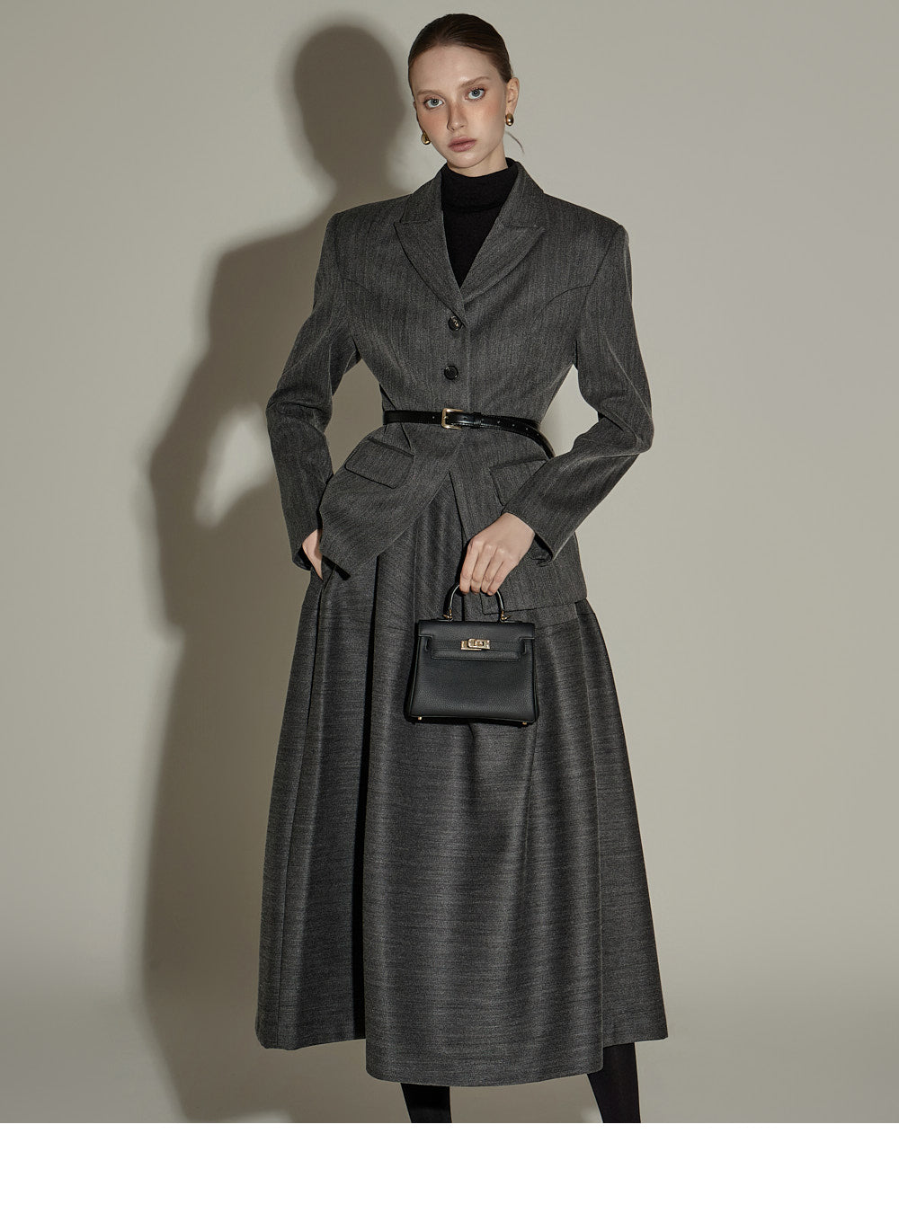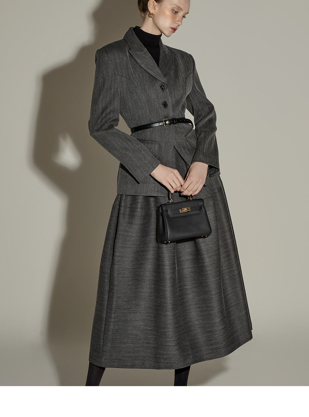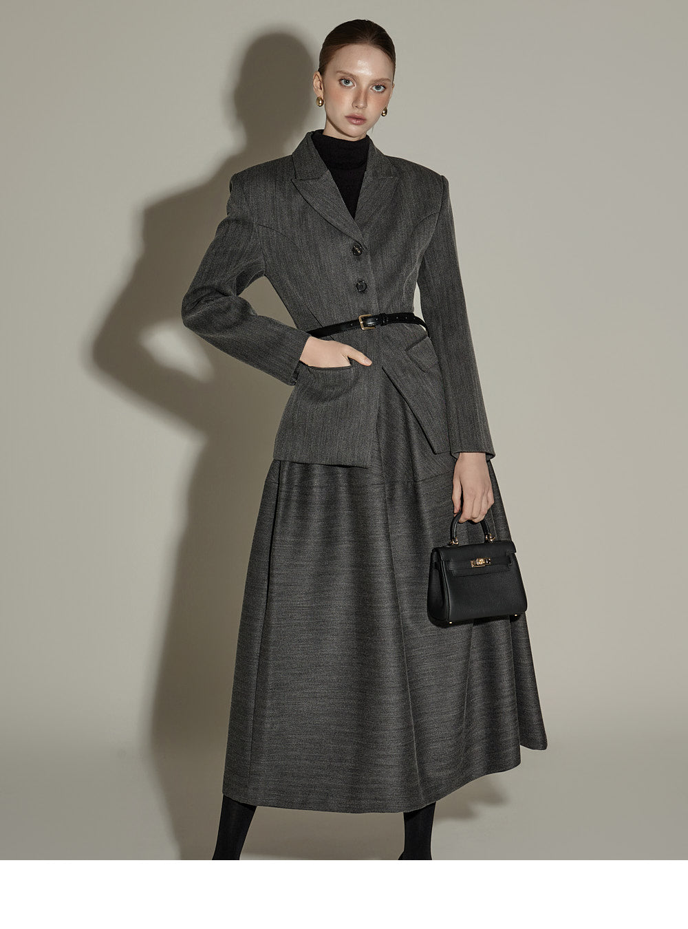 Both the jacket and skirt are crafted from a polyester, rayon, and