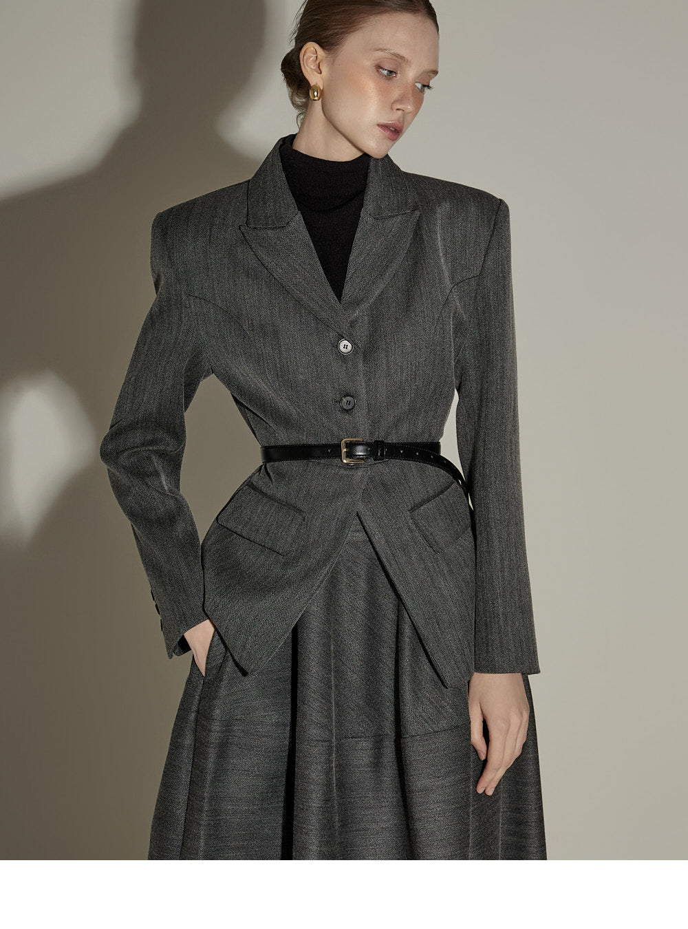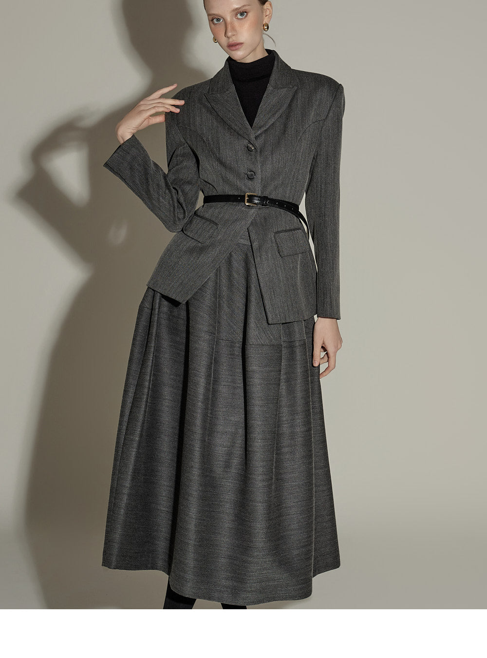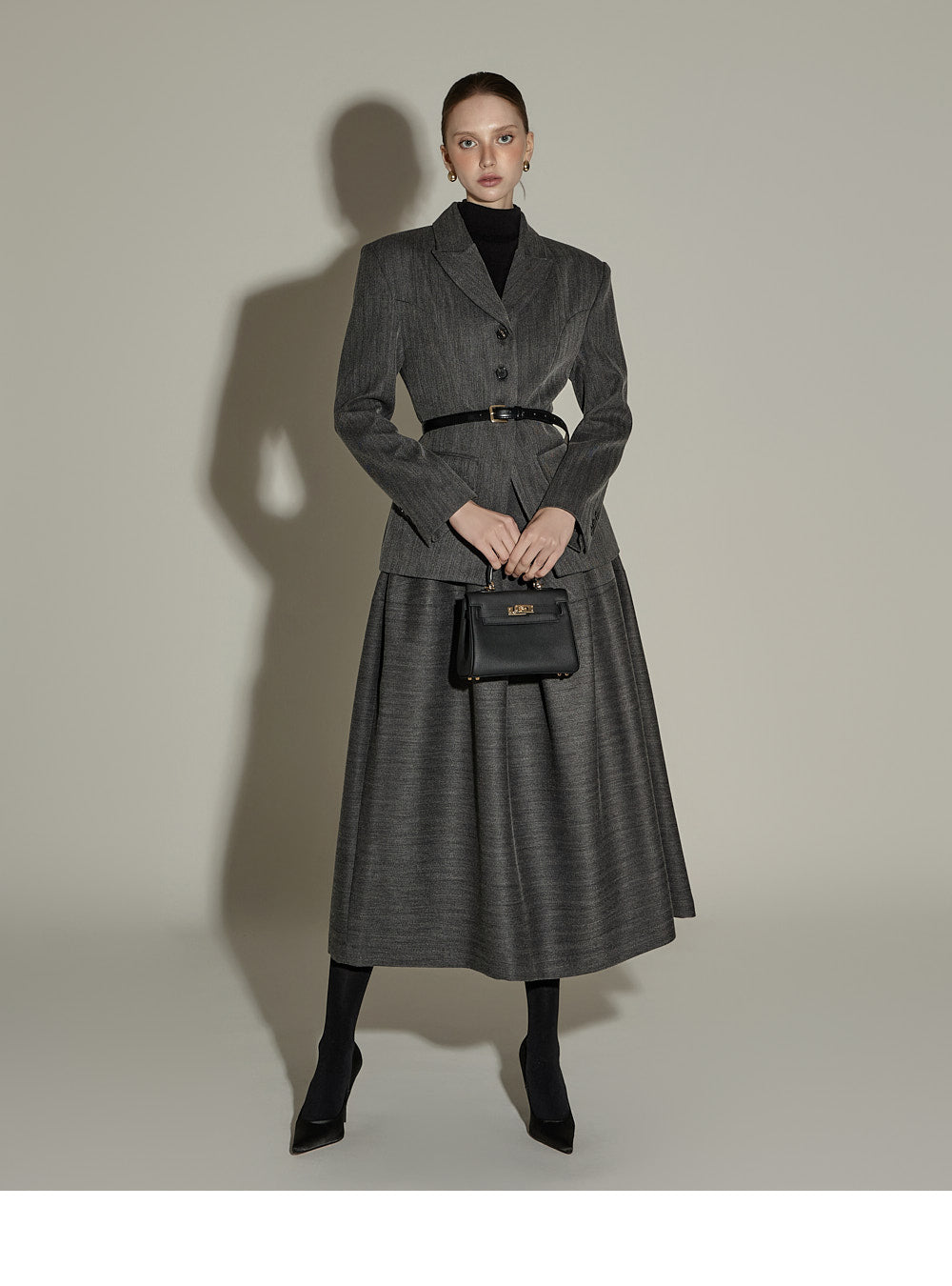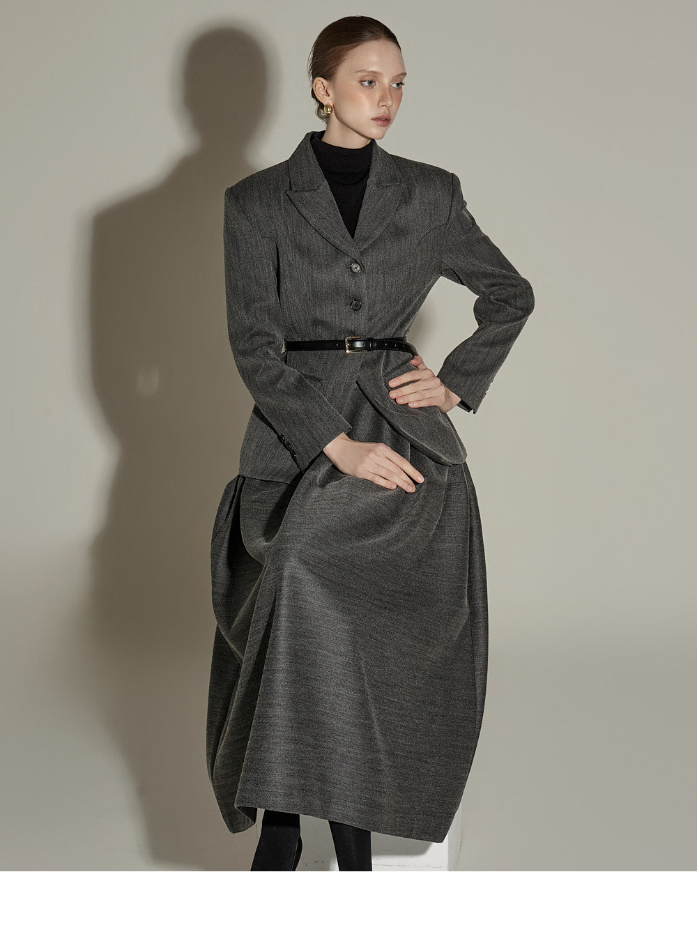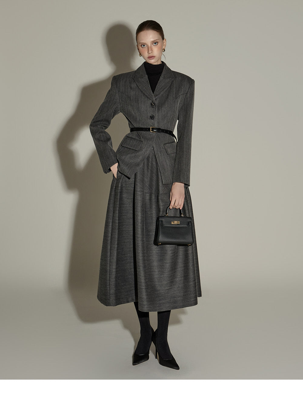 Both the jacket and skirt are crafted from a polyester, rayon, and
