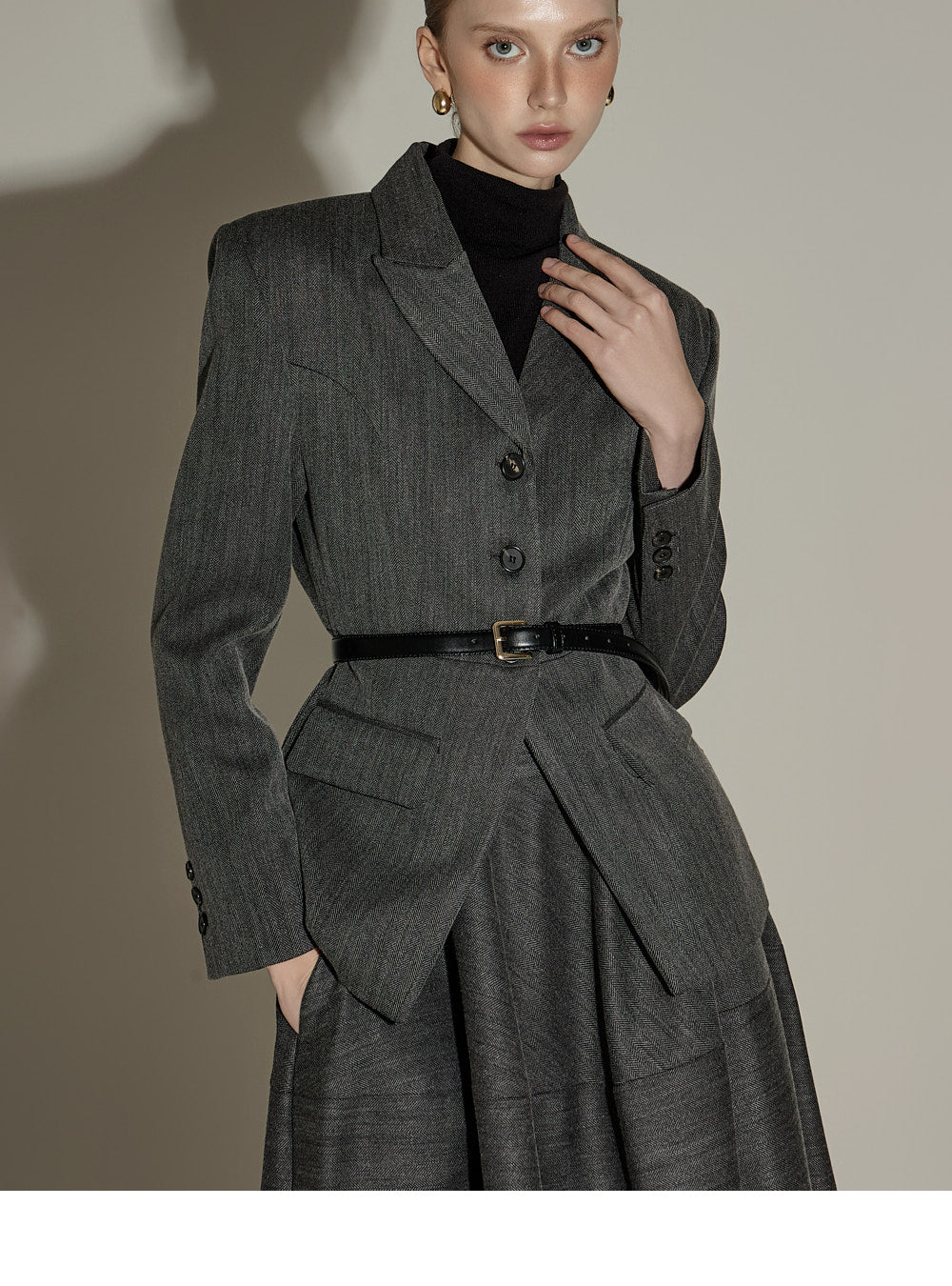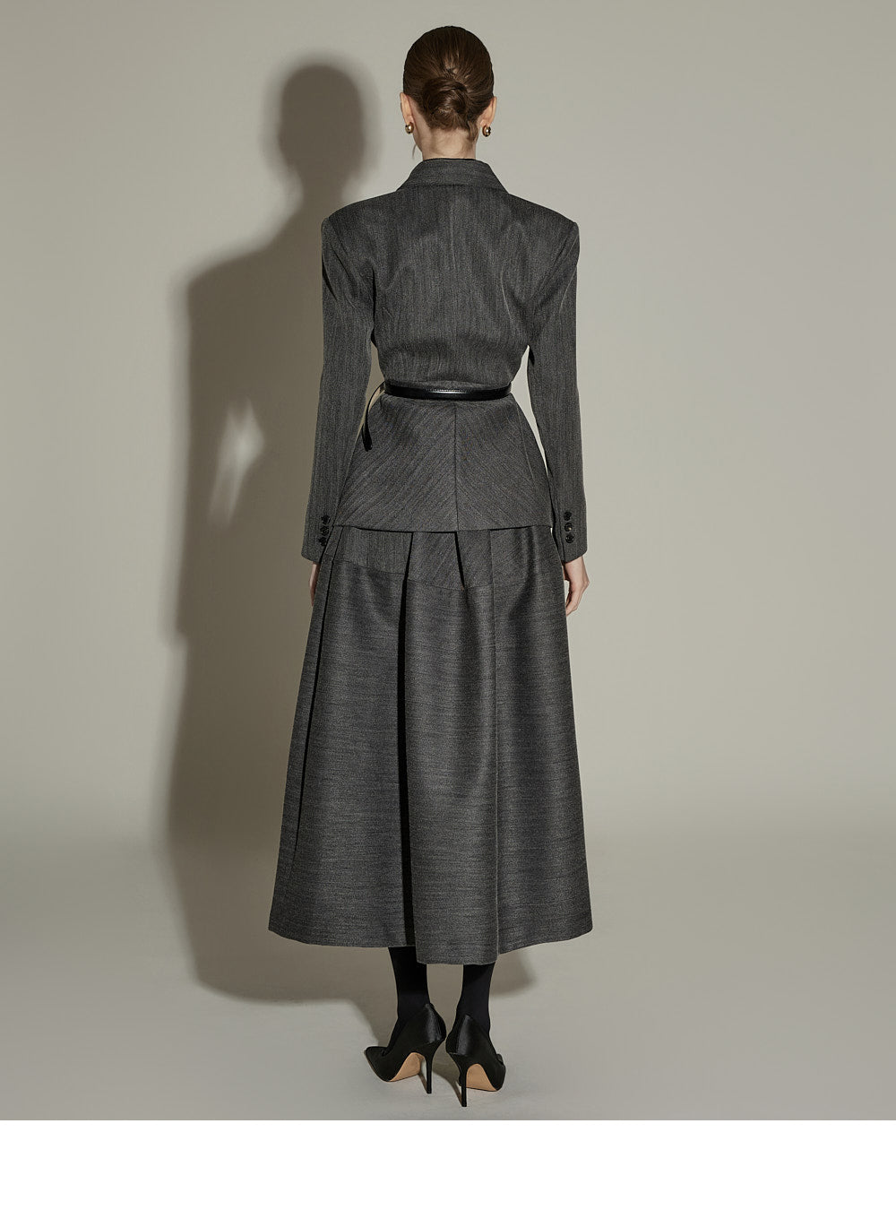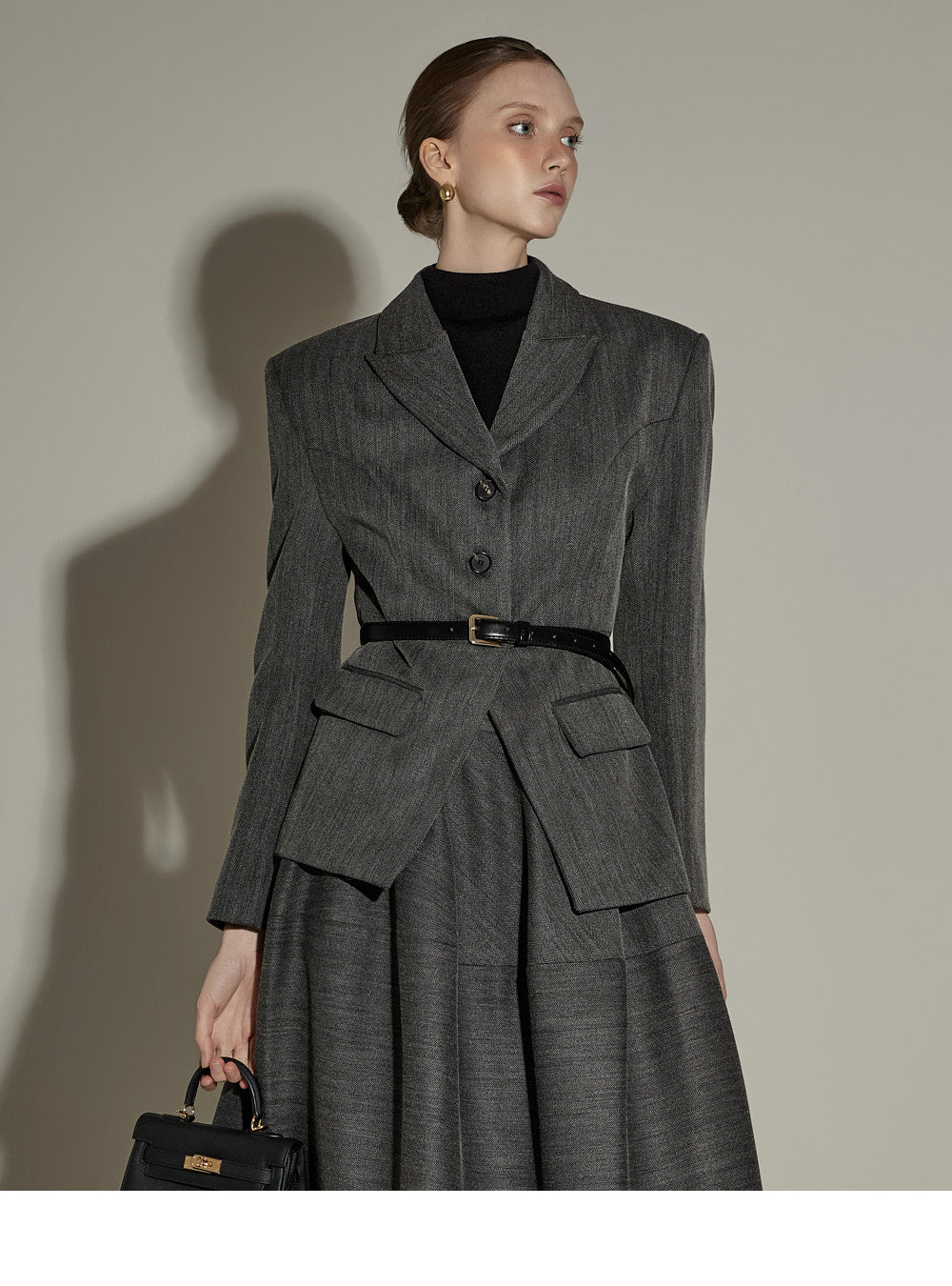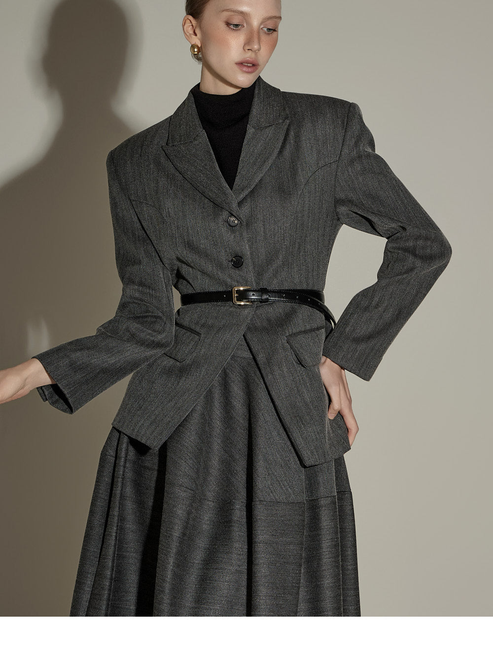 Both the jacket and skirt are crafted from a polyester, rayon, and