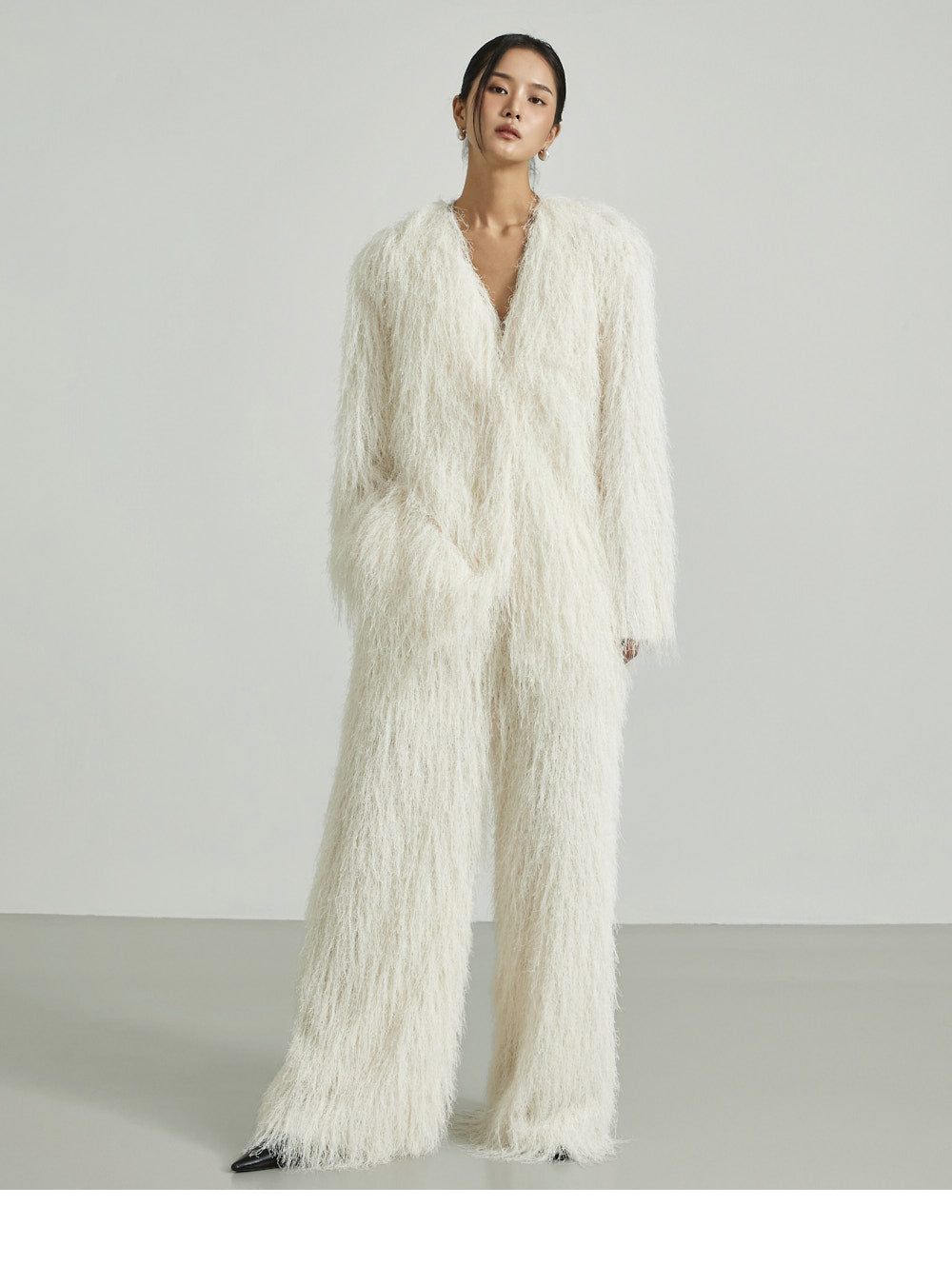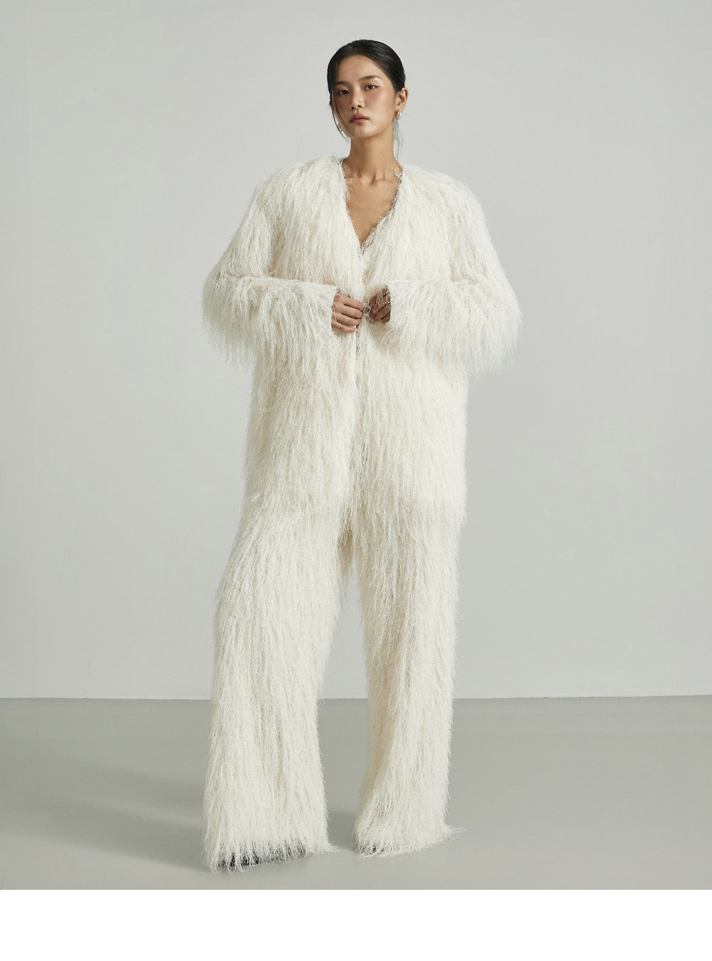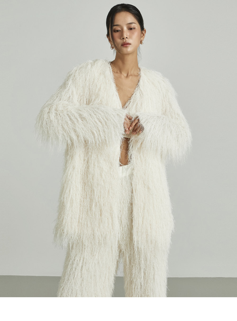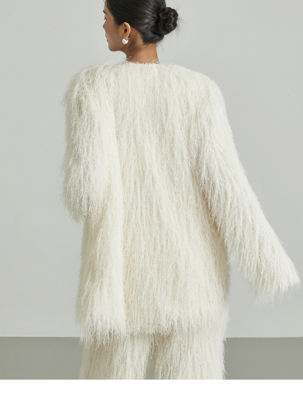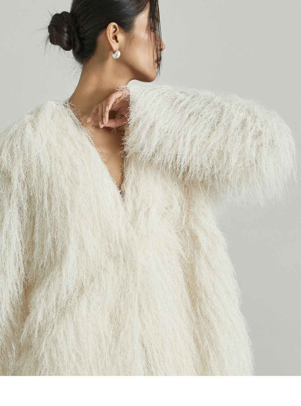 The jacket features a no-collar design and a naturally flowing, fluid silhouette.