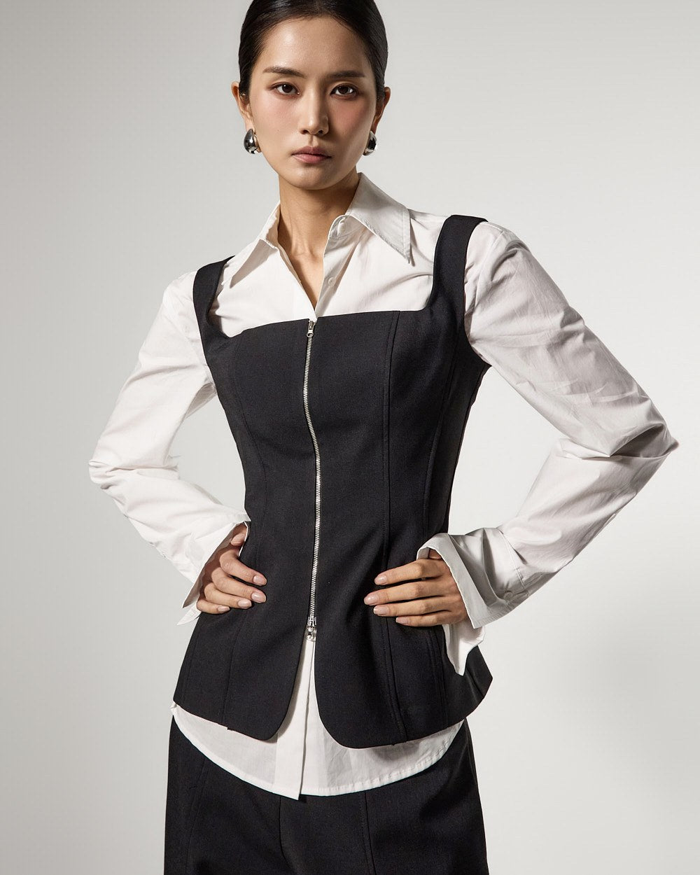 The sleeveless blouse features a square neckline and wide shoulder straps that provide stability to the shoulder line.