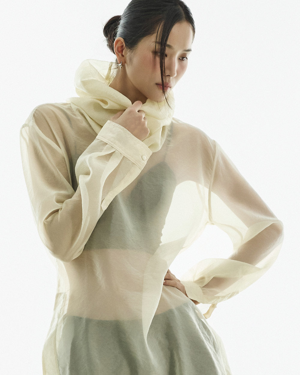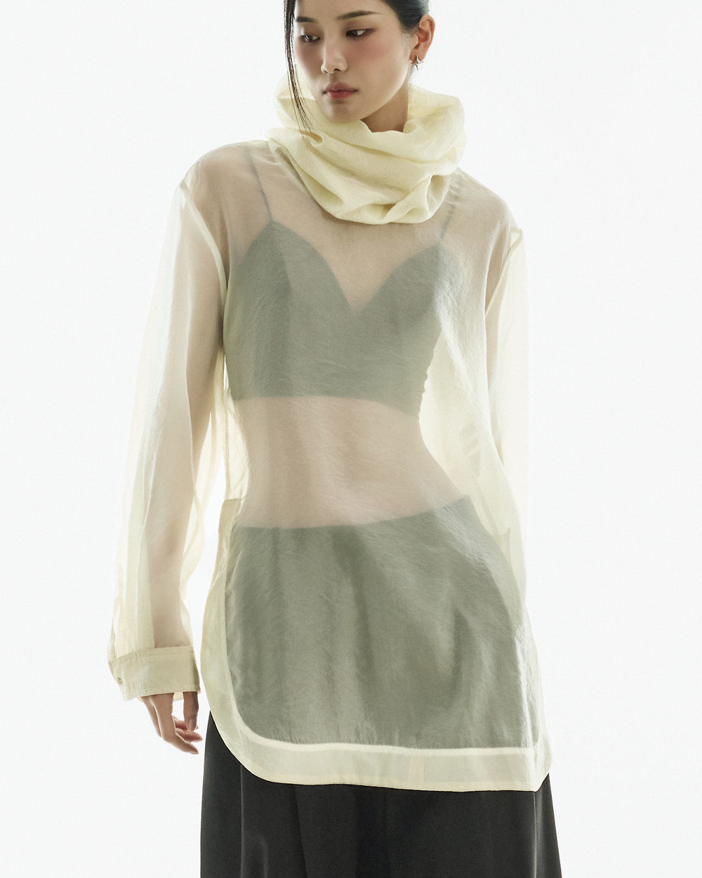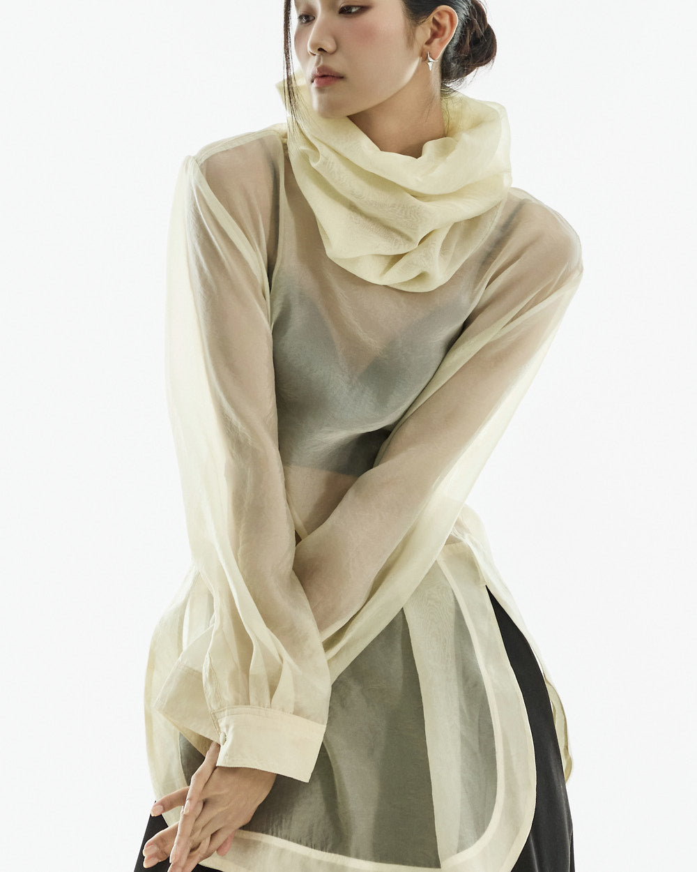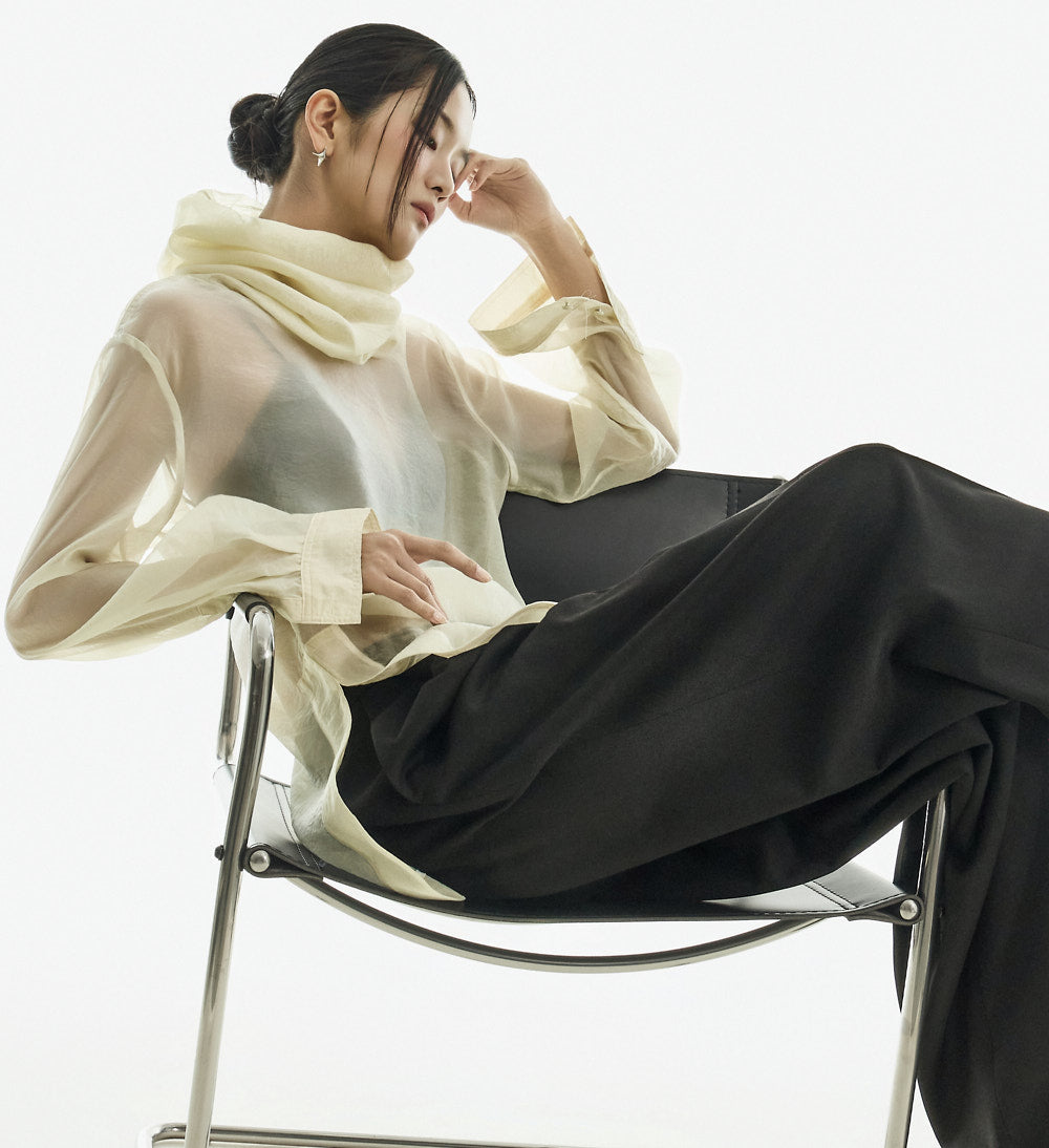 This high neck see-through blouse has a unique vibe.