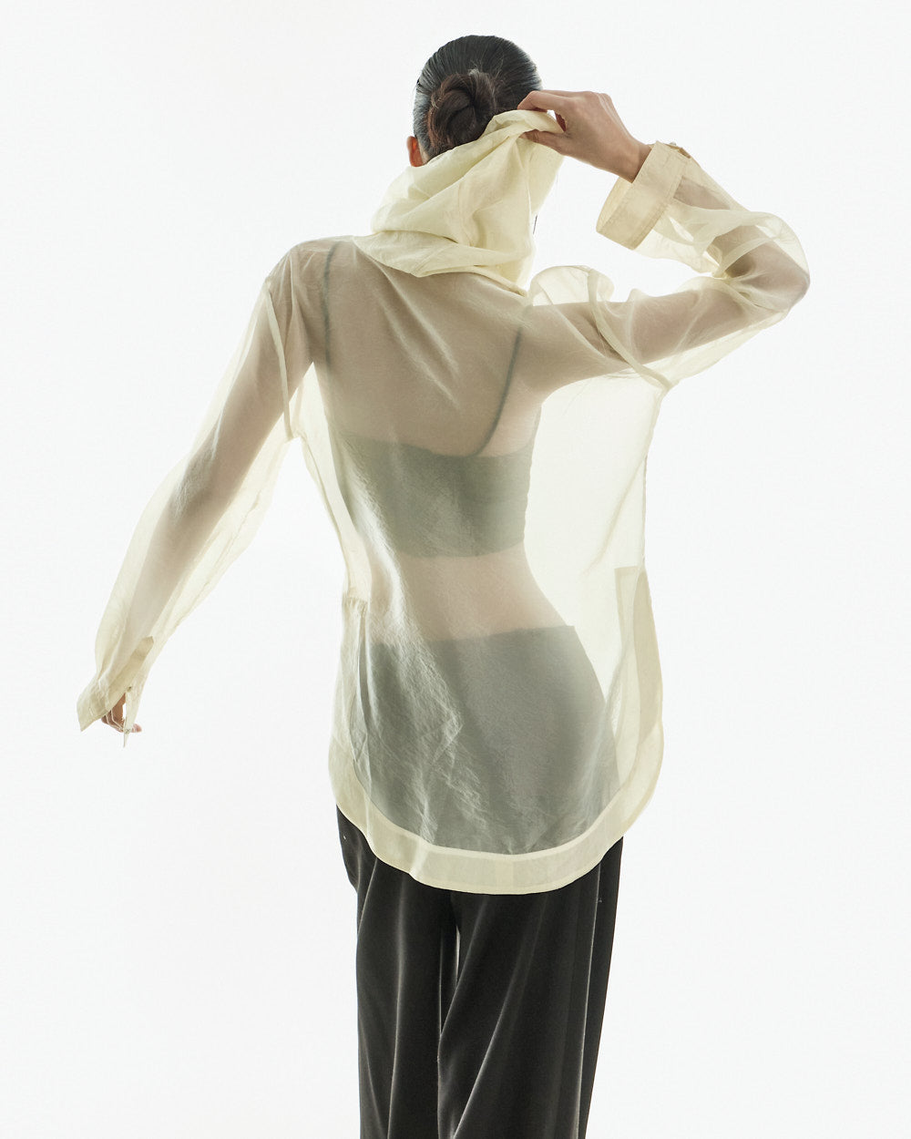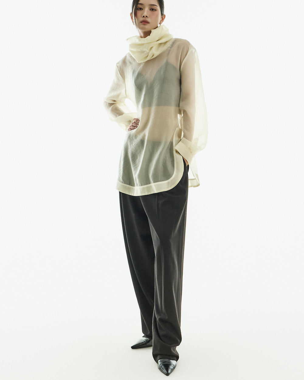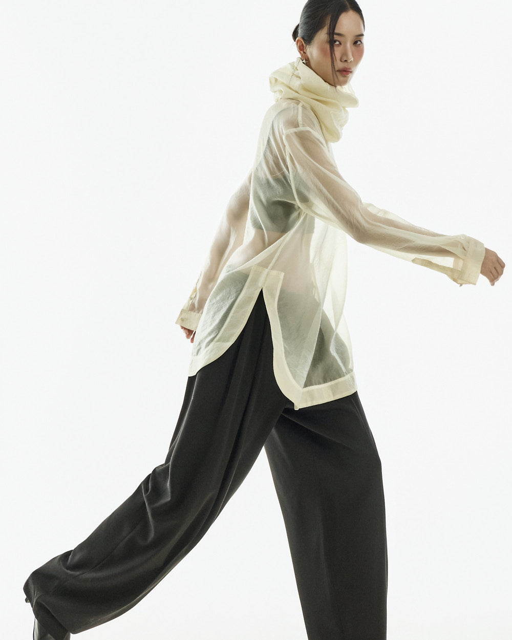 This high neck see-through blouse has a unique vibe.