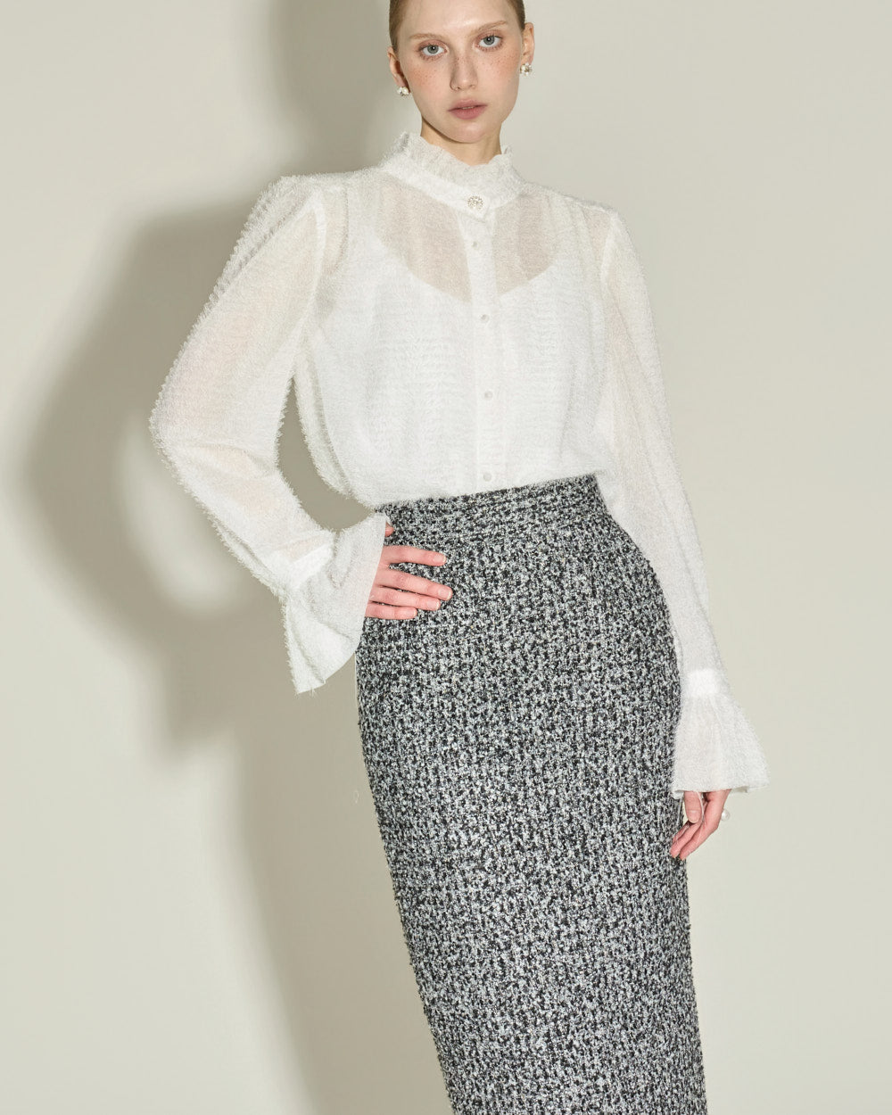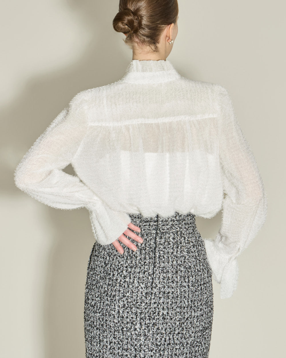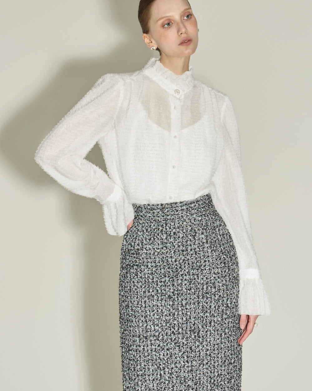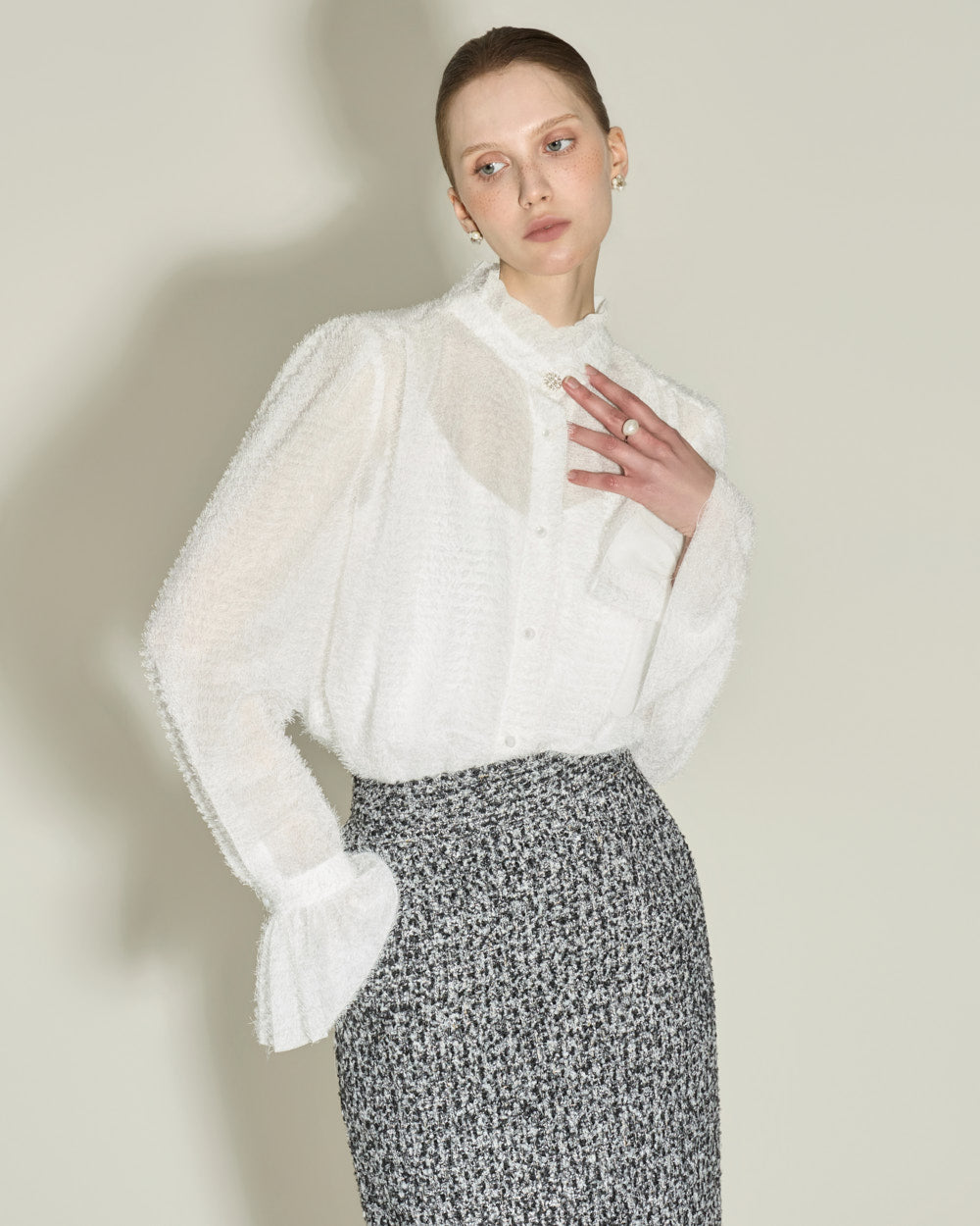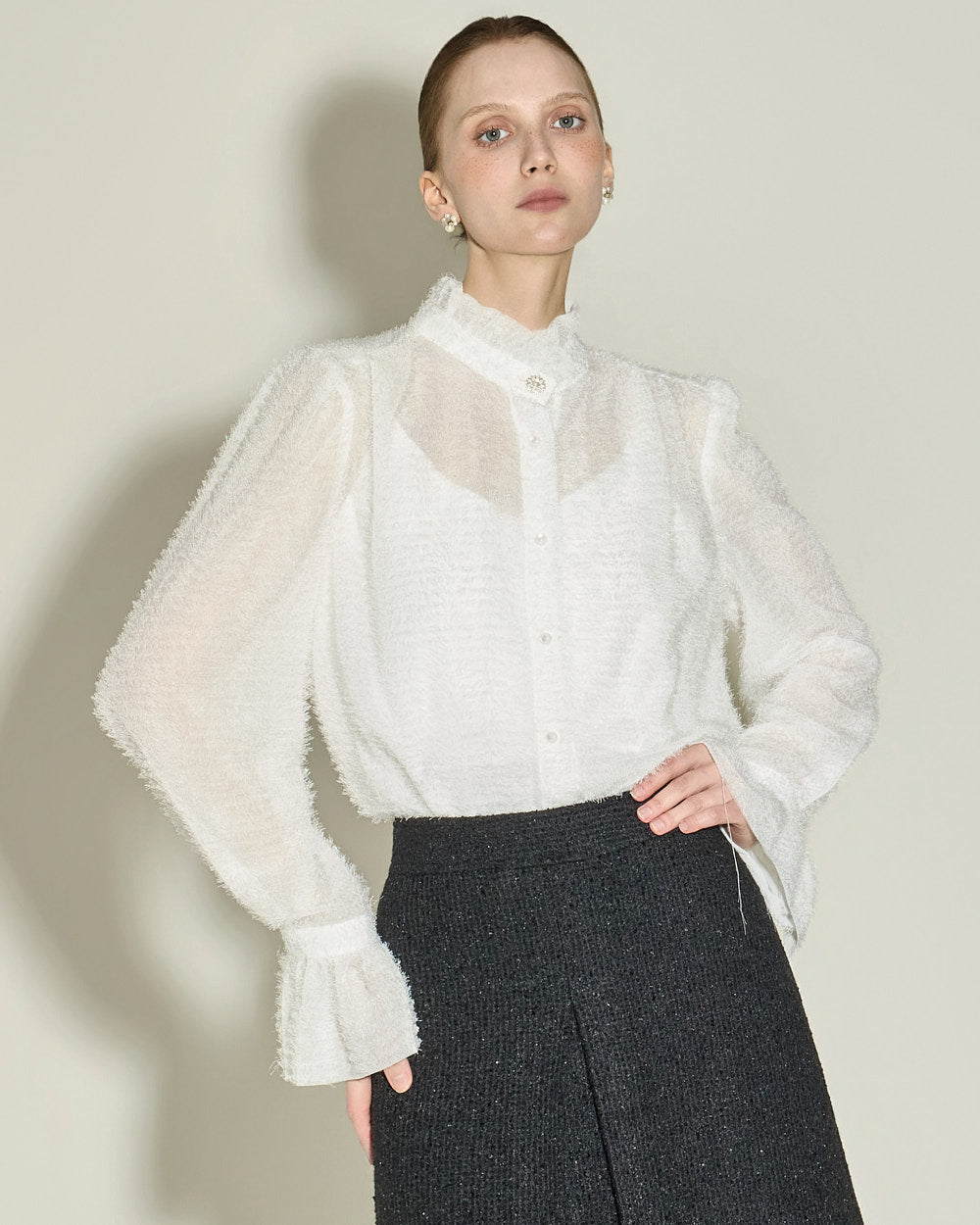 This elegant high-neck blouse features a frilled design.
