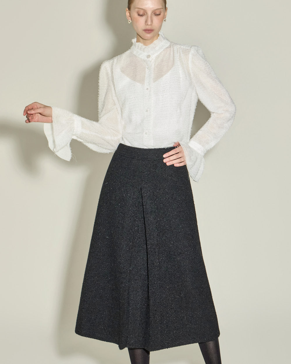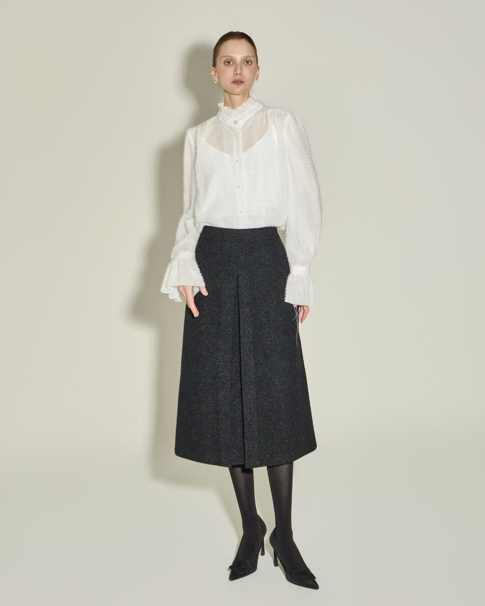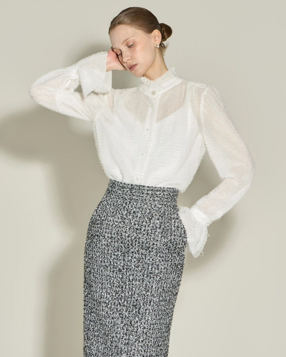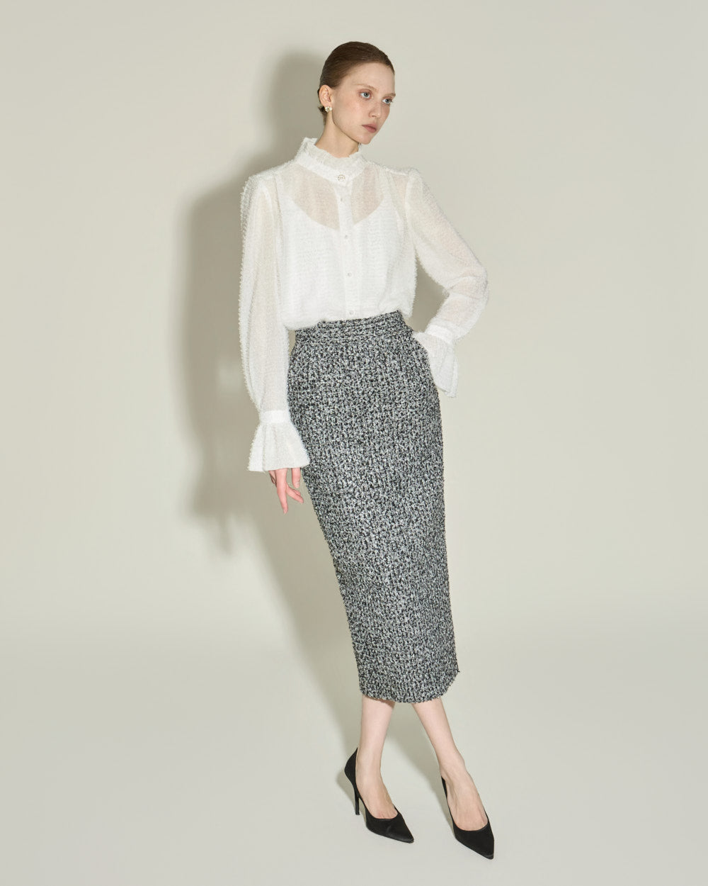 This elegant high-neck blouse features a frilled design.