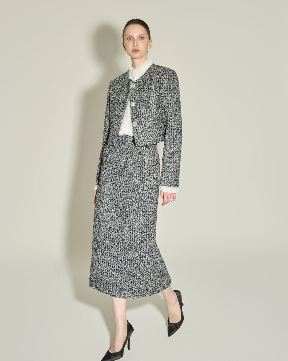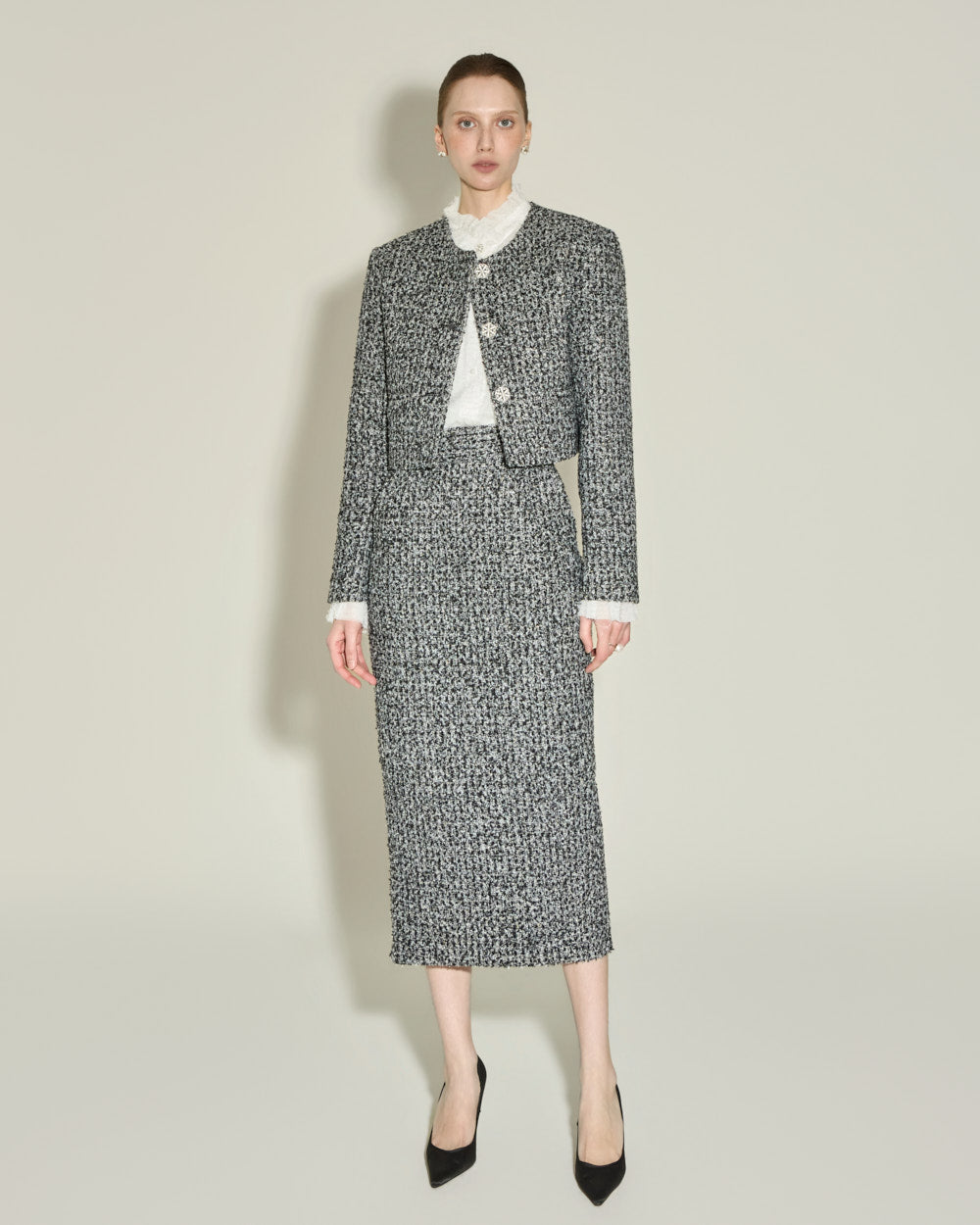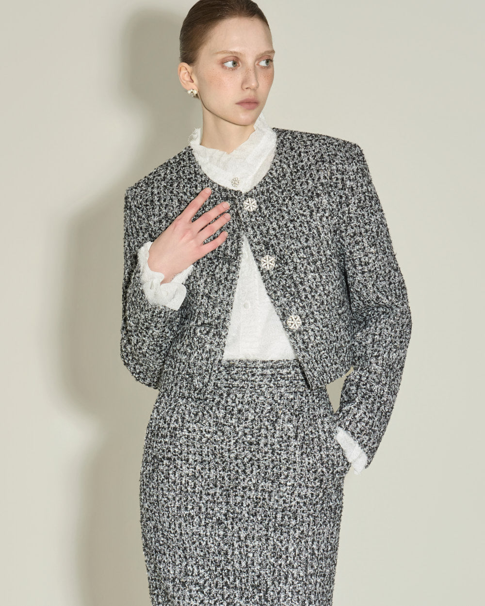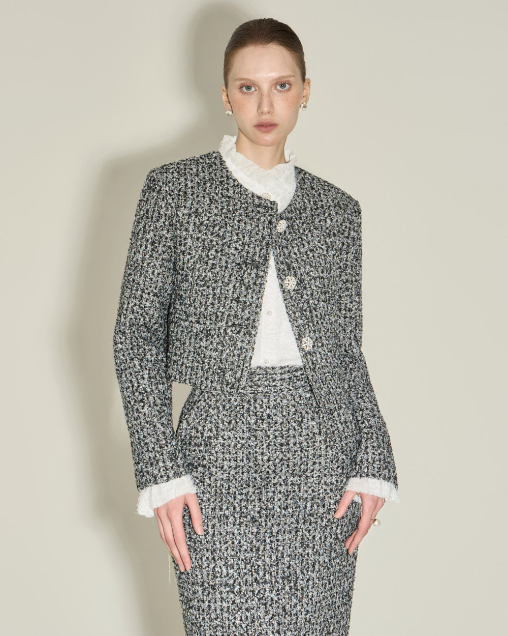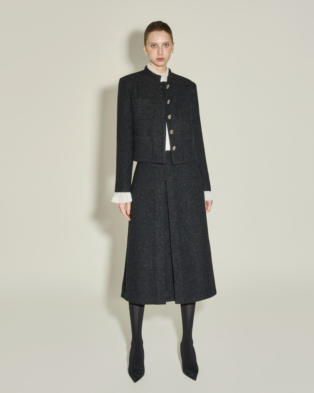 This elegant high-neck blouse features a frilled design.