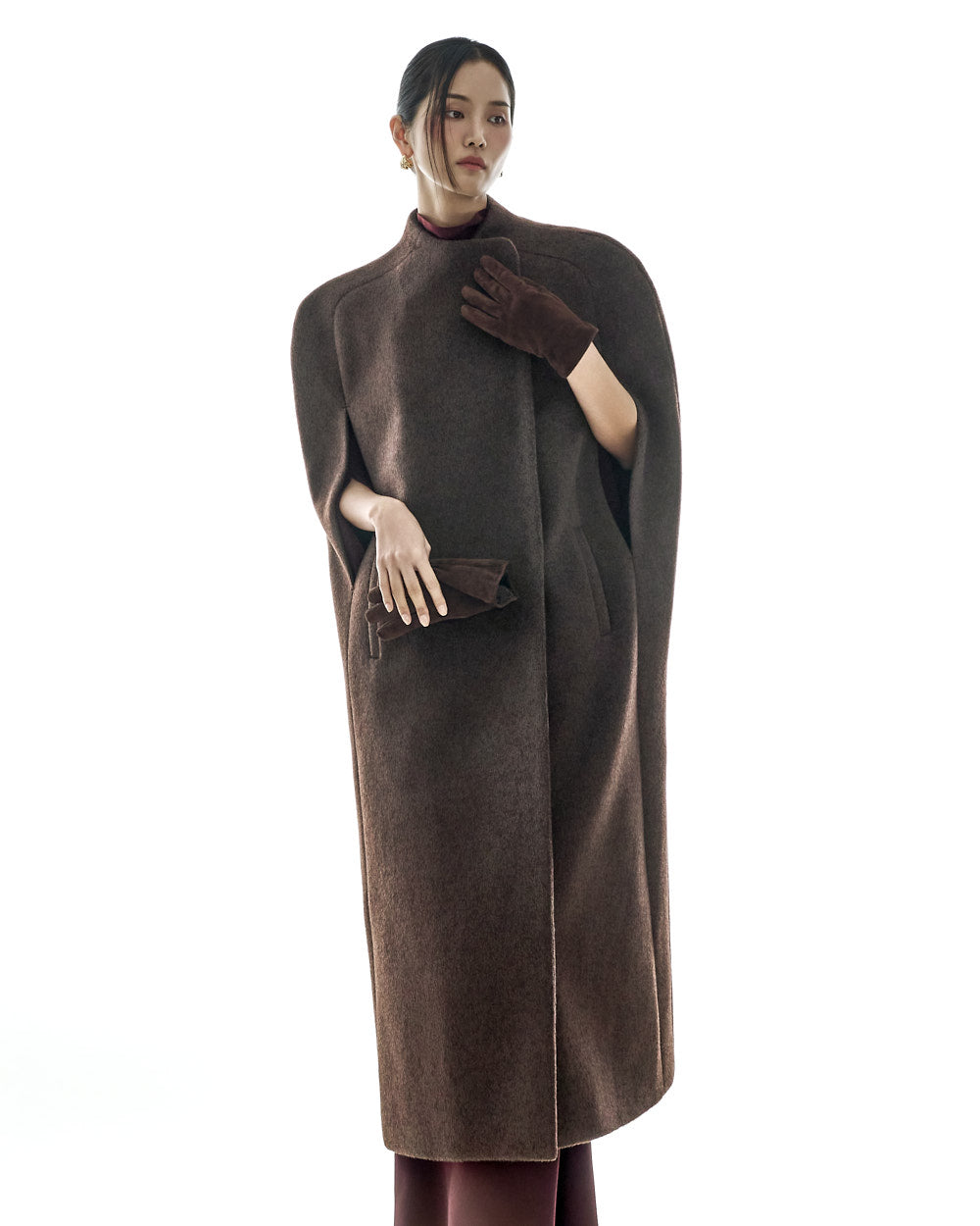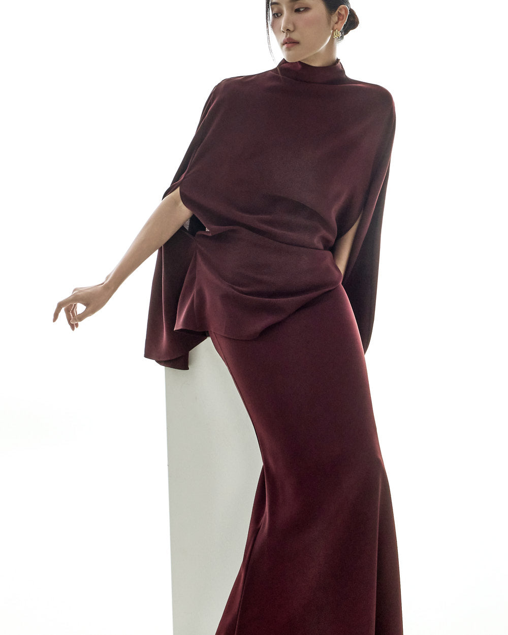 The 173cm model is wearing size one in the BURGUNDY color.