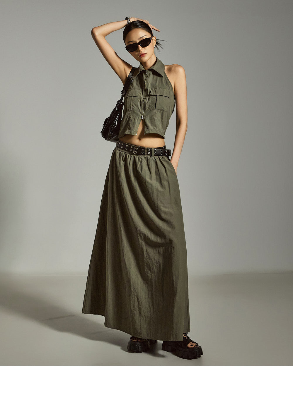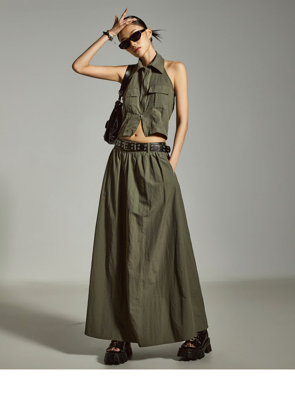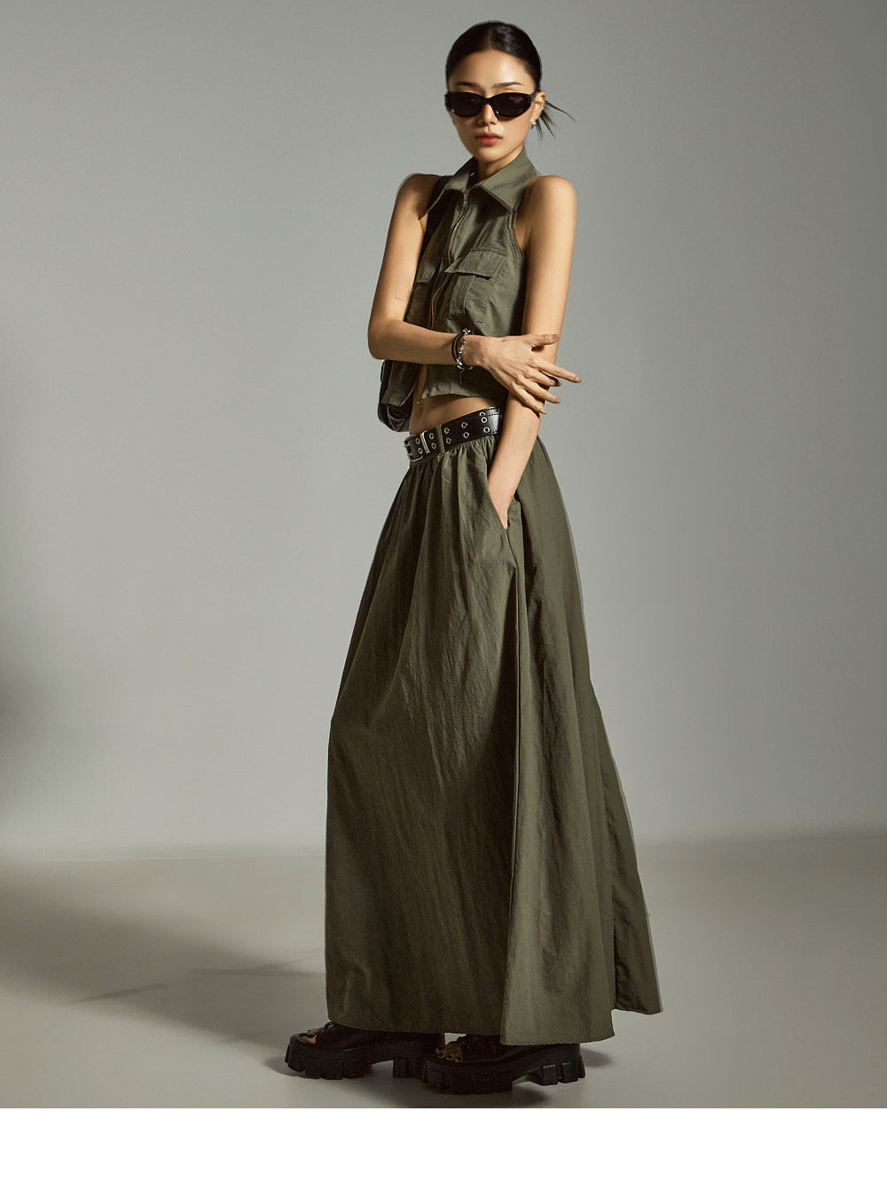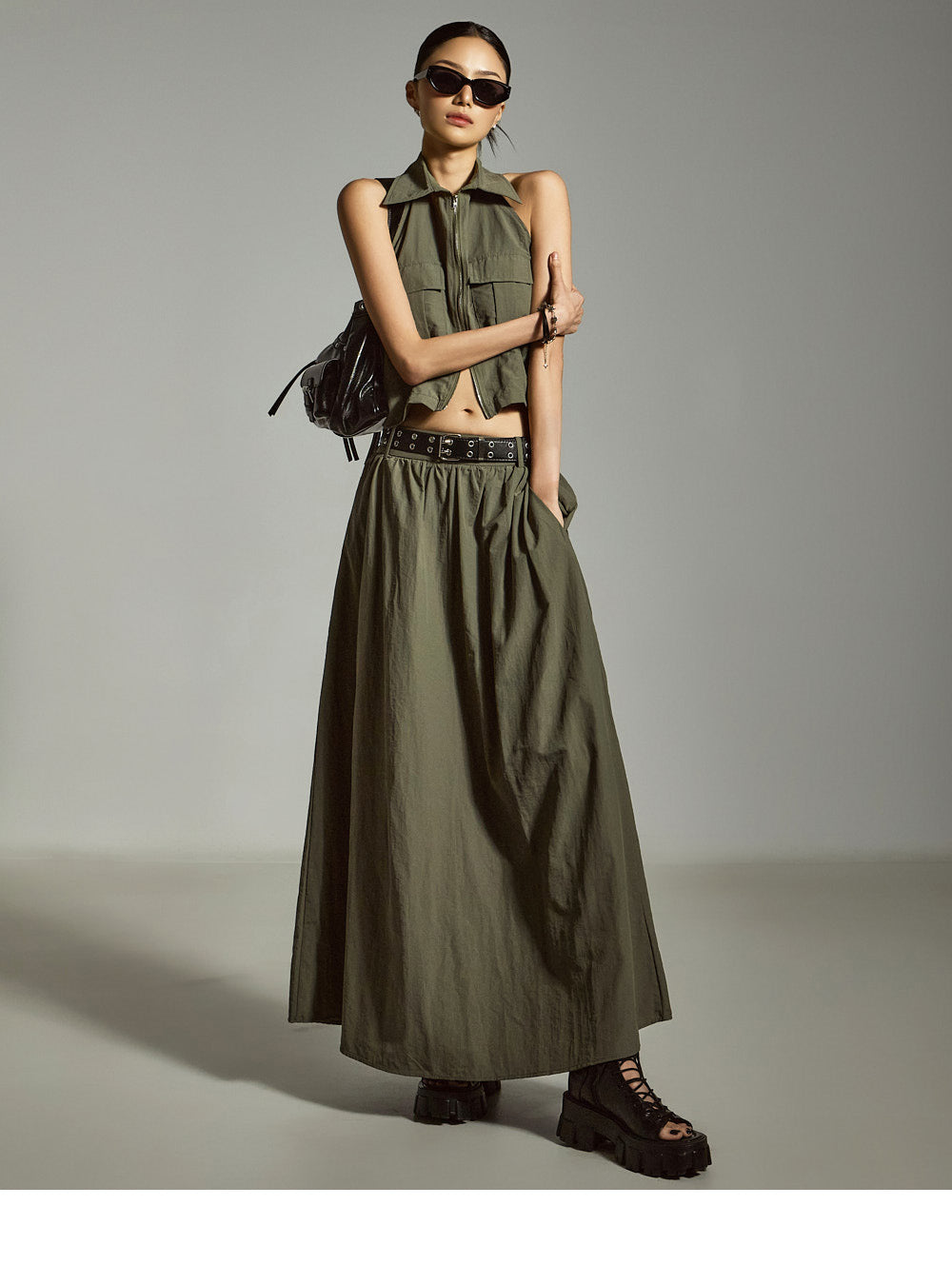 裙子采用 A 字形长款廓形,自然展开,
